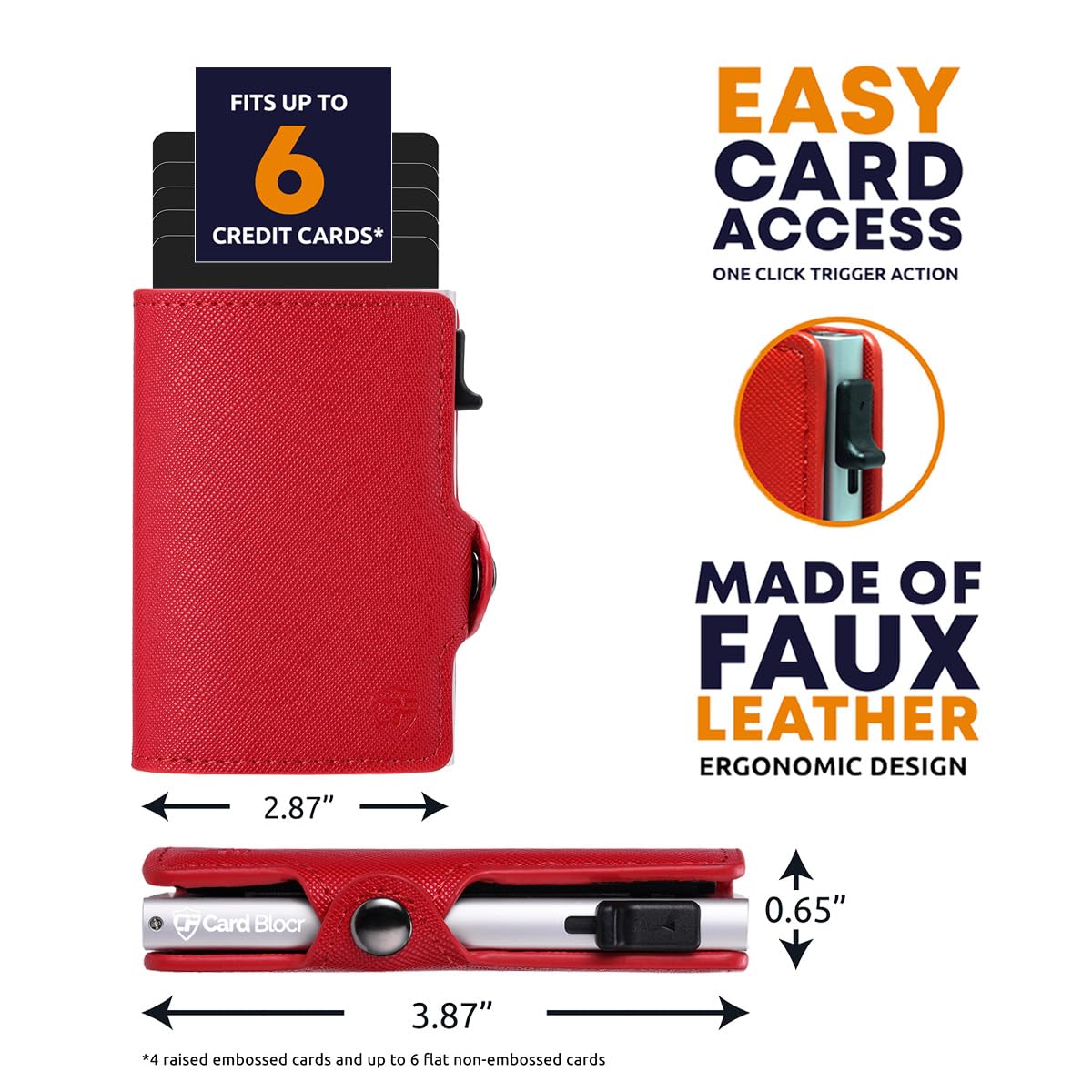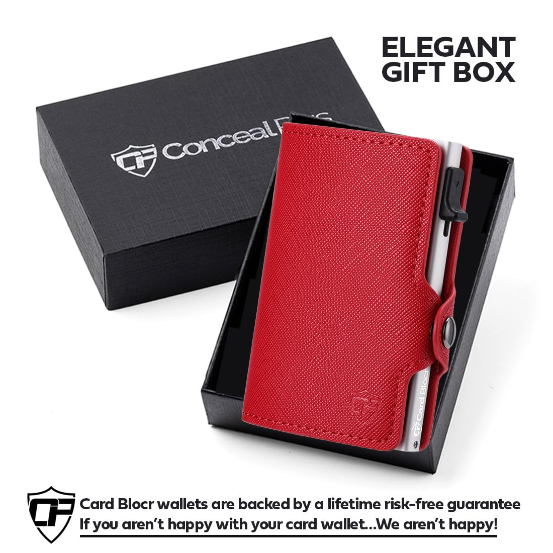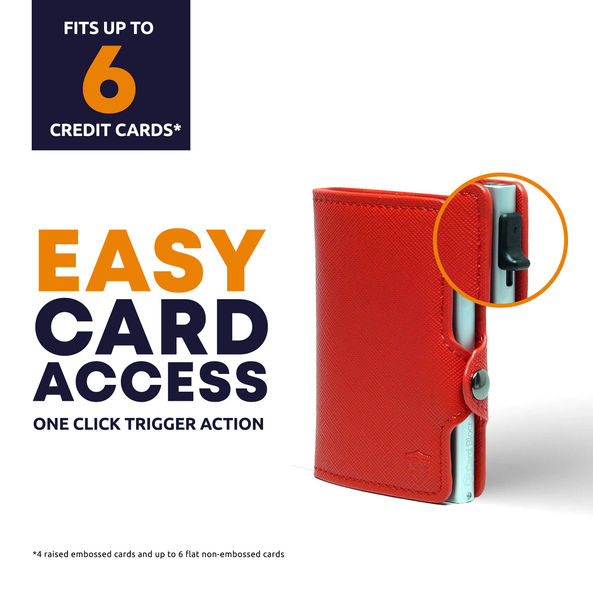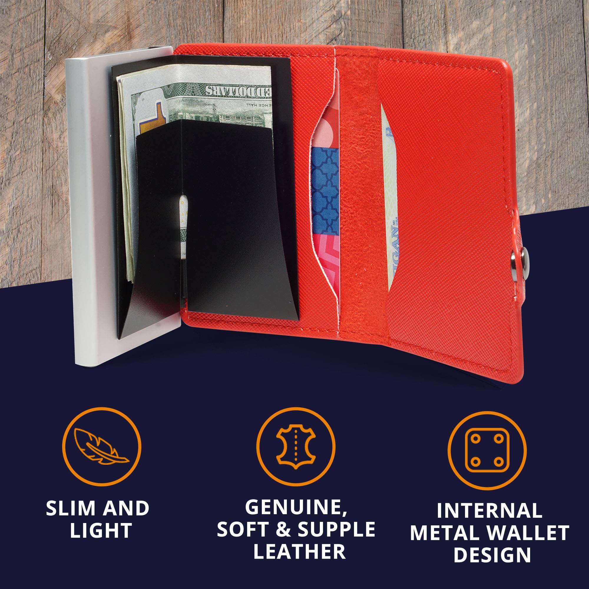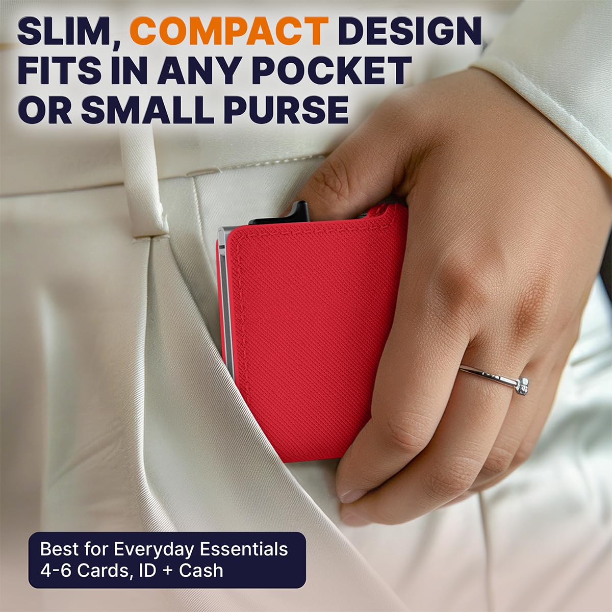 SMART DESIGN: Compact wallet for women with innovative pop-up mechanism; Press the button for instant access to all your cards; Minimalist card case with sleek profile fits perfectly in small purses or pockets