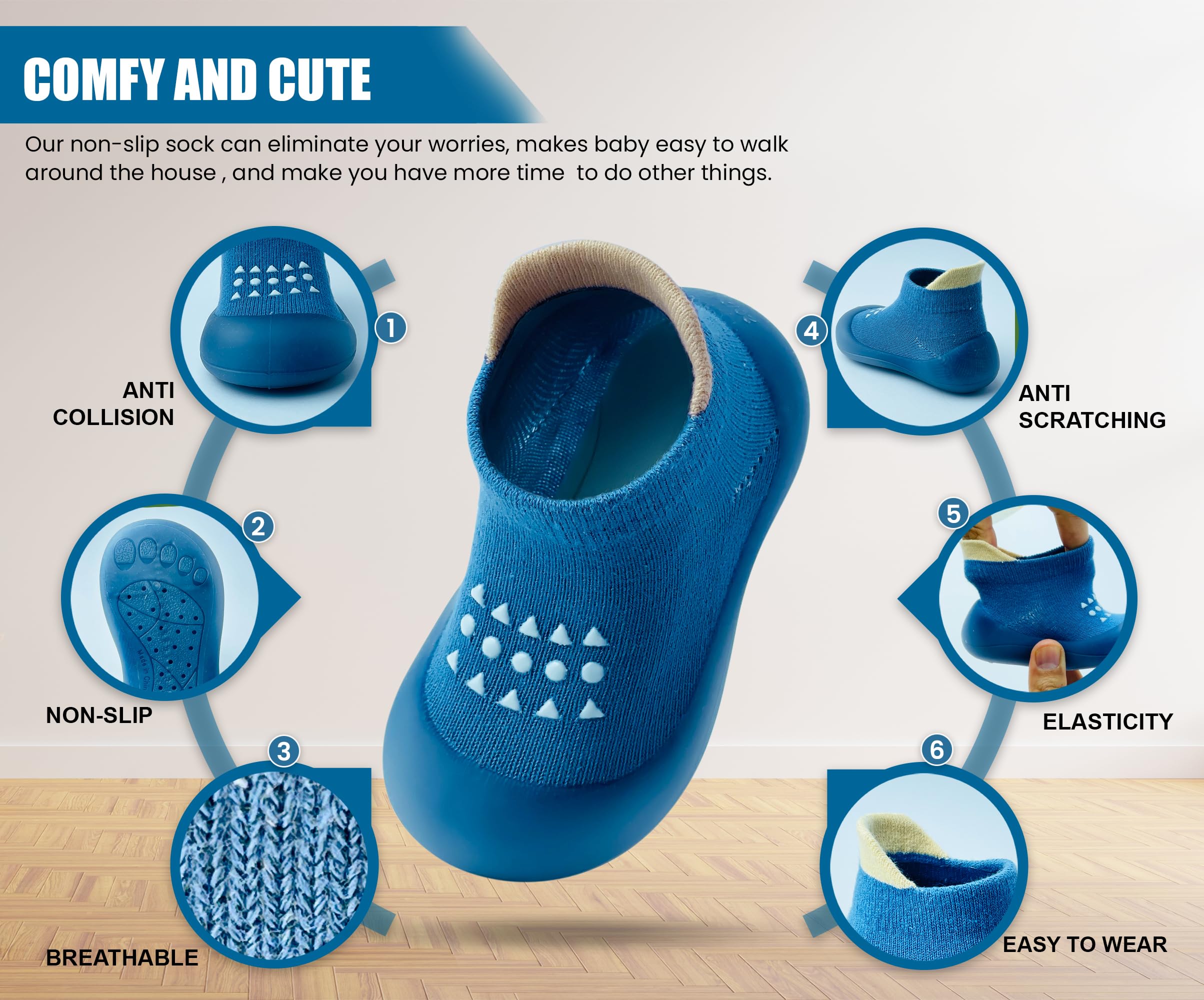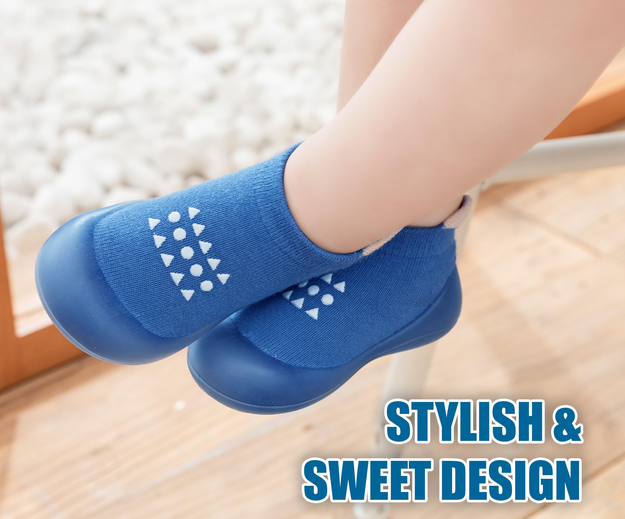 BREATHABLE DESIGN - The upper part of the baby walking shoes, knitted with high quality cotton material, allows your child's feet to breathe. Your toddler can wear our baby sock shoes comfortably all day long. There won’t be any moisture. Our baby sneakers keep warm in winter and cool in summer. It can be used comfortably in all seasons.