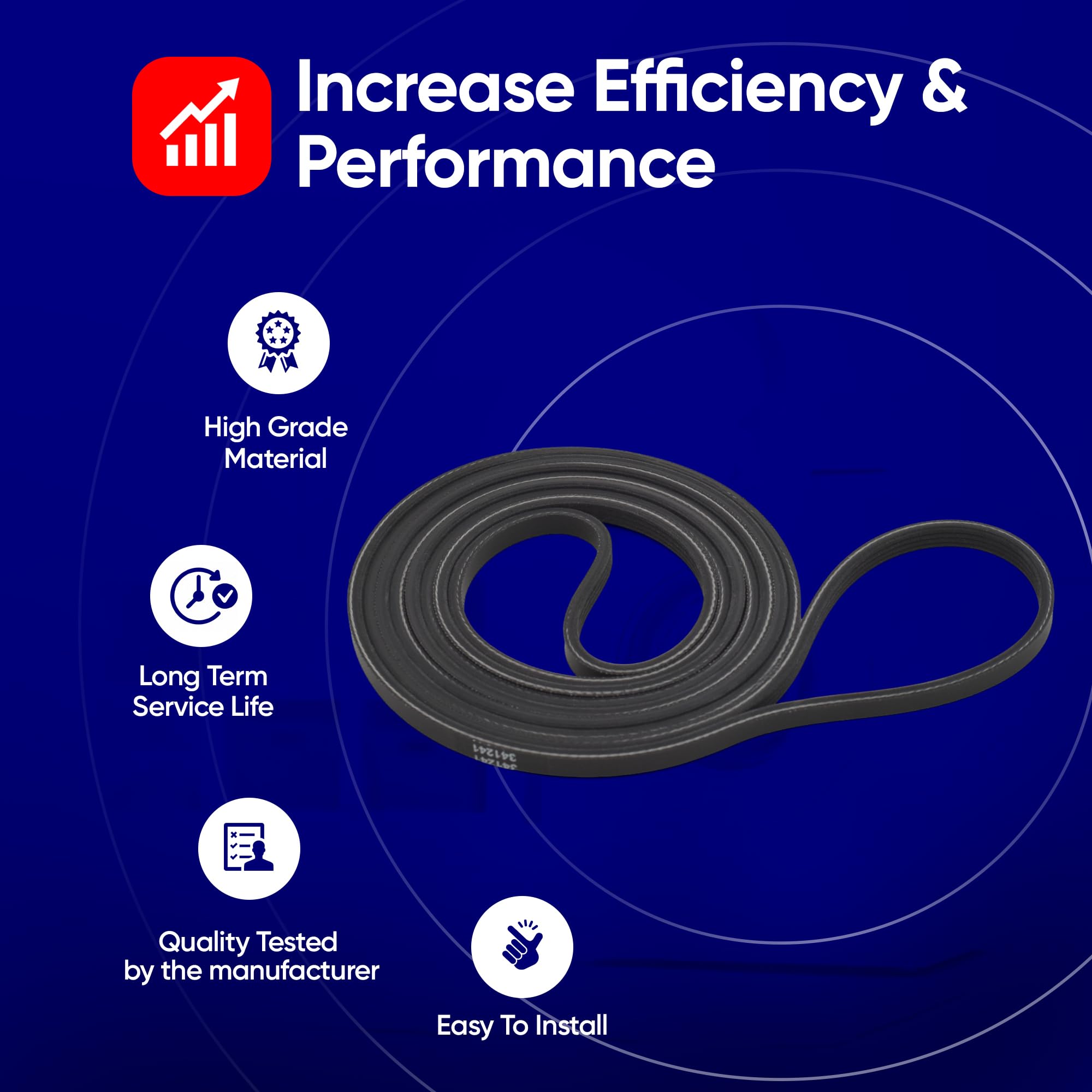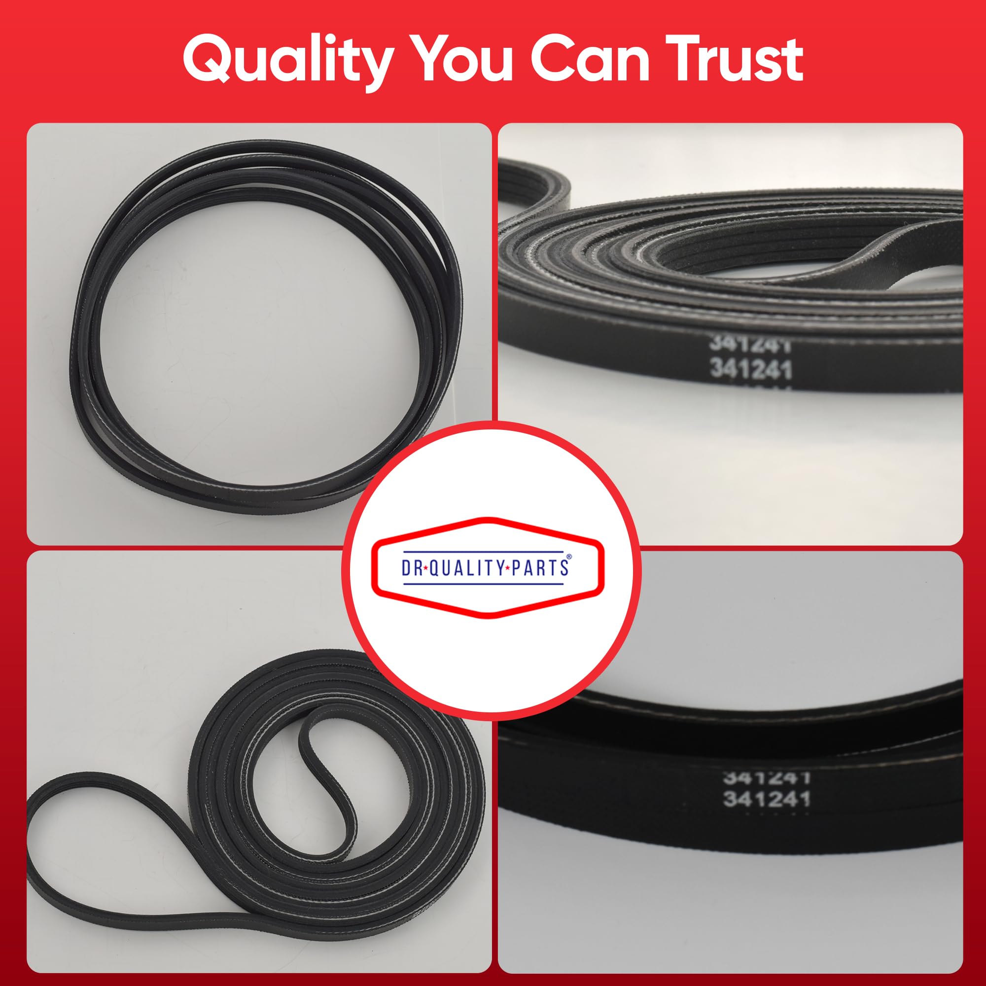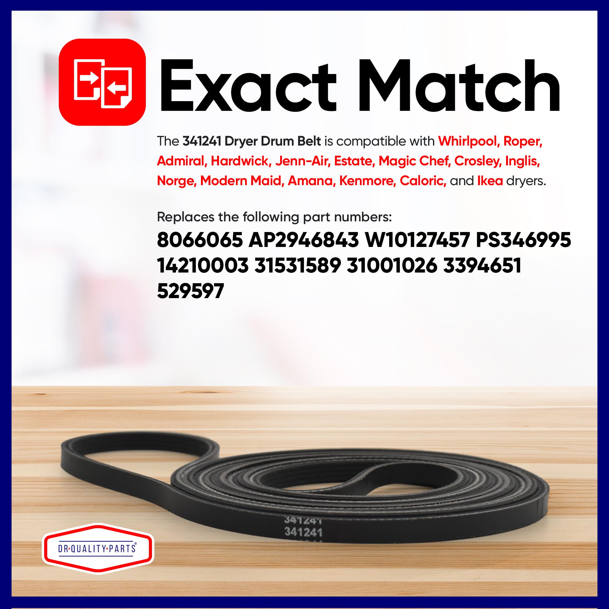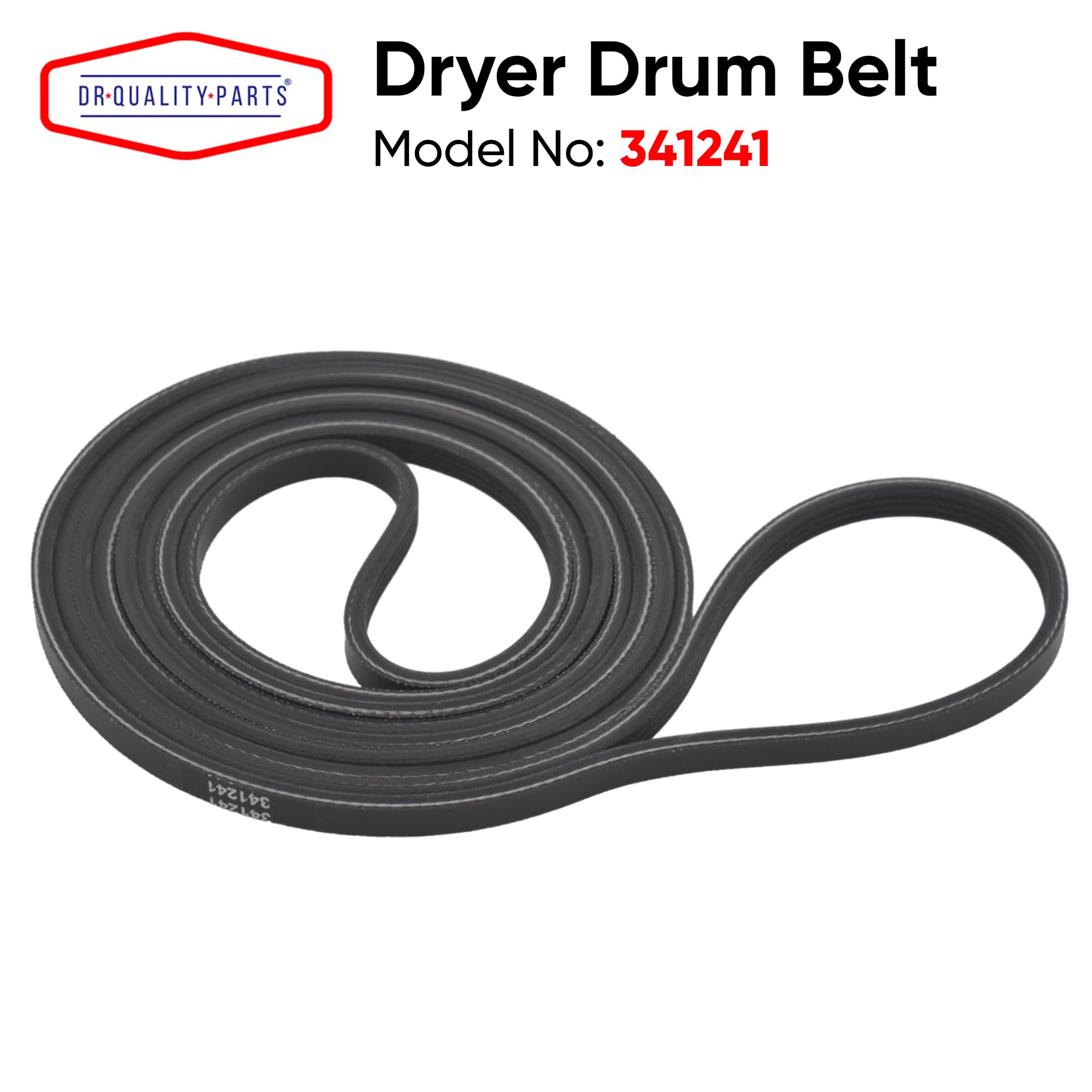 341241 8066065 Dryer Drum Belt is 1/4" wide x 92-1/4" long. The belt has 4 ribs and 3 grooves. Dryer drum belt connects the drum, idler pulley, and motor pulley. The belt attaches to the motor pulley, as the armature of the motor turns, the belt begins to move and turn the drum. If the drum of the dryer does not rotate during the drying process, but you hear the motor running, your belt may have broken and need to be replaced.