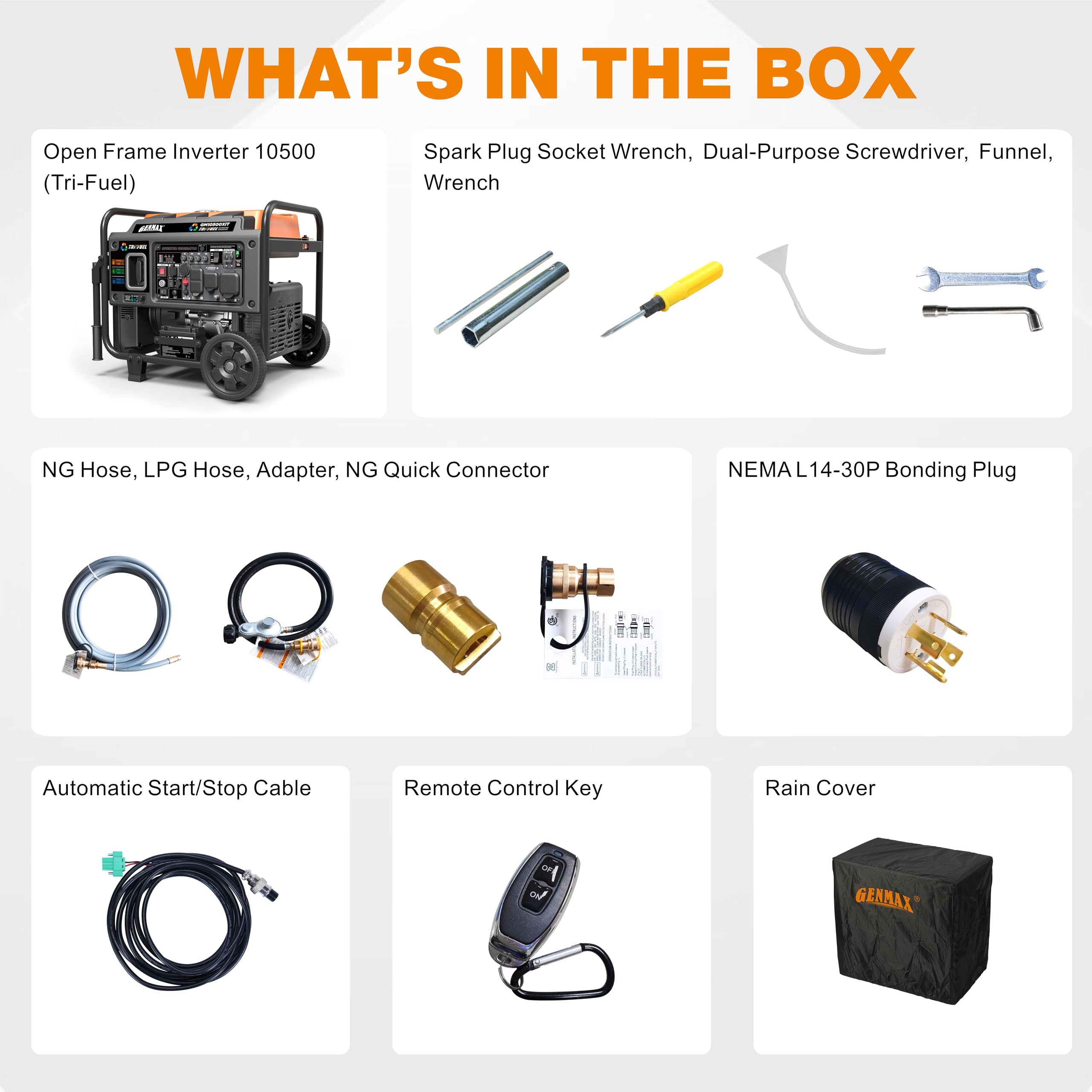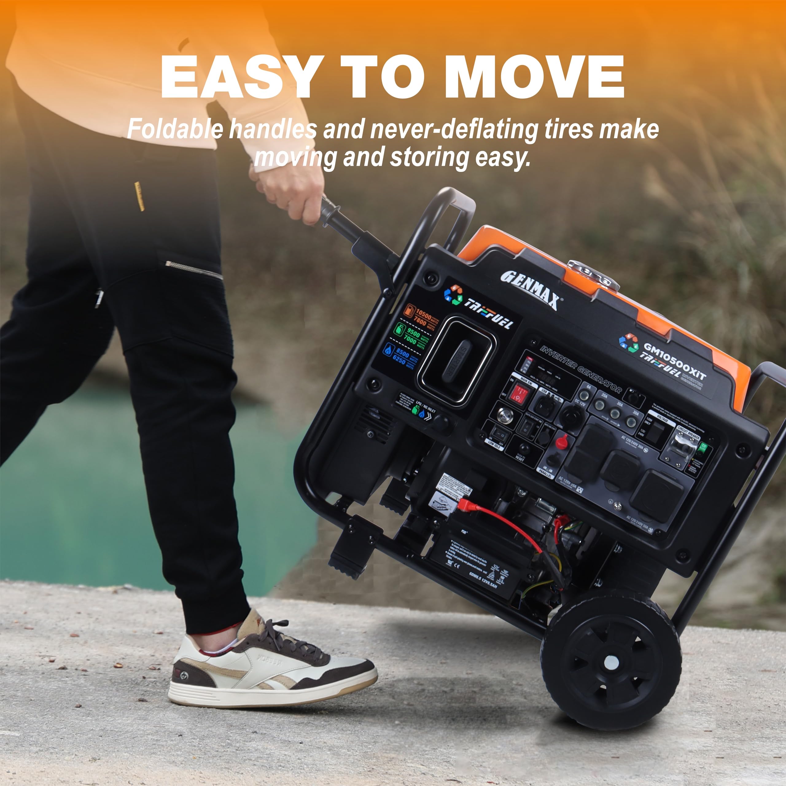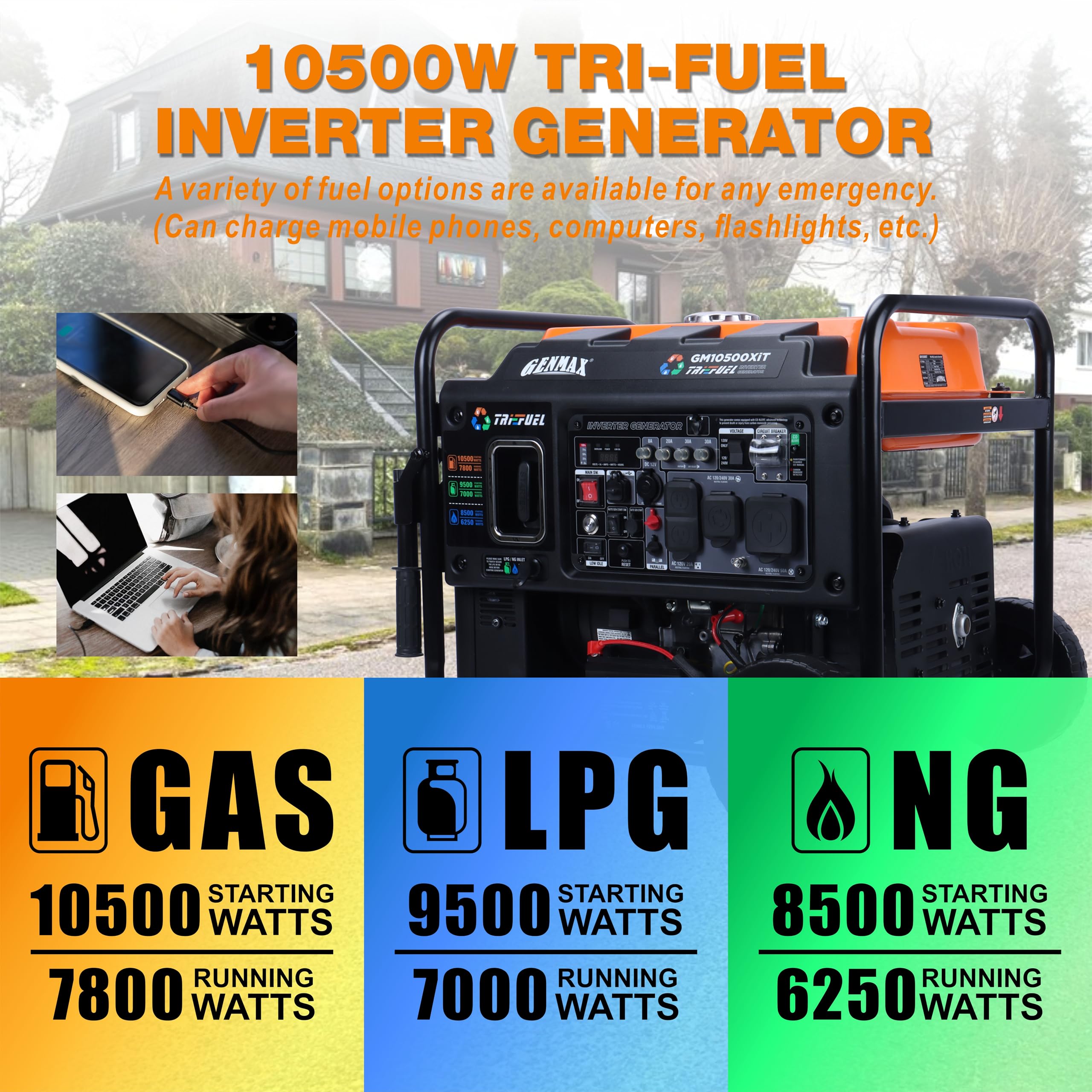 【Compact Powerhouse, Versatile Adaptation】:The GM10500XiT Rated running power of 7800W and a peak power of 10500W make it ready to respond to various power demands. It is a revolutionary new generation inverter generator that redefines portability with its compact and lightweight design. Perfect for home backup, Tri-Fuel With THD ≤3%, it ensures stable power supply for delicate devices like smartphones and laptops.