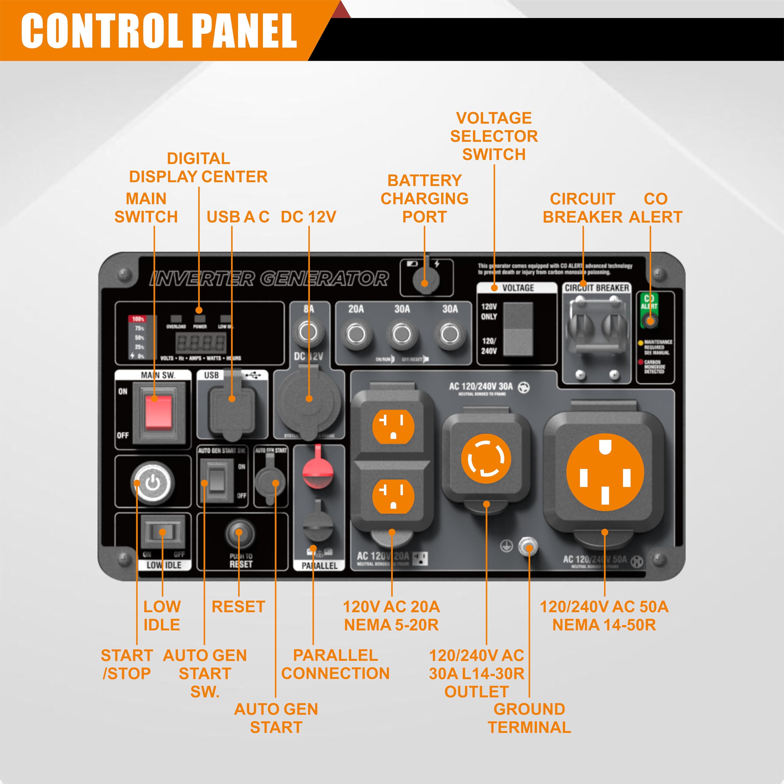 【Intelligent Control Panel, 2 wire Start】: The generator's control panel combines multiple functions with cutting-edge technology and user-friendly design. Direct current outputs paired with USB ports meet the charging needs of various digital devices. Multi-functional digital displays provide real-time operational parameters for easy monitoring. Features such as battery charging port, 2 wire automatic start/stop to charge solar batteries, and parallel operation capabilities offer intelligent solutions for complex power scenarios. The CO alarm function ensures safety, while voltage switching accommodates different electrical standards for seamless operation.