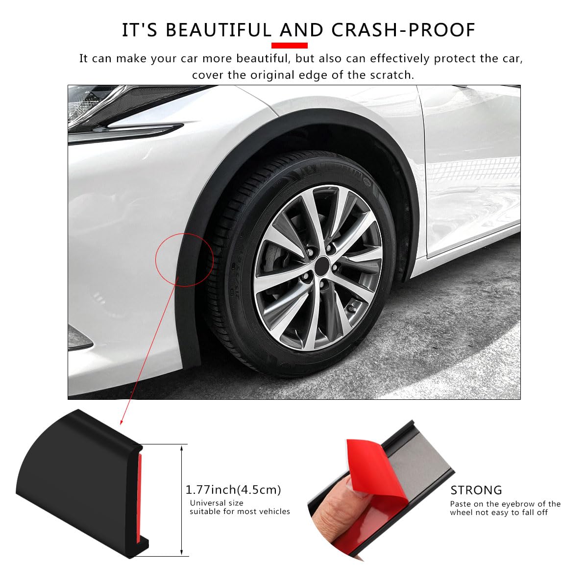 【Easy Installation】The product has good softness and plasticity. It does not require any tools. Remove the red protective film and paste it directly. It can be bent and pasted according to the radian of the wheel arch, and finally cut with scissors. After installation, press firmly on each position to make it more secure.