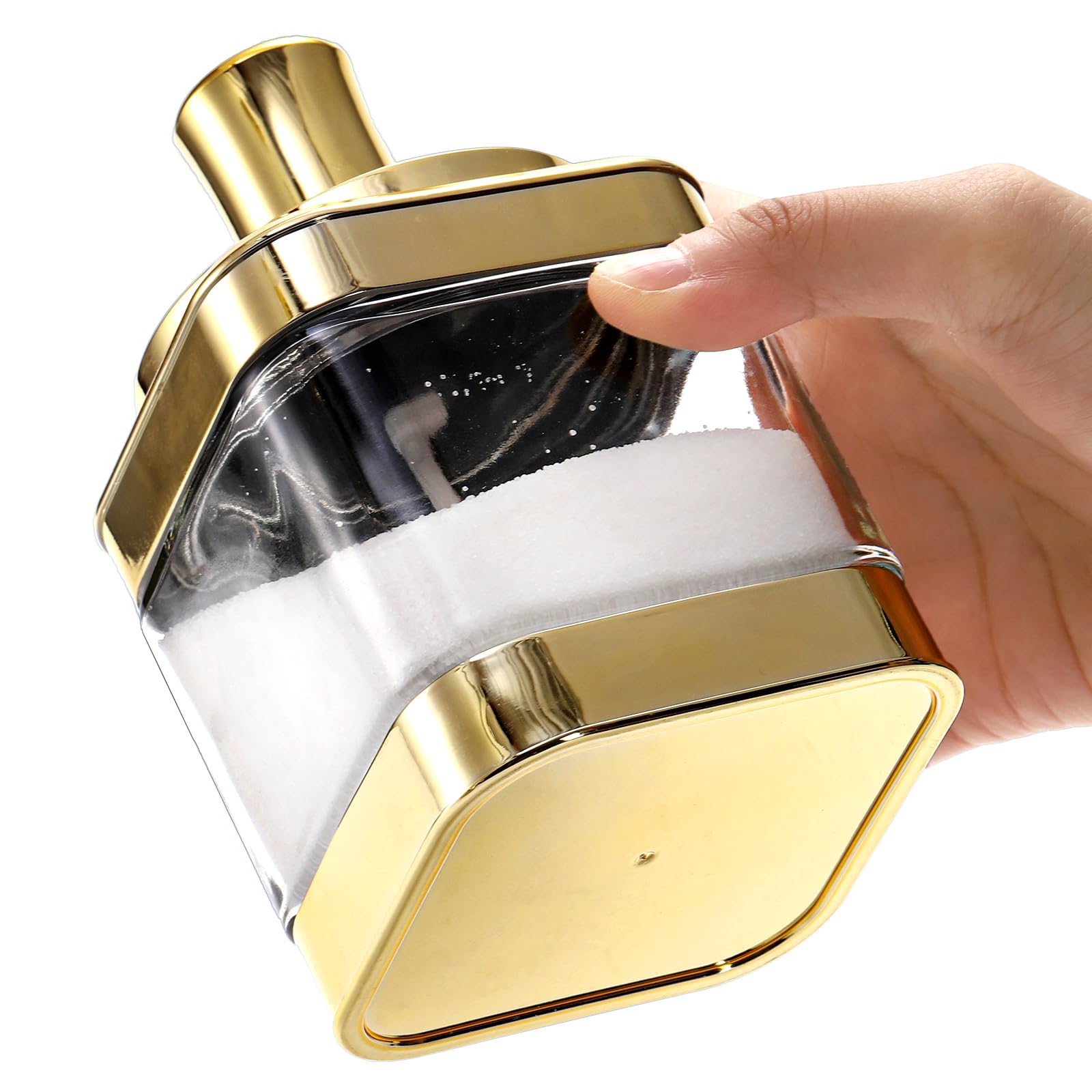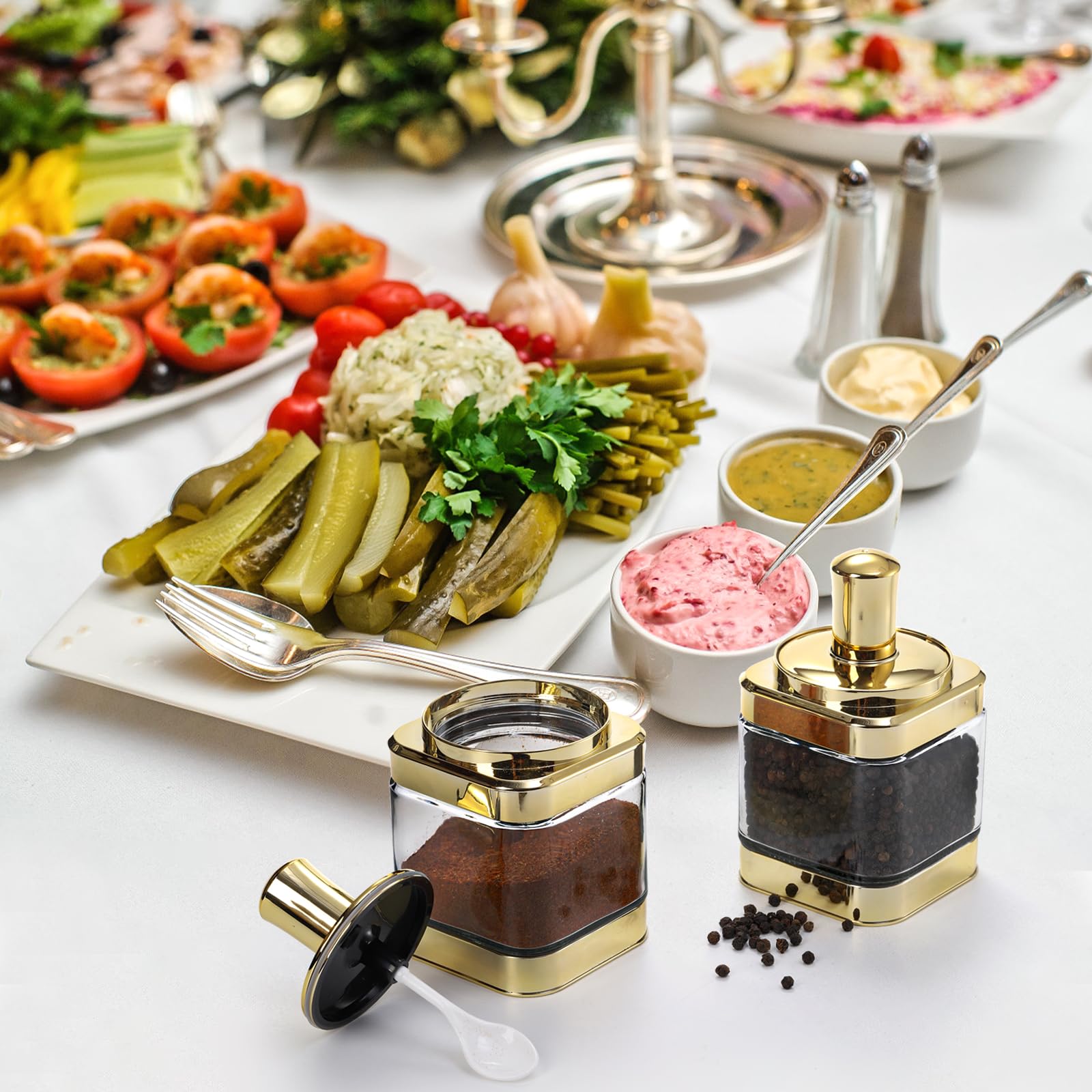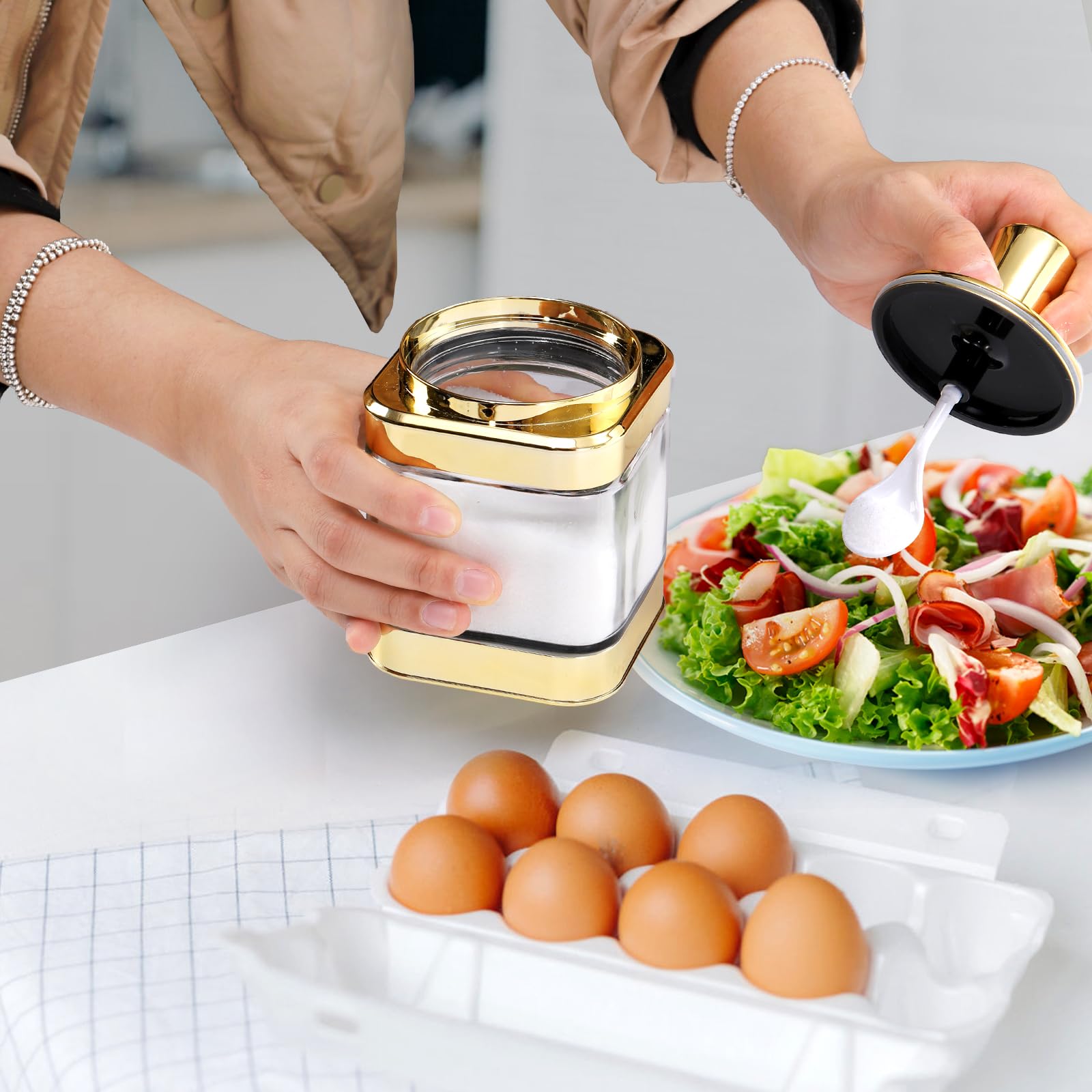 Elegant Design: These salt and sugar container sets are covered with a bright gold color, which looks very exquisite, and adds a touch of elegance to your table. The high transparency of the glass bottle body allows you to see what is inside at a glance.