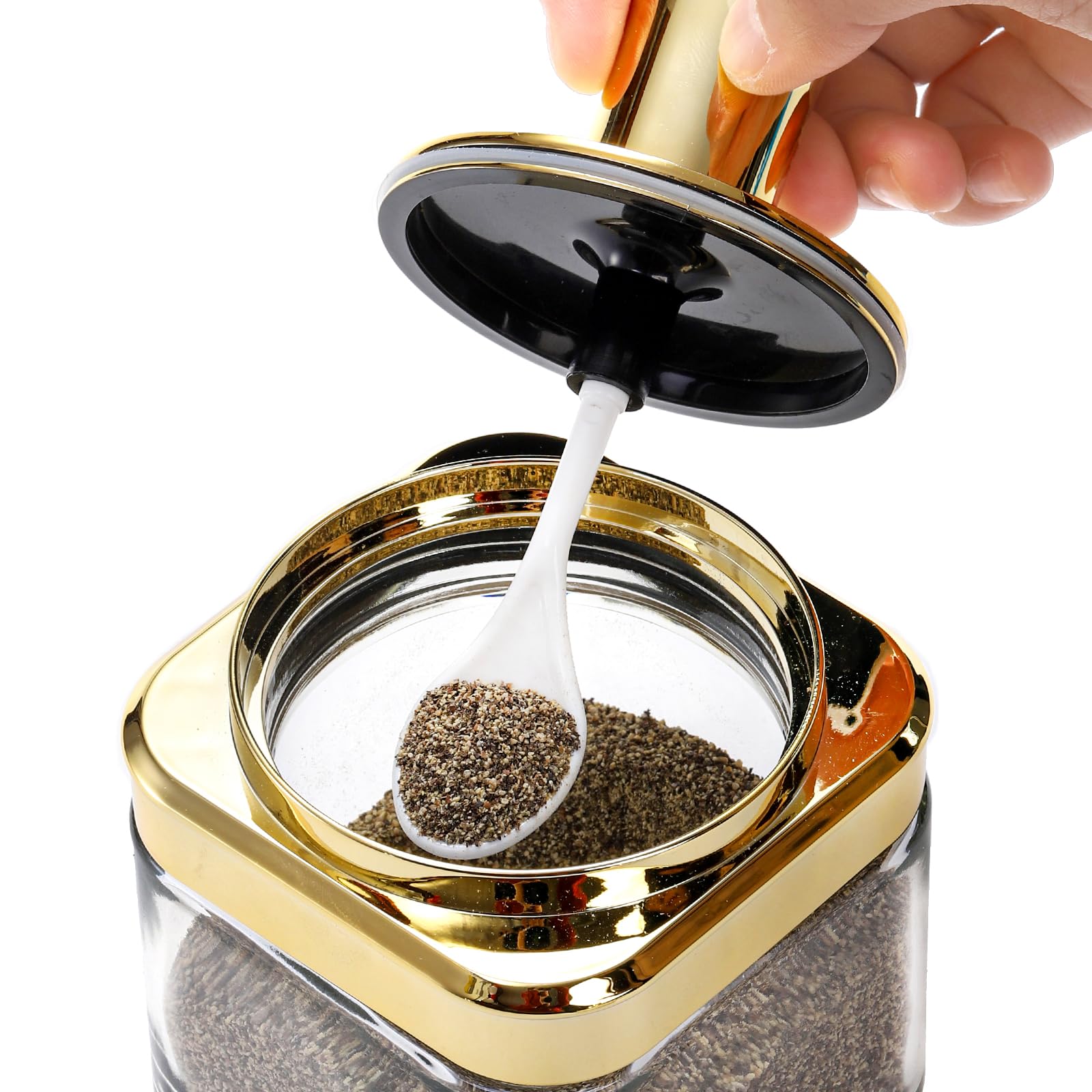 Comes with Lid and Spoon: This gold salt and pepper shaker is designed with a notch on the lid which can accommodate the spoon. It's convenient for you to dig out the seasoning! The lid with a rubber ring also prevents moisture and dust.