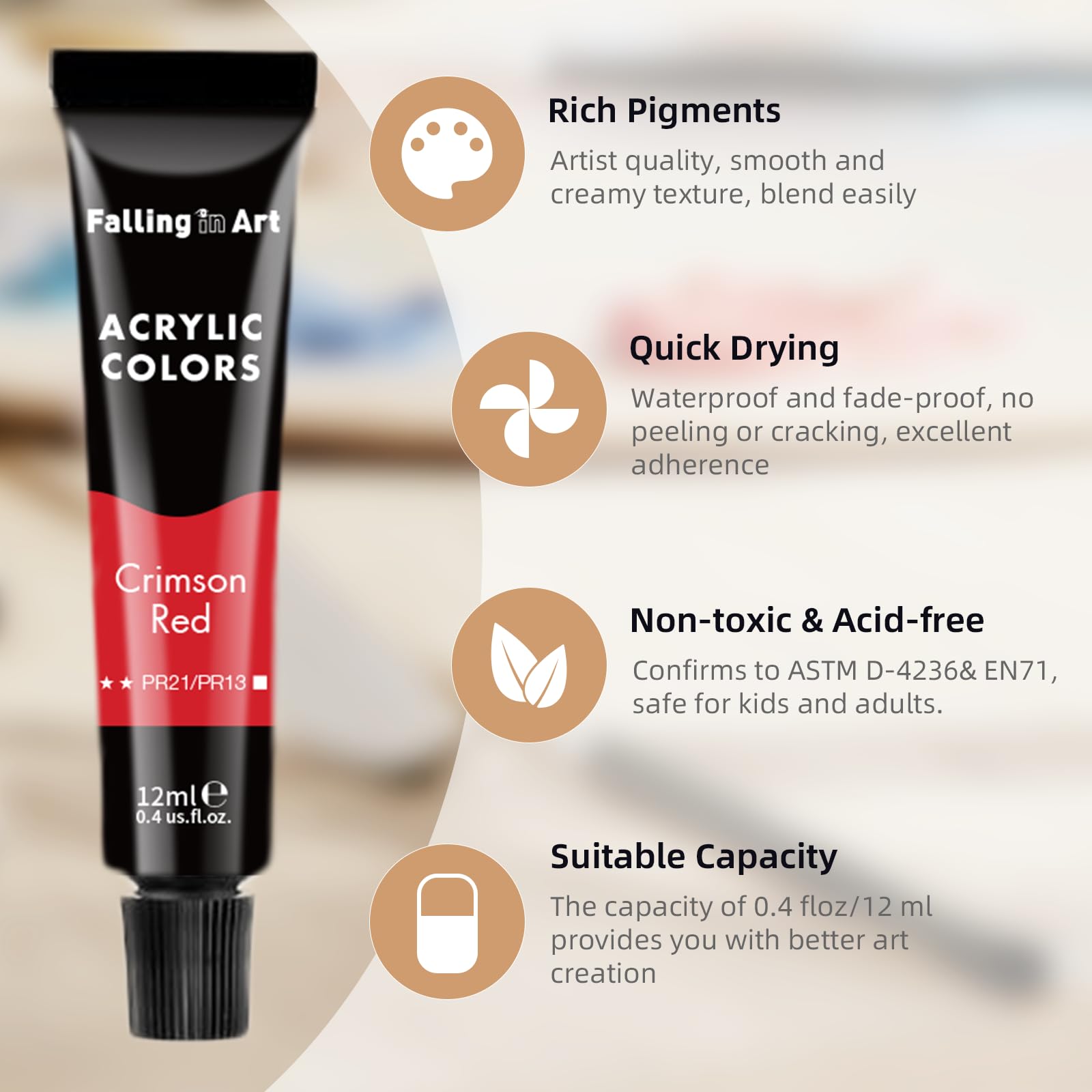 Various Accessories: Falling in Art 9x12" canvas panels are great for acrylic and oil painting. 12 different acrylic tubes can match your basic painting needs with a palette. The nylon brush set includes round, flat, and angular shapes, fitting for any painting style.