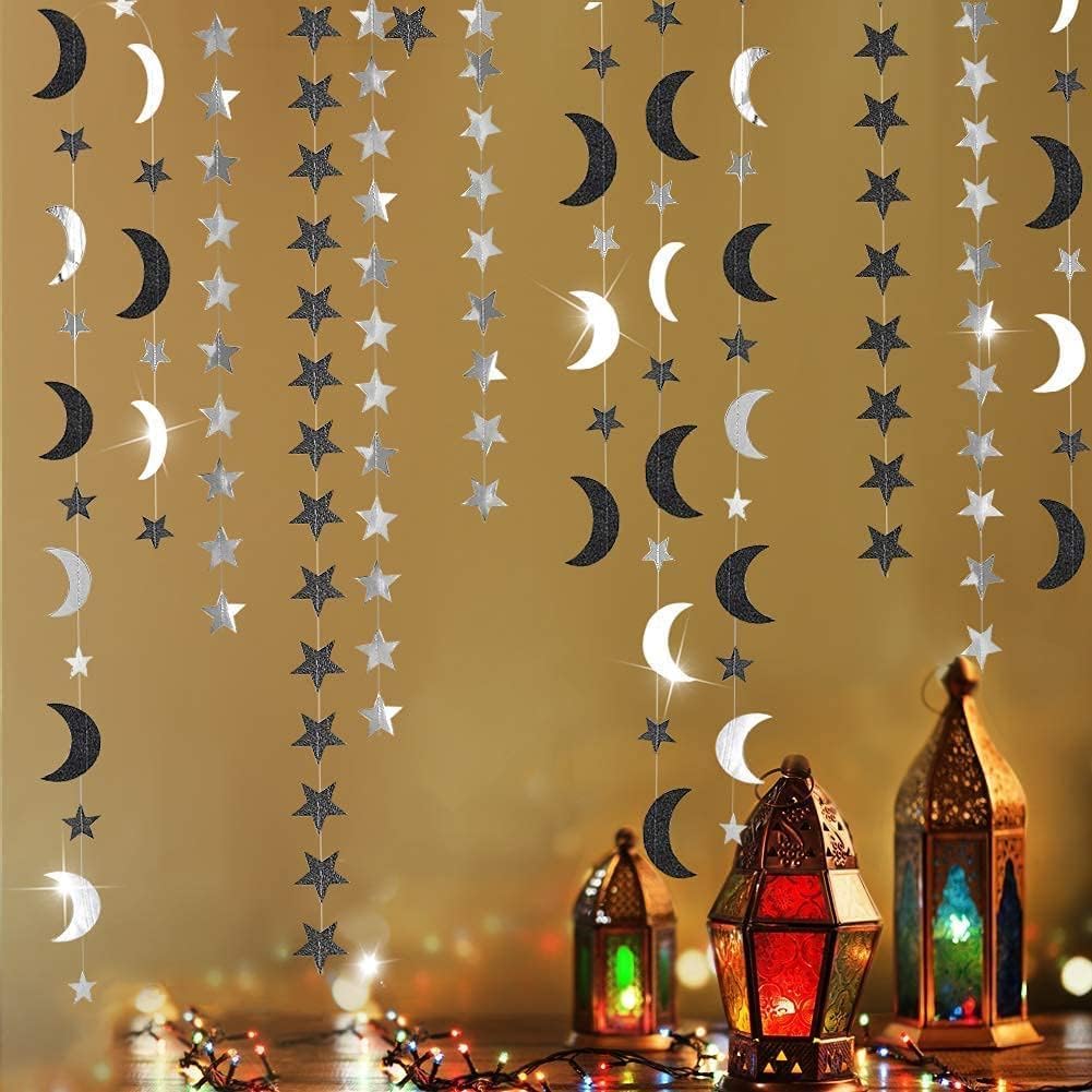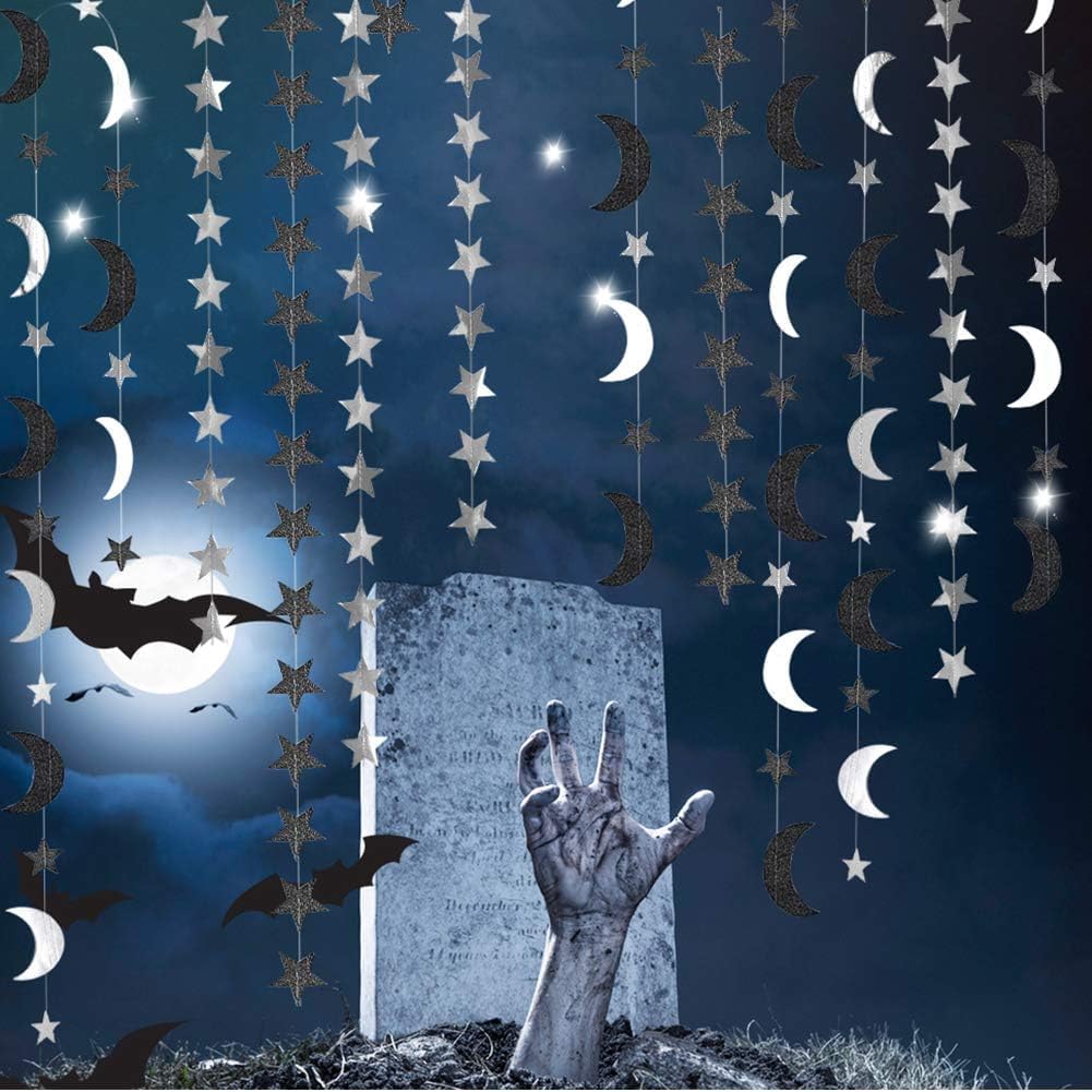 Package Includes: 4 strings of 13-foot-long garlands for a total of 52 feet. Two strings alternate between glitter black crescent moons and shiny silver stars, while the other two showcase black glitter stars and silver glitter stars. Cutout sizes range from 1.6 inches to 3.5 inches, making this a stunning new year eve decoration, gothic decor, or celestial party decoration.