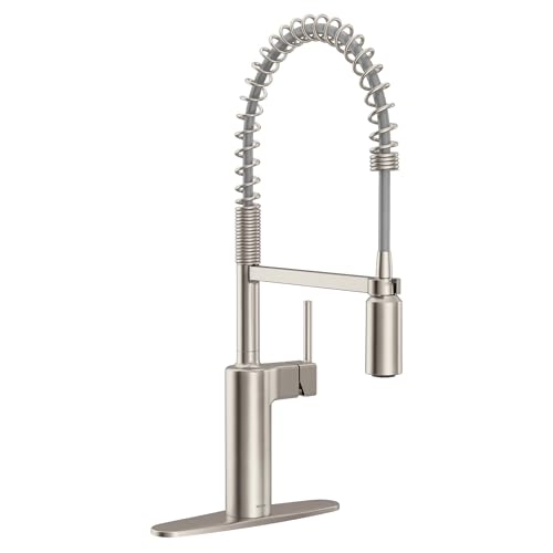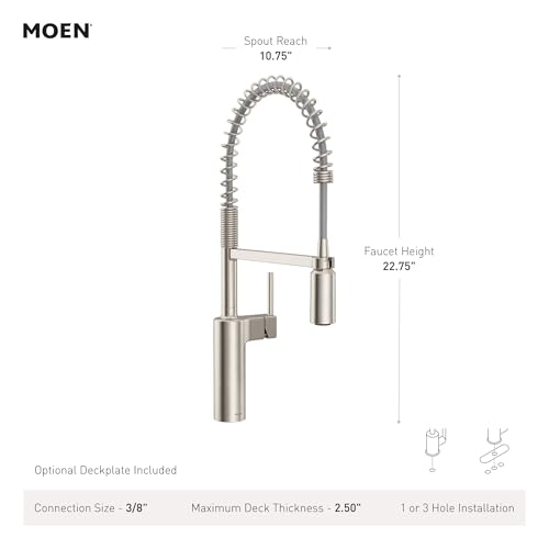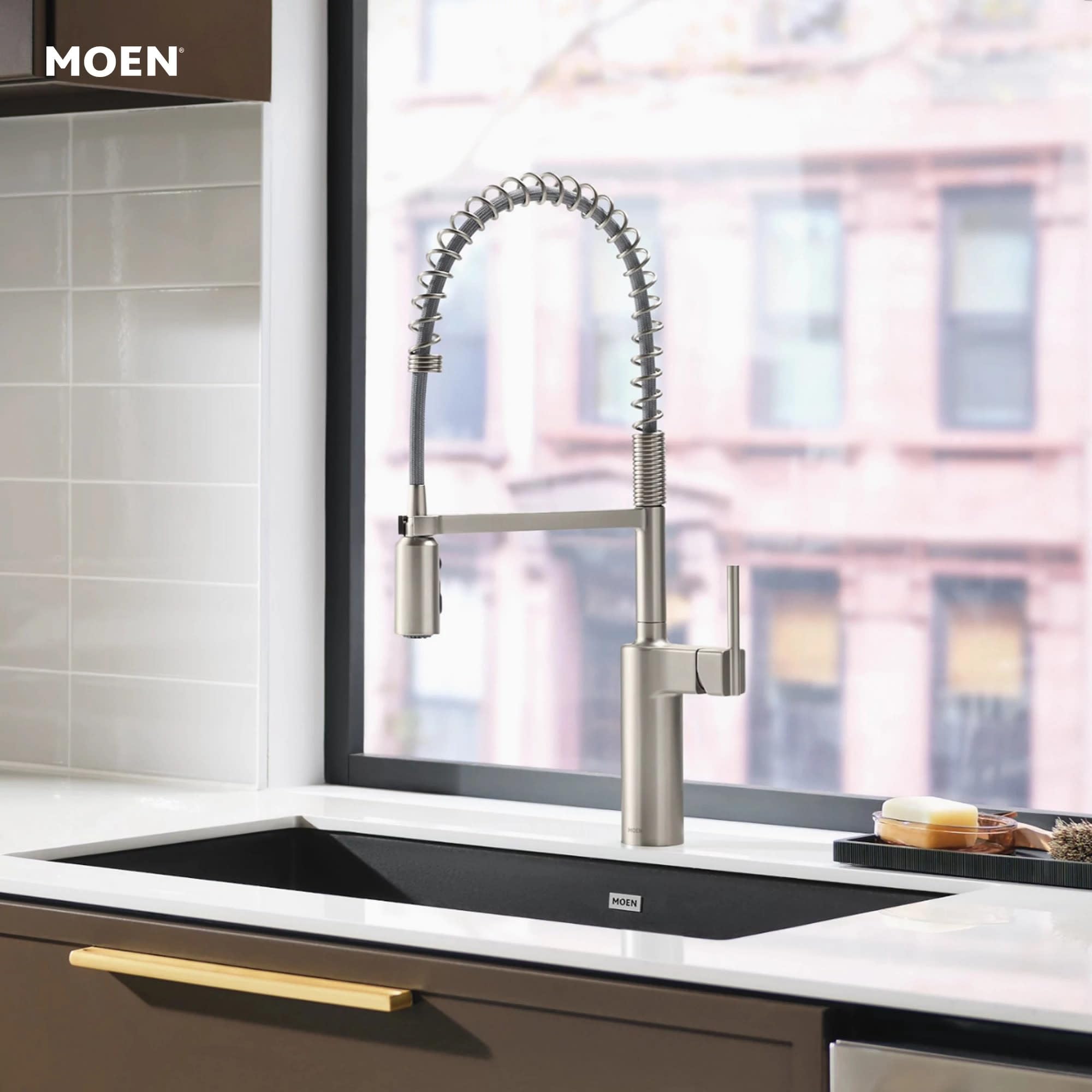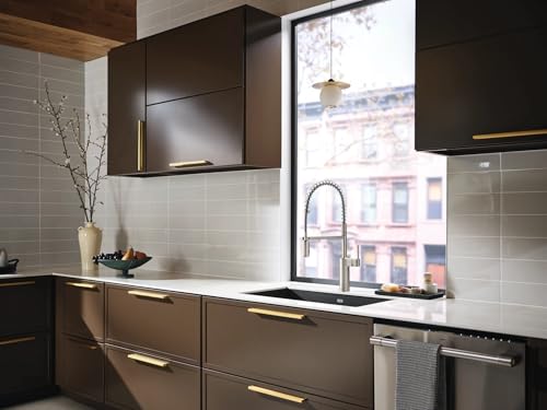 A lush take on classic geometric style, the Inara pre-rinse spring pulldown kitchen faucet showcases bold proportions for a strikingly luxe modern effect. Its layered sculptural features, paired with its tall stature and matching included deck plate, lend a lavish touch to the kitchen. Plus, the exposed-spring design maximizes reachability, while the four-function spray wand includes Moen’s Power Boost technology. Moen kitchen faucets with this technology provide 50 percent more spray power for quicker clean-up—all with a push of the button. It’s available in Spot Resist Stainless, a timeless, brushed stainless look that prevents fingerprints and water spots while blending seamlessly with various aesthetics.