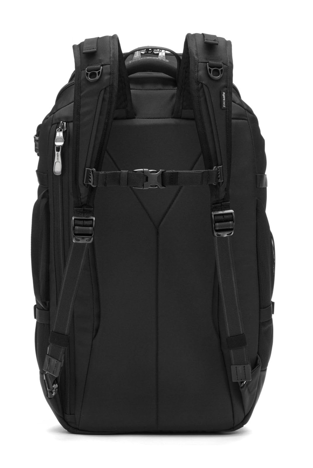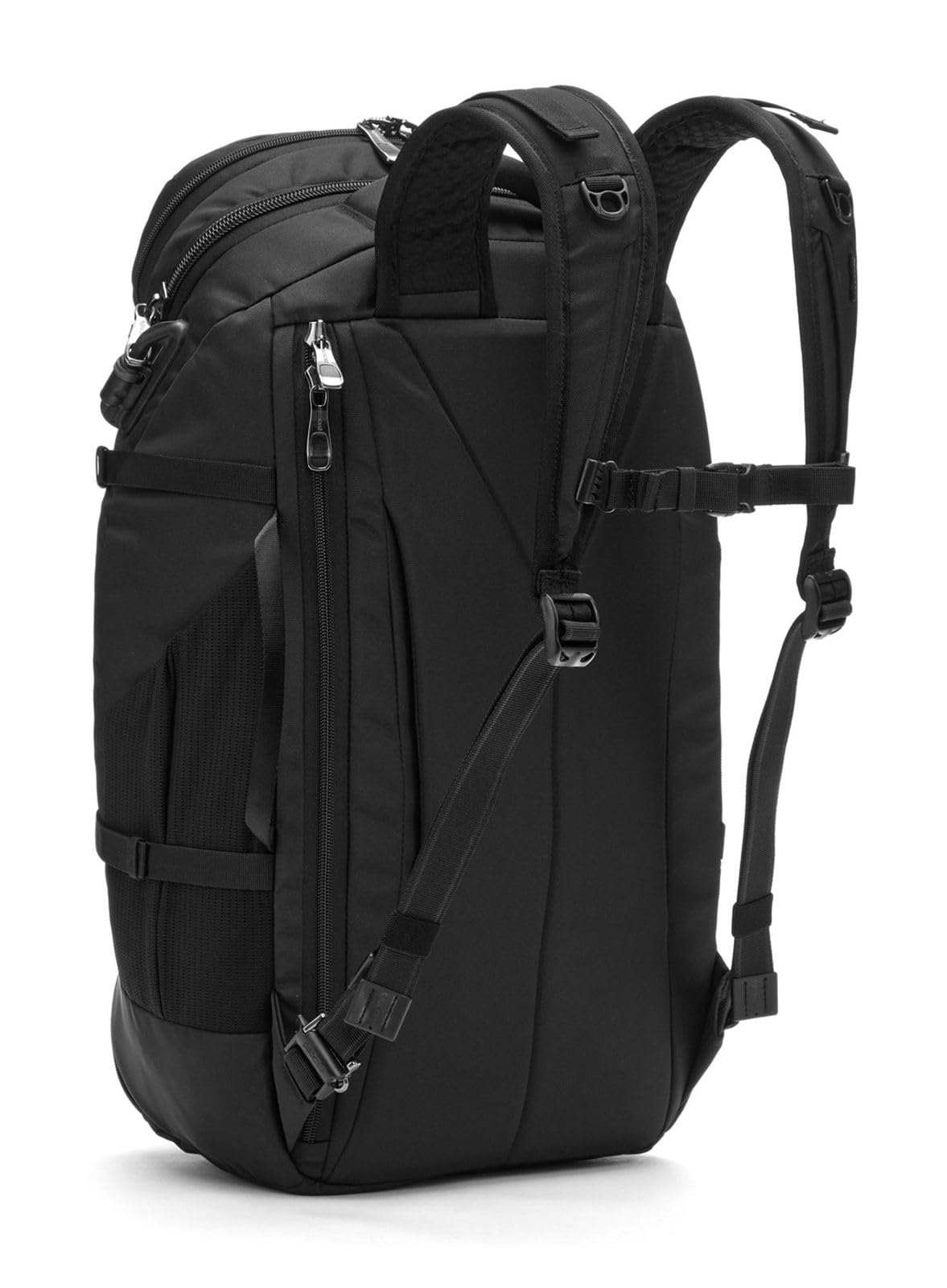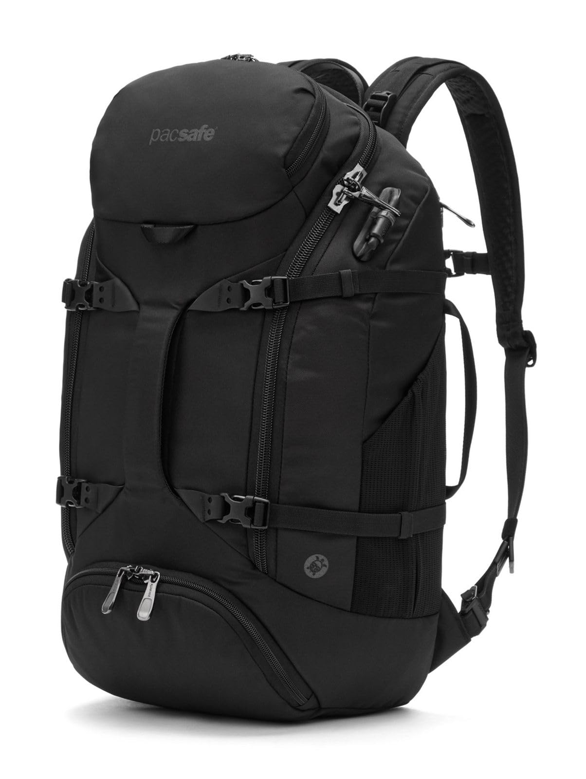 Description Gym, Travel, Work, Adventure – the world is yours with this versatile and spacious 35L backpack. It includes a bottom compartment that allows you to separate dirty shoes or wet towels, two large bottle pockets and external compression/attachment straps for a yoga mat or shell jacket. This backpack includes the latest in Pacsafe anti-theft technology - the self-locking zipper and is made with 37 recycled plastic bottles. Water repellant treatment is 100% PFC-free.