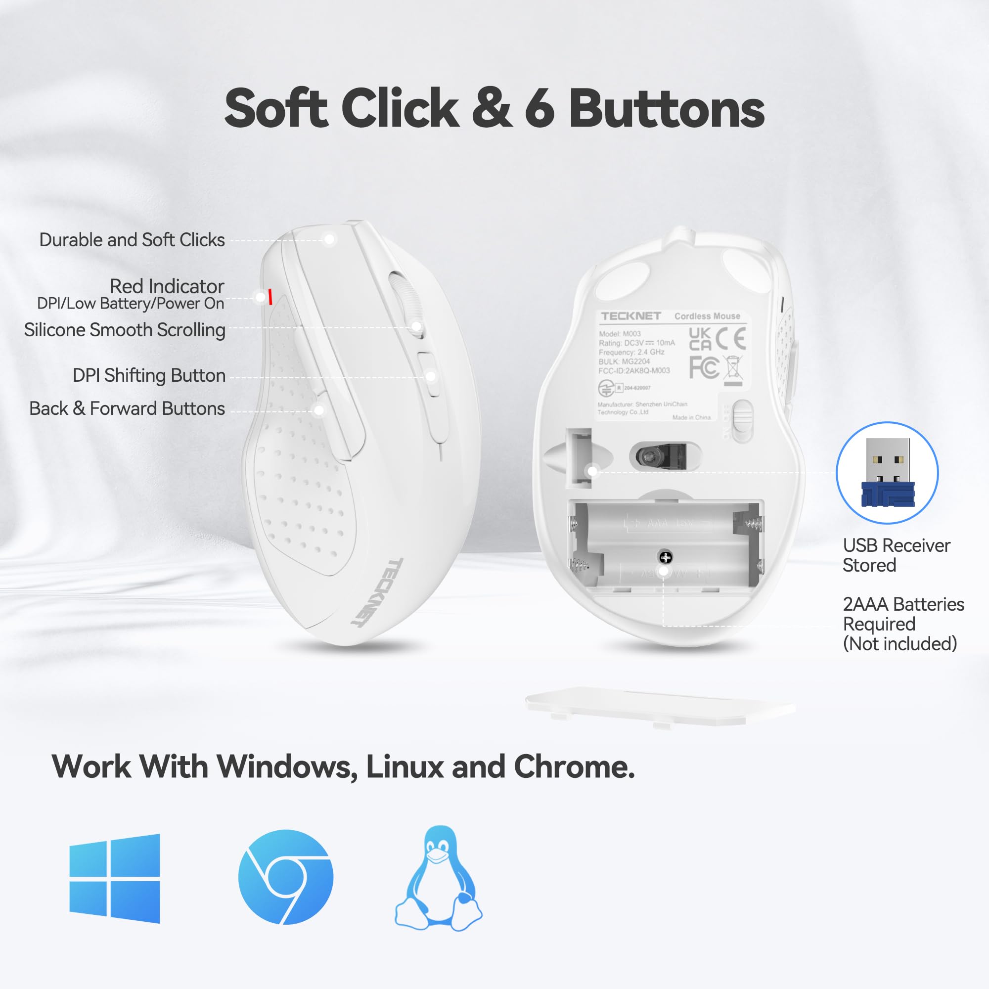 Notice: Please be aware that the AAA batteries are not included. The USB receiver is stored at the back of the mouse.