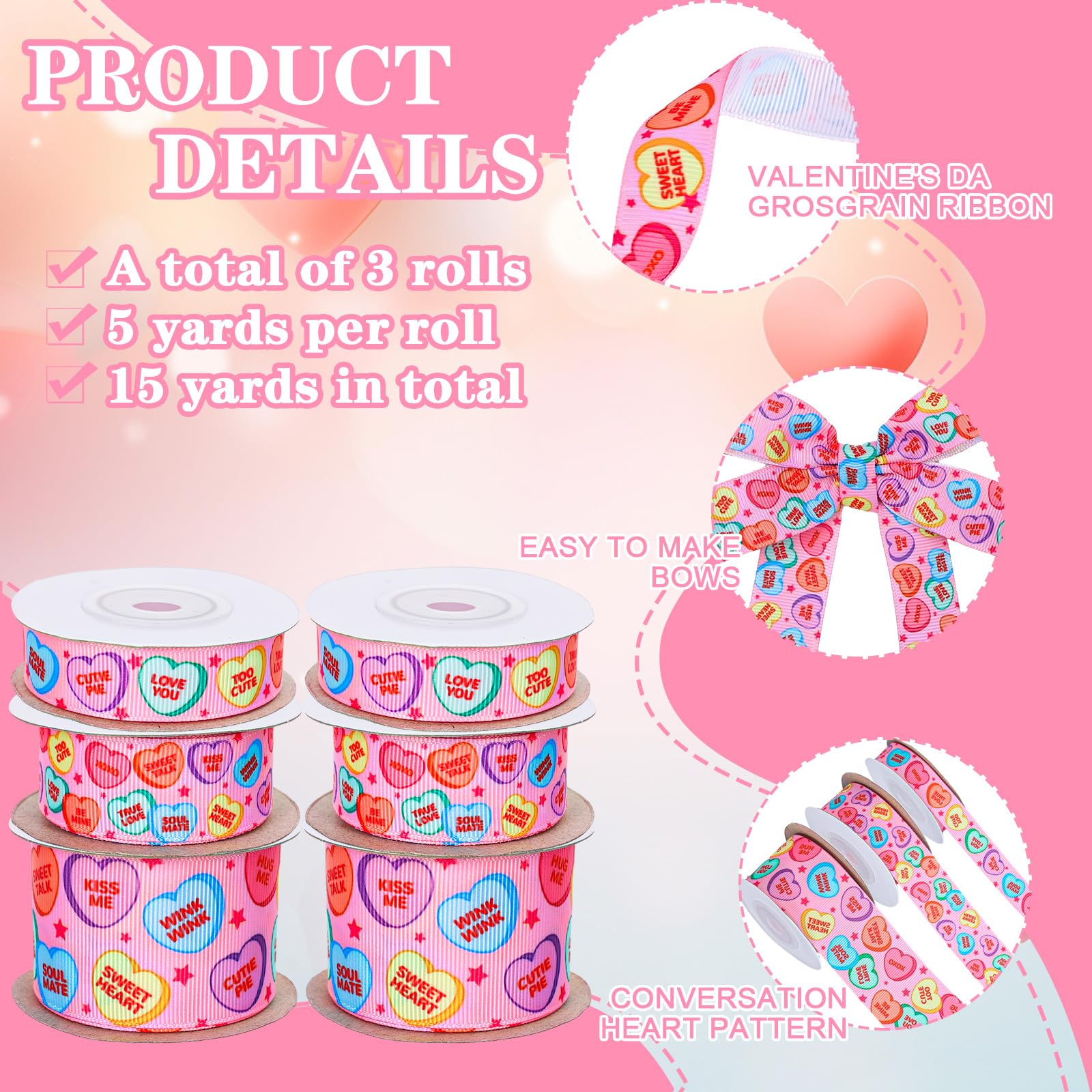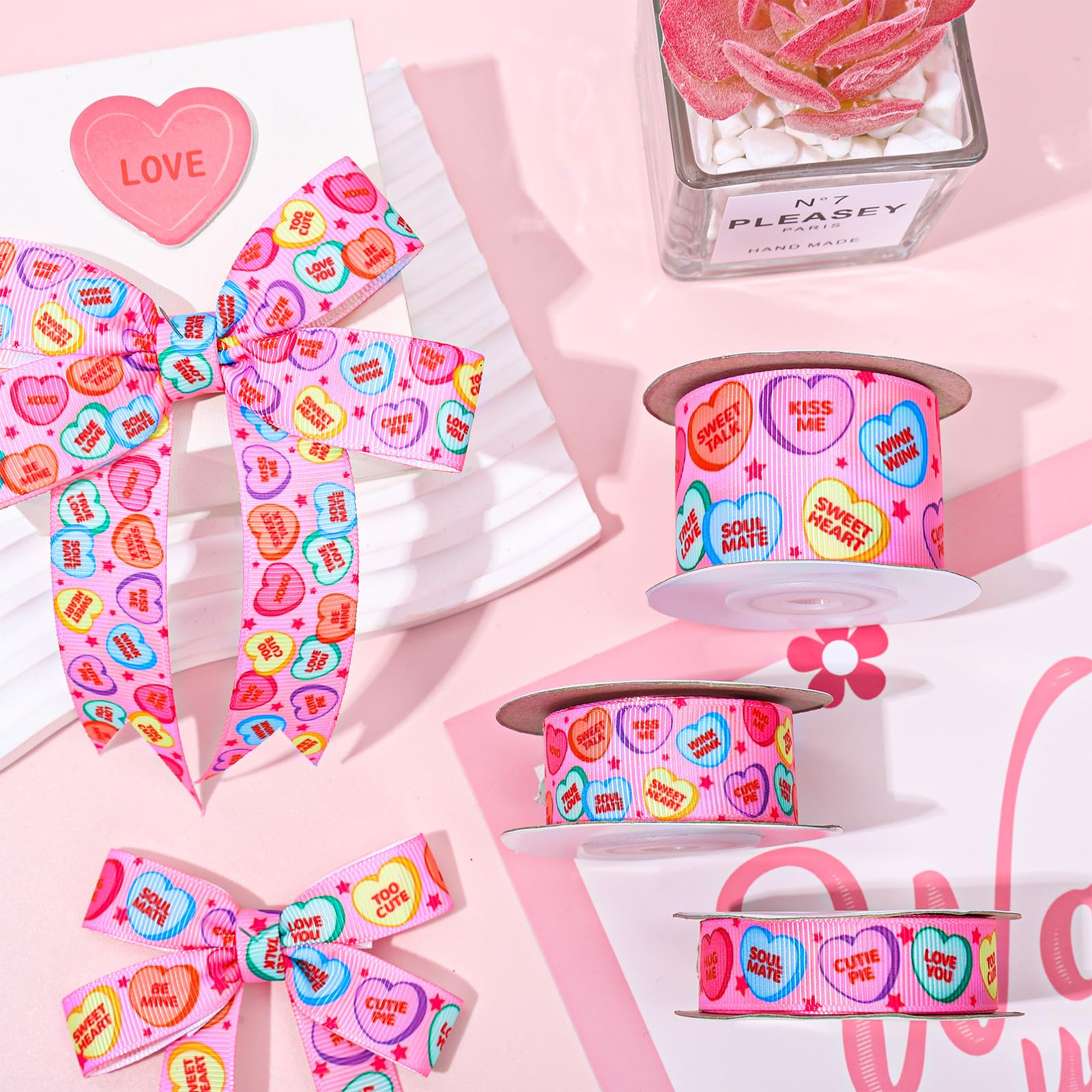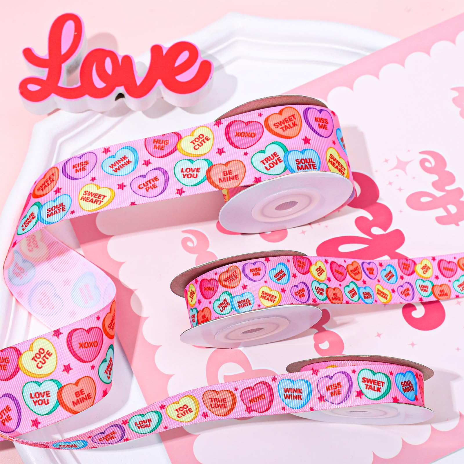CONVERSATION HEART GROSGRAIN RIBBON: Our ribbon rolls are printed with colorful hearts and sweet and romantic words on a pink background, in line with Valentineβs Day theme, which can meet your holiday decorative needs.