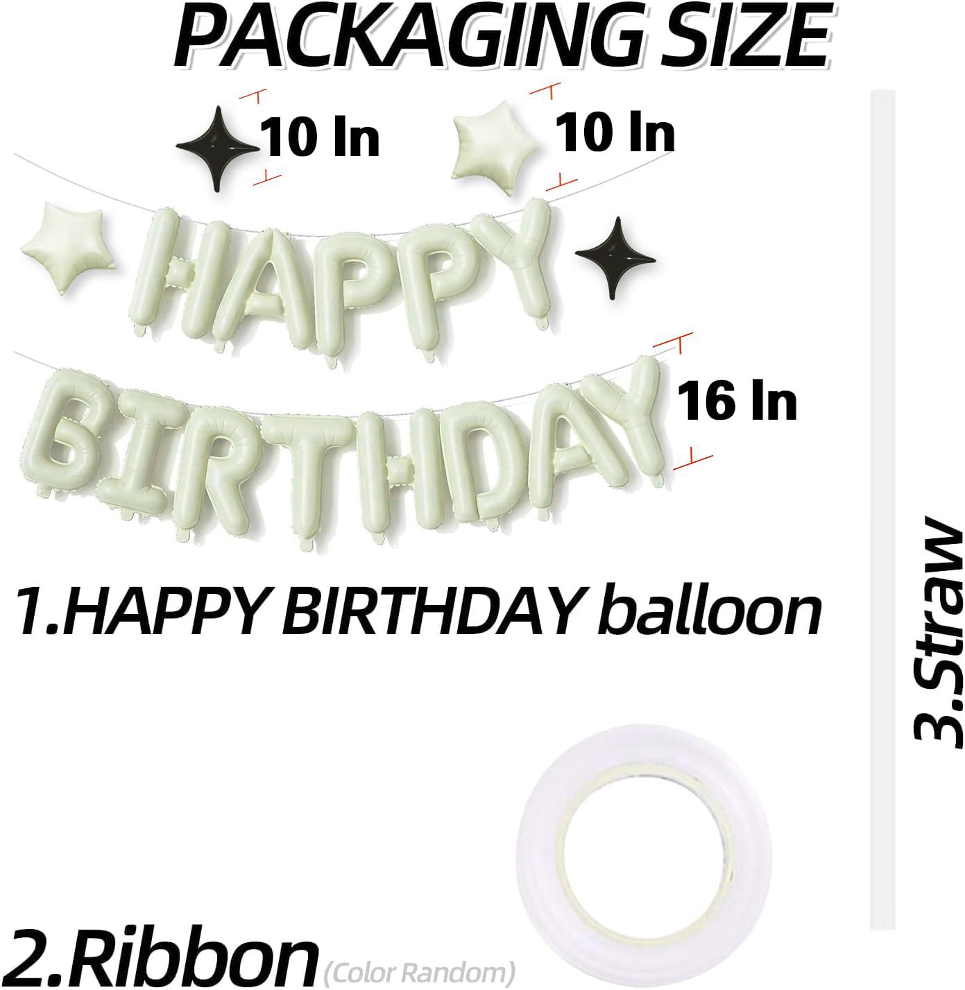 【Packaging content】16 Inch “HAPPY BIRTHDAY” Aluminum Foil Balloon * 1, 10 Inch Five Pointed Star Balloon * 2, 10 Inch Four Pointed Star Balloon * 2,Ribbon *1,Straw *1.