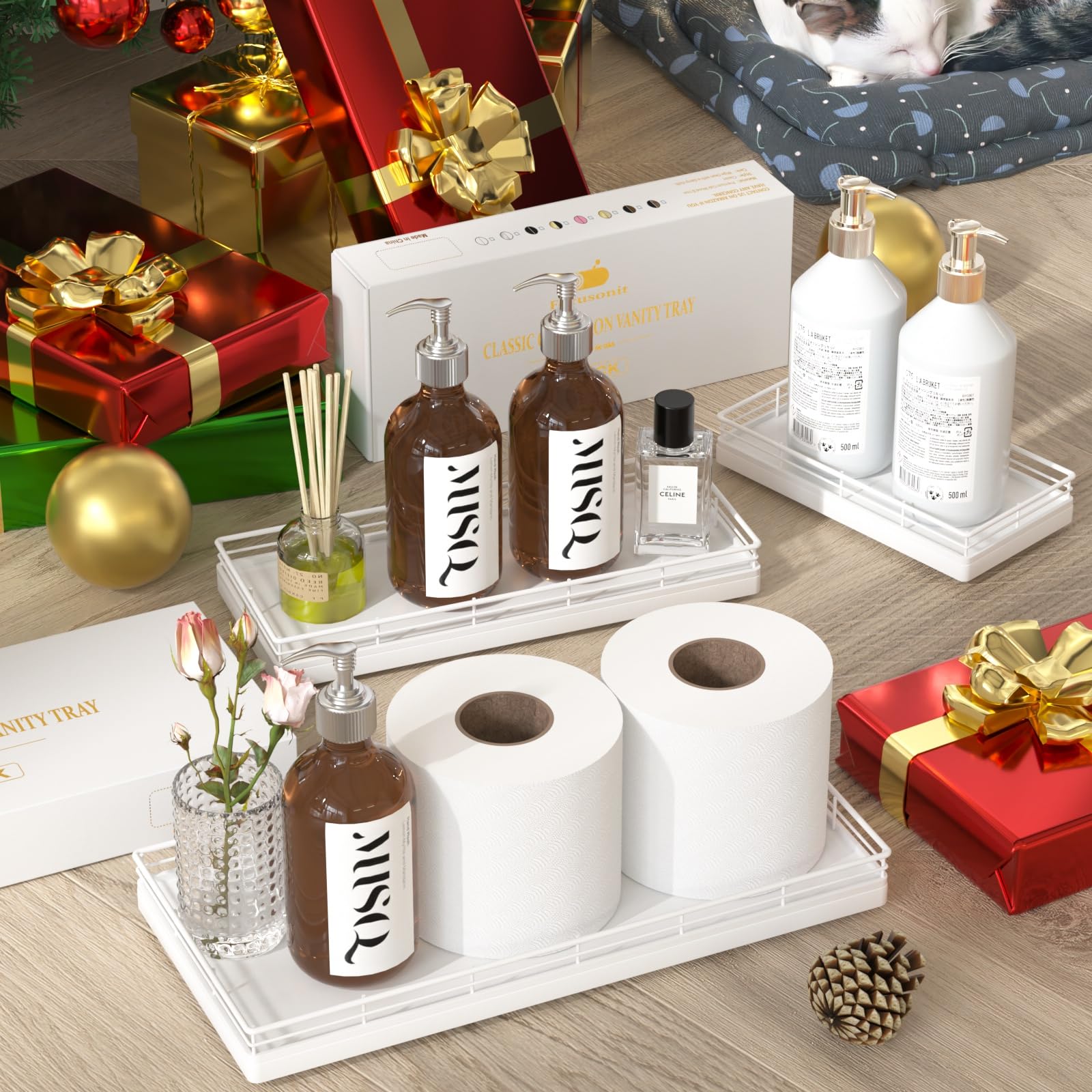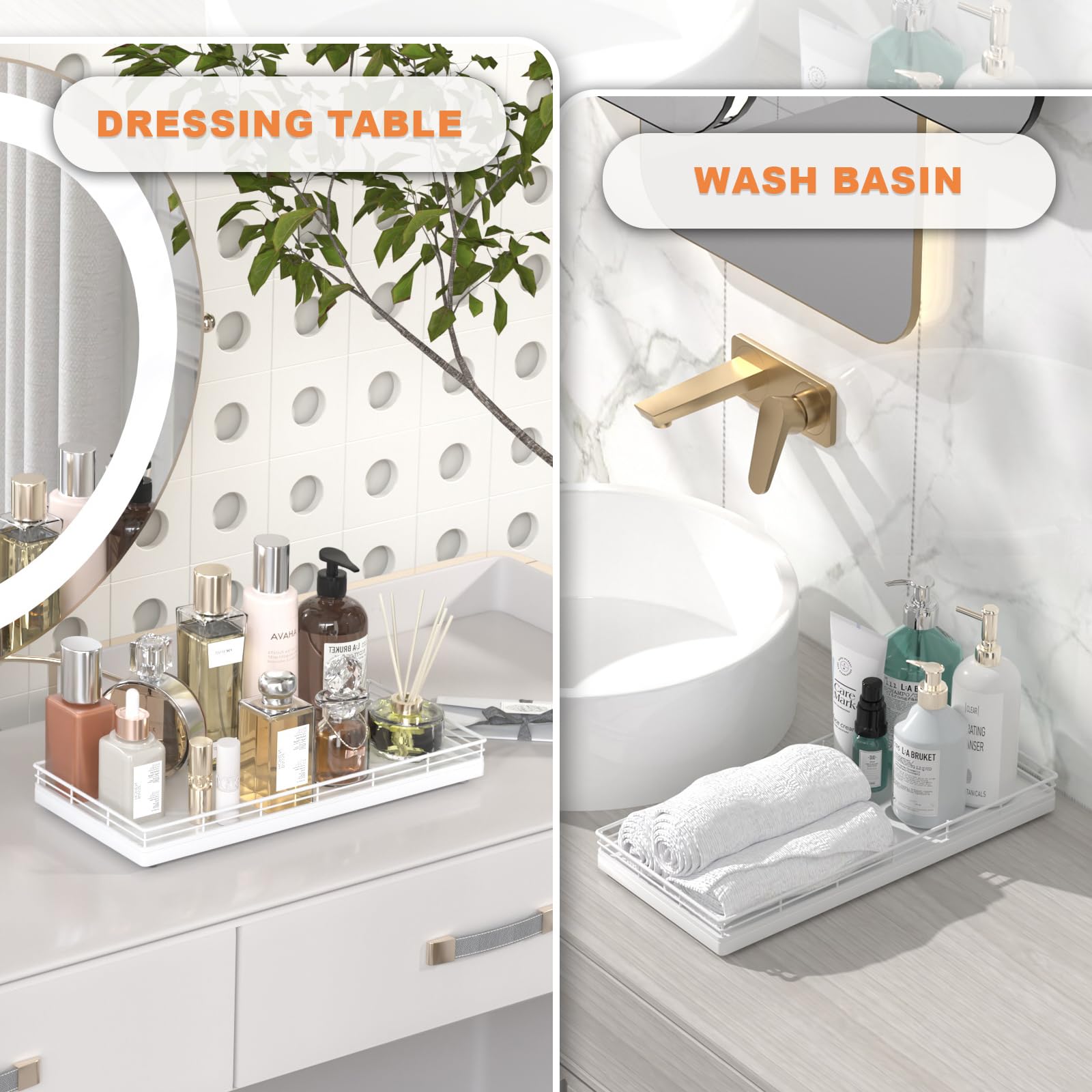 Considerate Design: This bathroom trays for counter is ready to use without any installation required; Upgraded embedded welding design enhances stability and aesthetics; Raised edge prevent items from slipping; 4 non-slip pads on the bottom protect surfaces from scratches; Simplify your cleaning routine with just a quick wipe-down using a damp cloth, saving you time and hassle