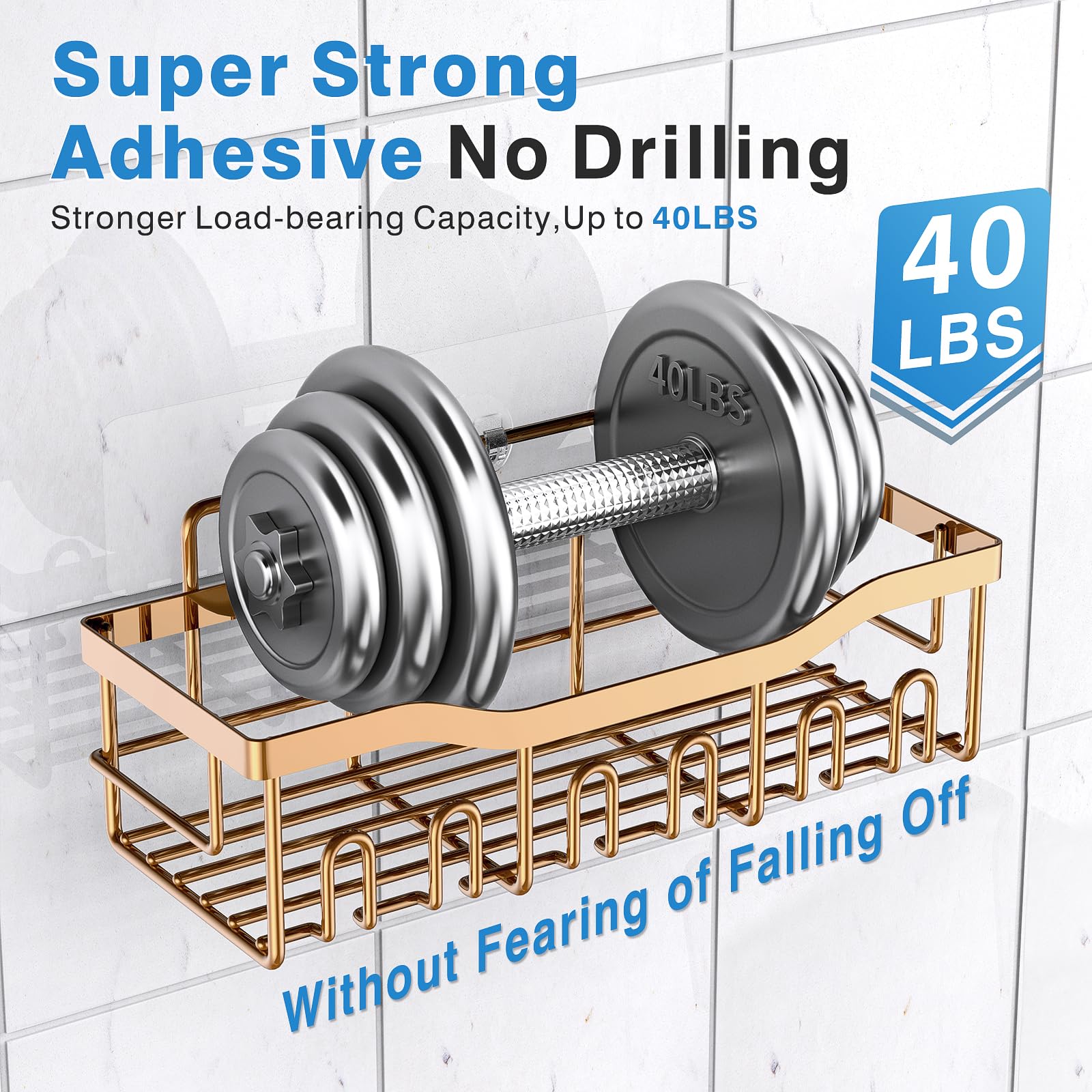 Stronger Adhesive for Easy Installation,No Drilling:Installation only takes a few minutes, requiring no drilling holes or any tools and doing no damage to the wall. Clean the surface, stick the adhesives to the wall, and hang the shower shelves to use. Suitable for smooth surfaces like tiles/marble/glass/metal, but not for uneven surfaces like painted walls.