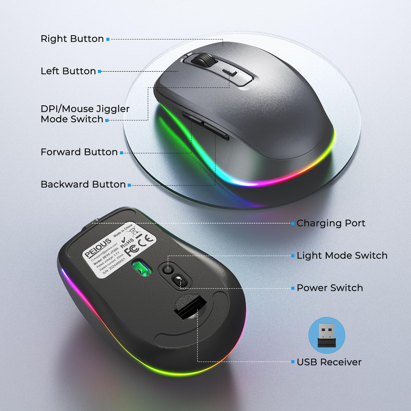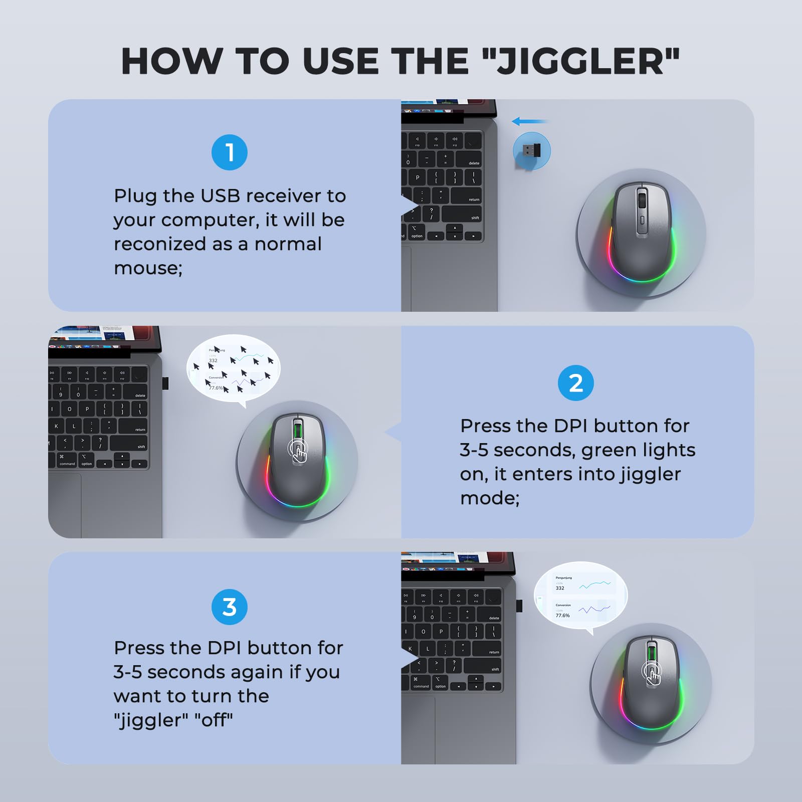 Light Up Mouse & Mouse wiggler 2 In 1 -- If you working from home and was tired of being a slave to your computer, this mouse and jiggler in 1 could be your choice, just press and hold the DPI button 3-5seconds to set it on jiggler mode to keep your computer from locking when you have to step away