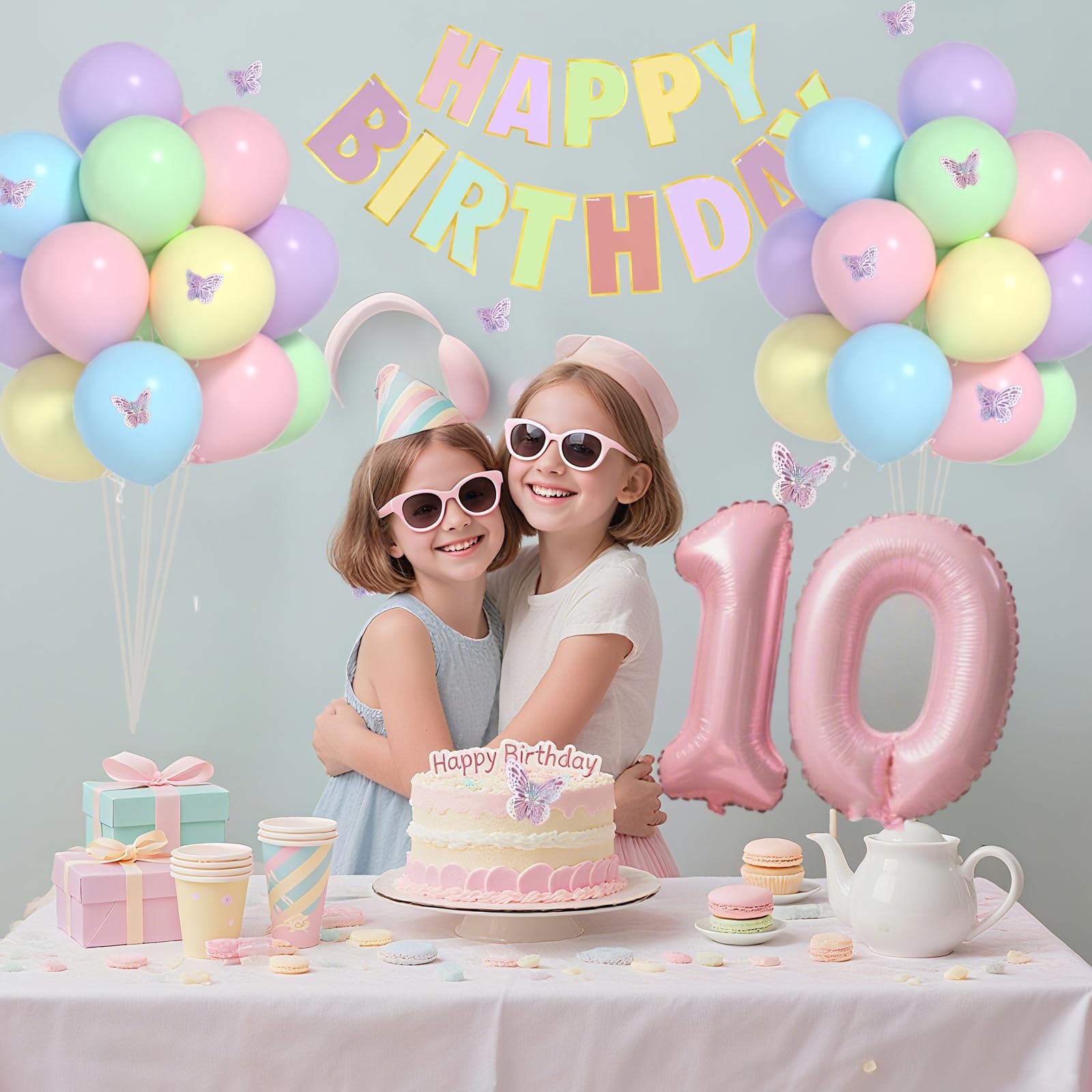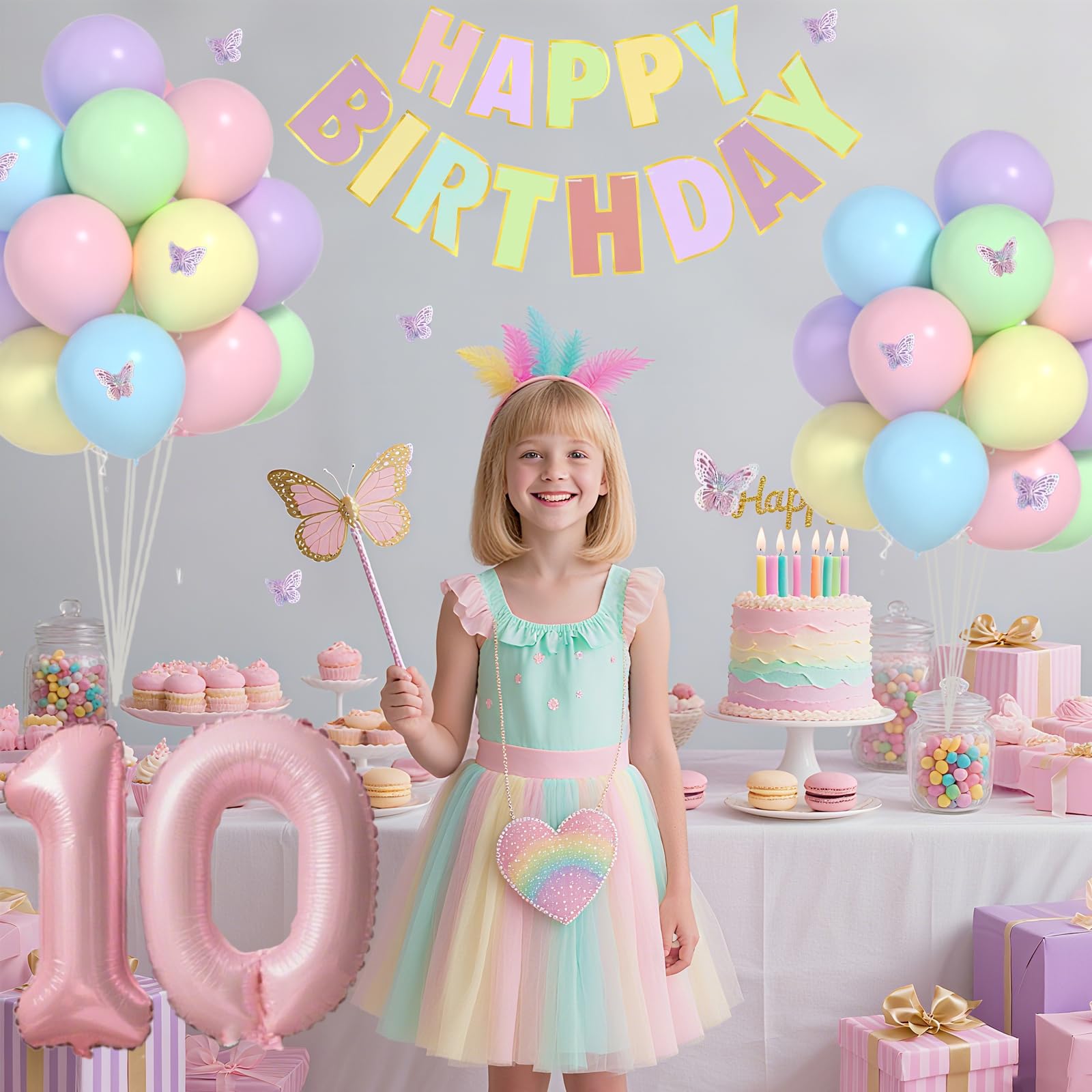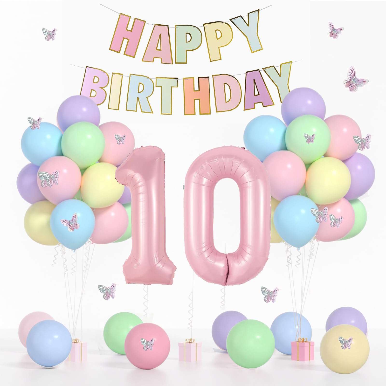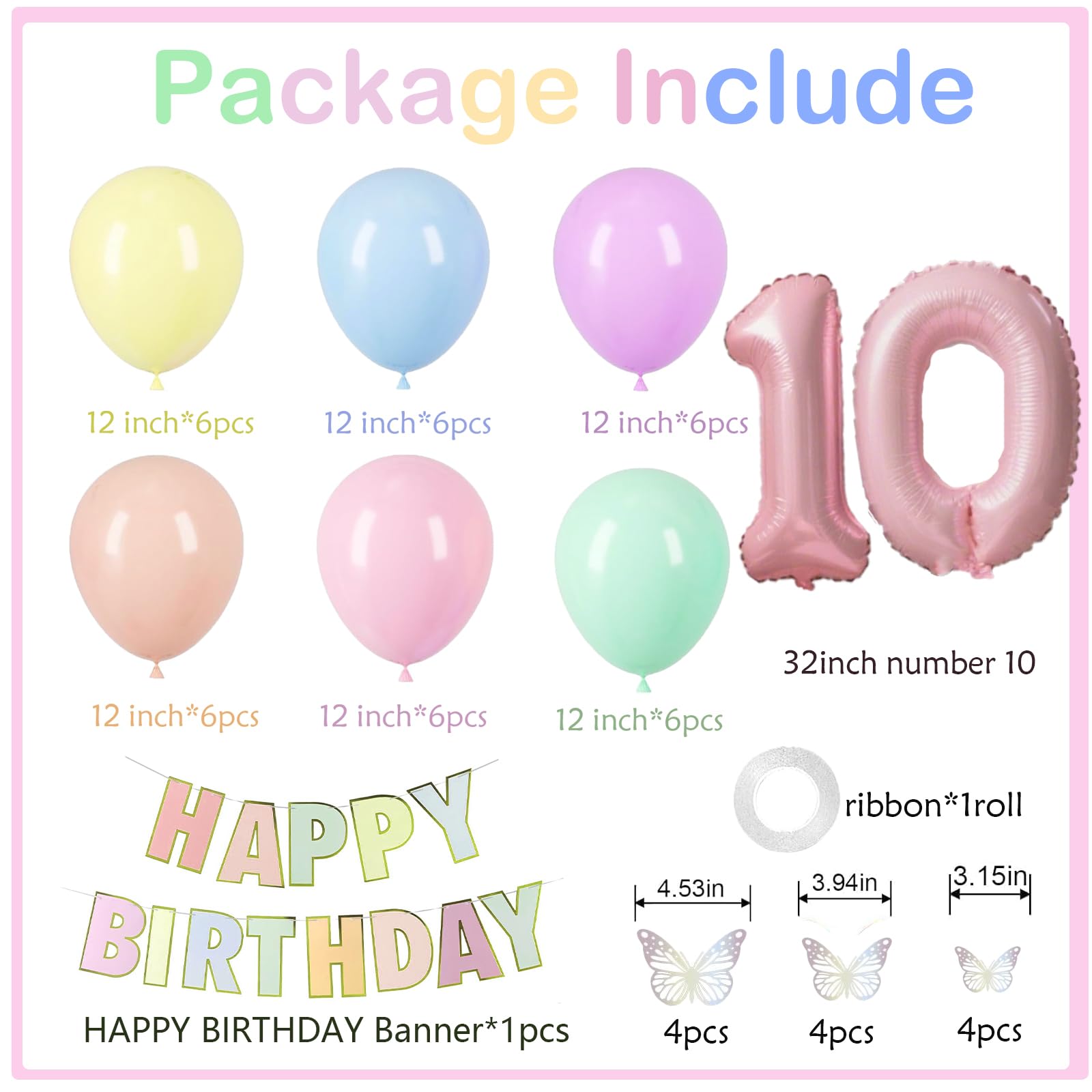 【VALUABLE PACK】41pcs 10th birthday decorations girl include: 32inch Pink 10 balloon, Macaron HAPPY BIRTHDAY banner, 12inch balloons(pink/orange/yellow/green//blue/purple) each color x 6pcs, 3D butterflies stickers and 1 roll ribbon.
