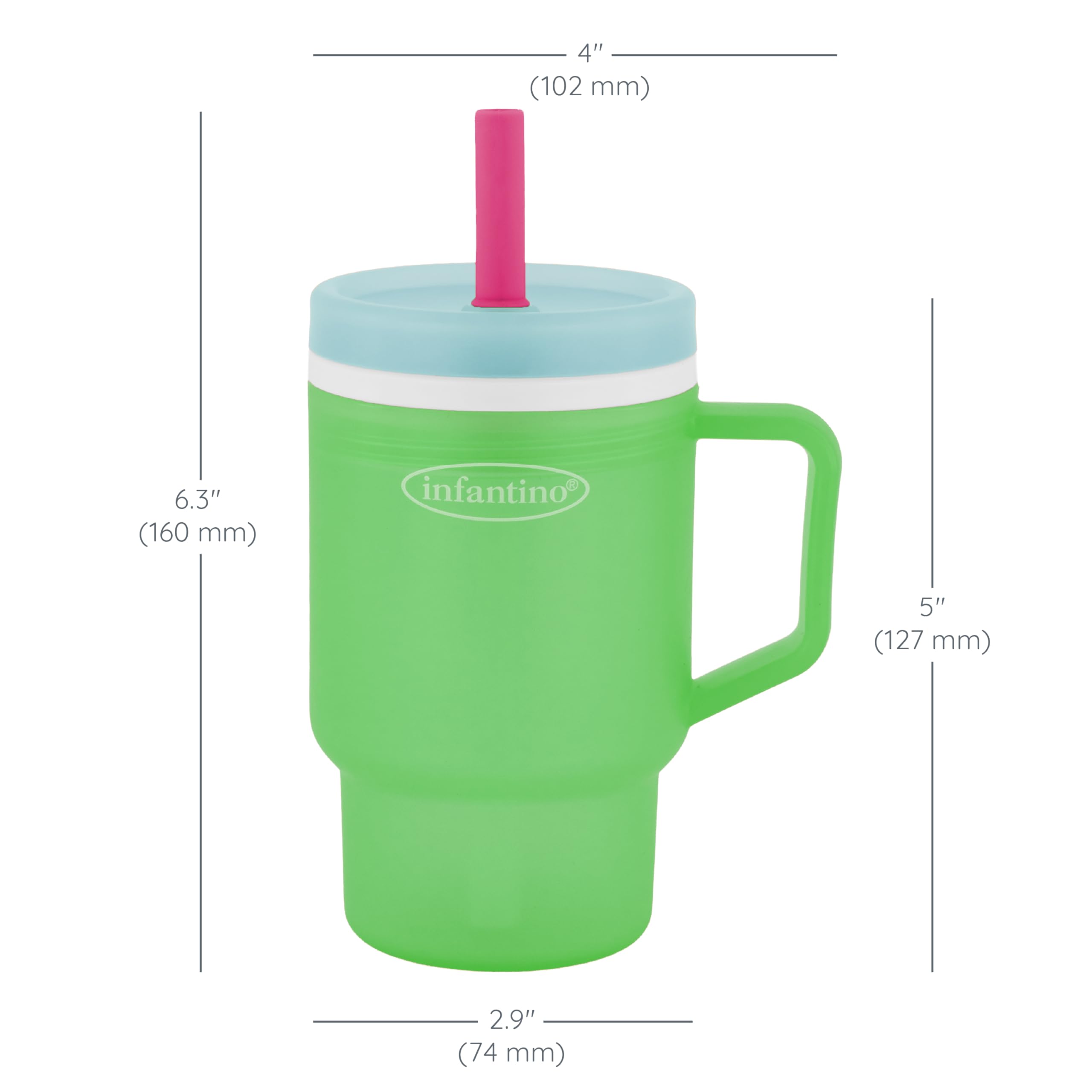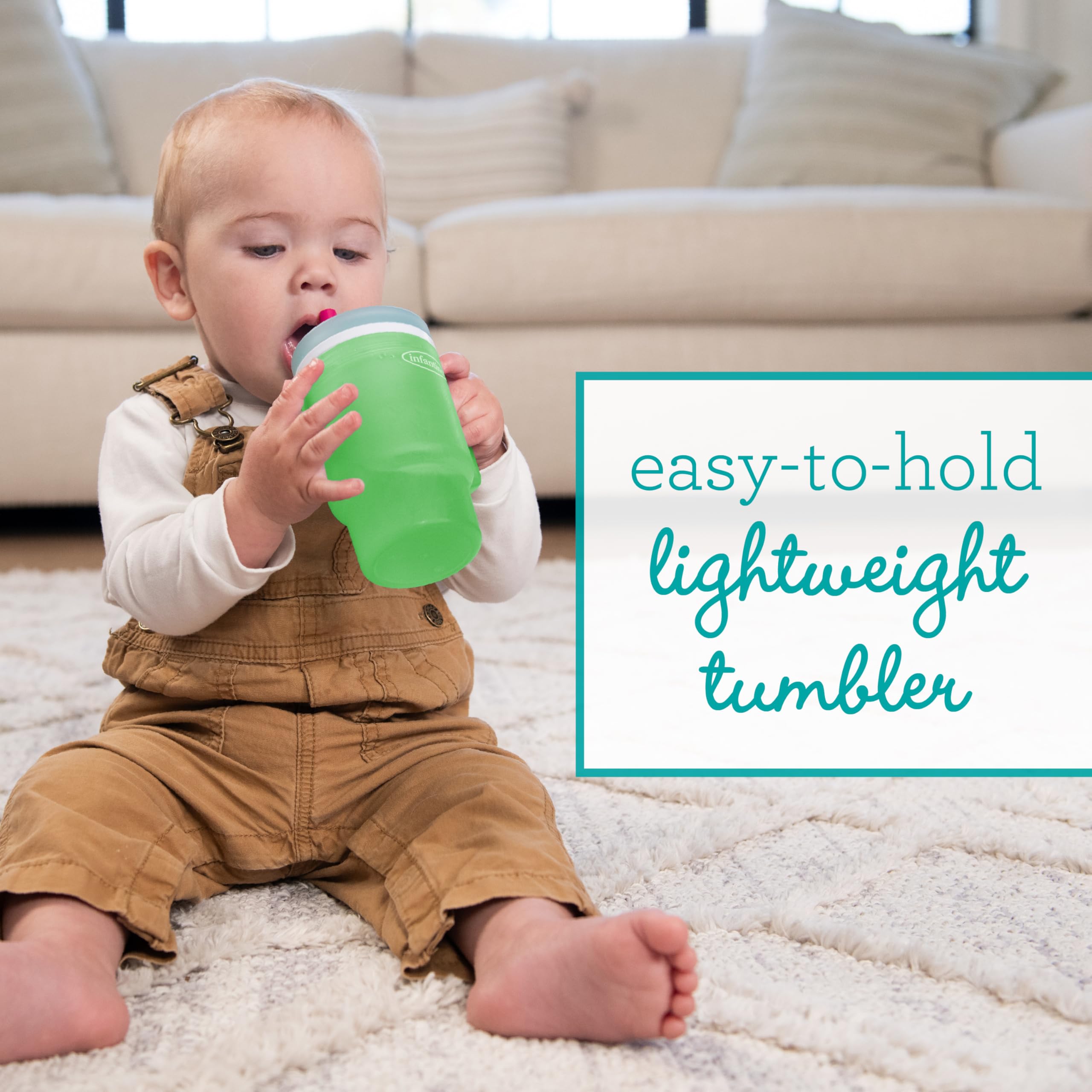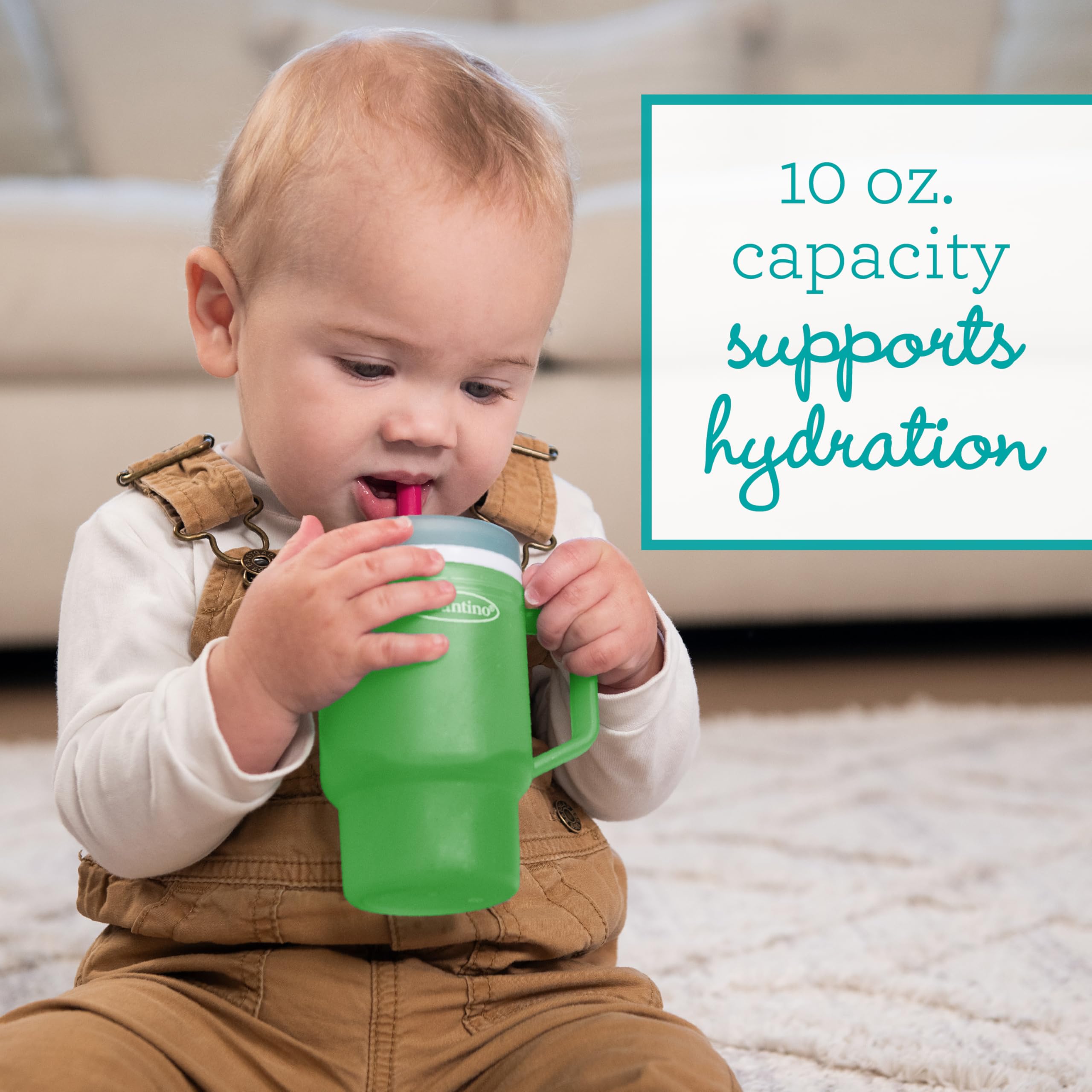 The Infantino My 1st Tumbler is a baby-friendly durable plastic sippy cup that looks just like Mom’s favorite tumbler – only perfectly sized for little hands. With a soft, flexible design and 10oz capacity, it’s made to help babies build sipping skills while feeling just like the grown-ups. Crafted from 100% food-grade, BPA-free plastic, this tumbler features a sturdy handle and a soft straw with an internal valve that allows smooth sipping and helps prevent spills – even when turned upside down. The no-pull-out straw stays secure for baby but comes apart easily for parents to clean. Perfect for water, milk, or juice, this baby tumbler fits most stroller and car seat cup holders and packs easily into a diaper bag. Dishwasher safe and made for everyday use, it’s a stylish, smart essential for keeping little ones hydrated wherever the day takes you.
