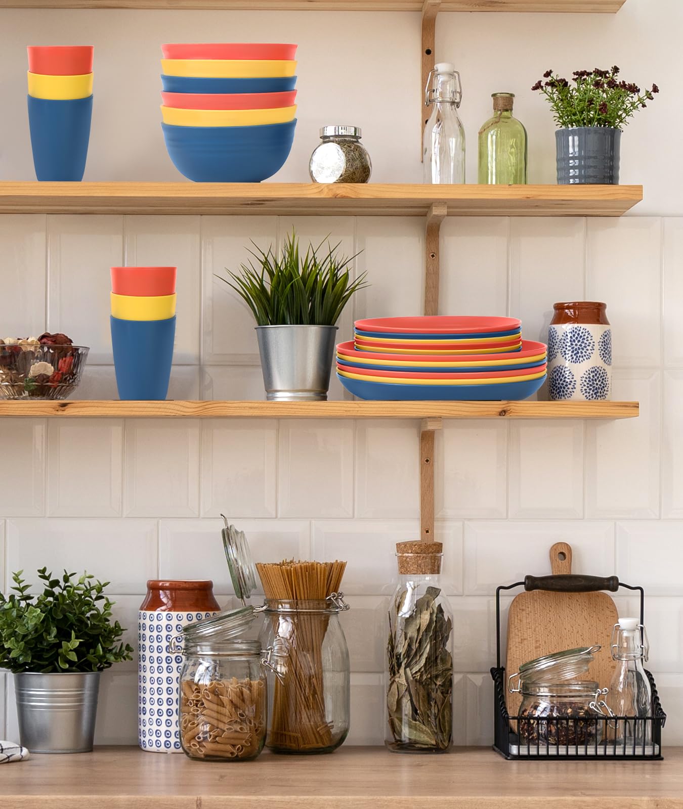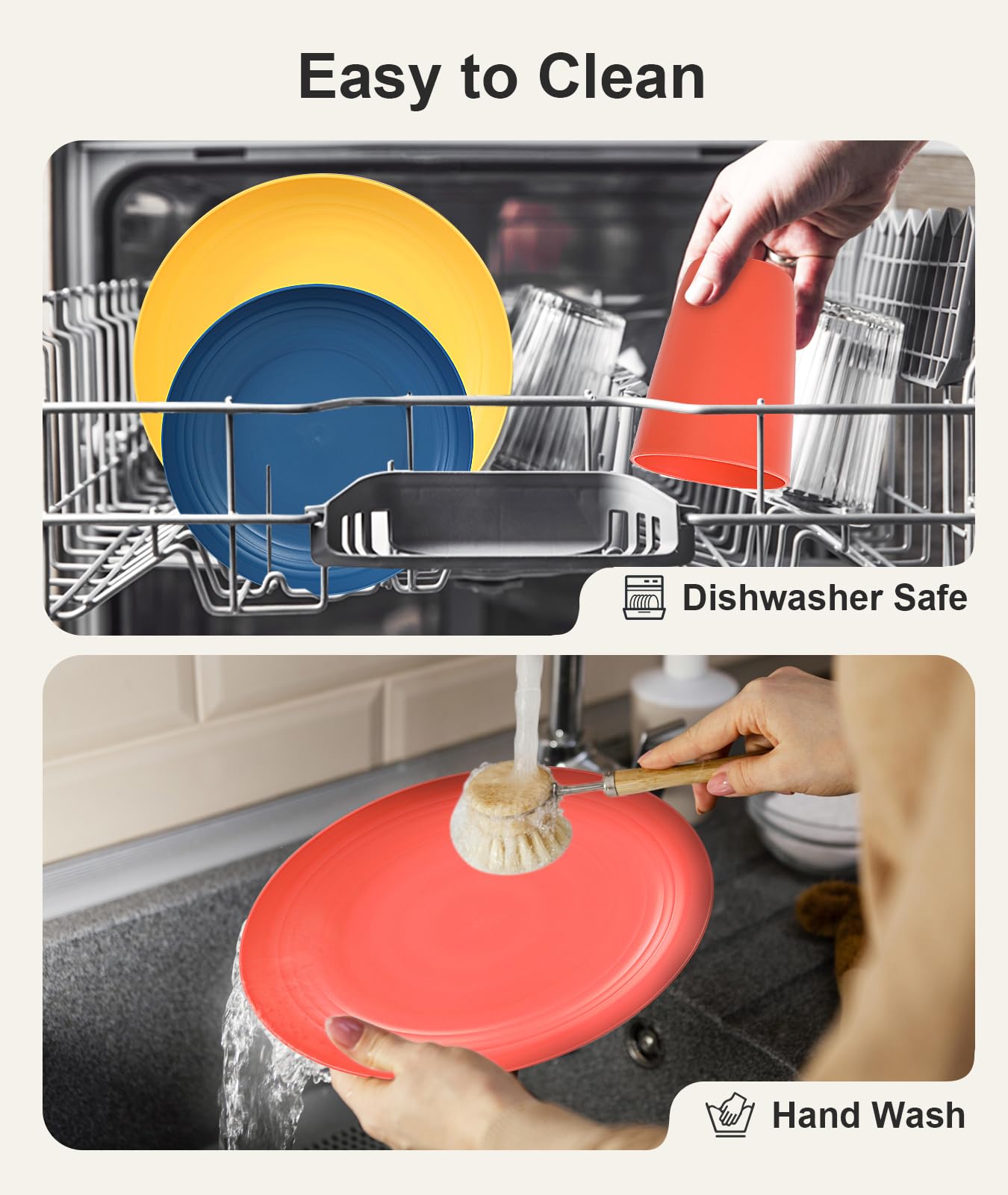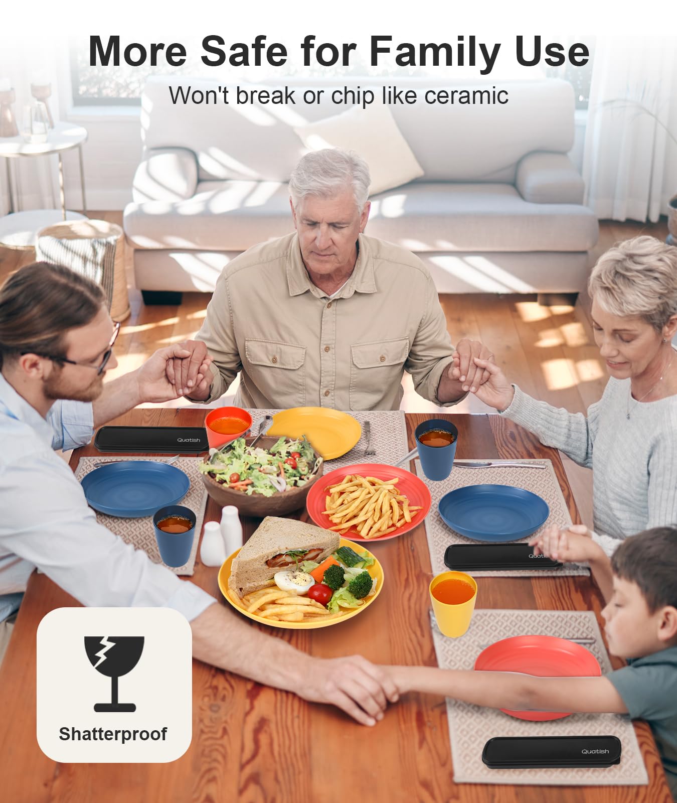 Durable and Kid-Friendly: Nearly unbreakable, shatterproof plastic dinnerware set with raised edges, resistant to chipping, scratches, and wear-related damage. Ideal for camping, RVs, beach houses, and safe for toddlers and children