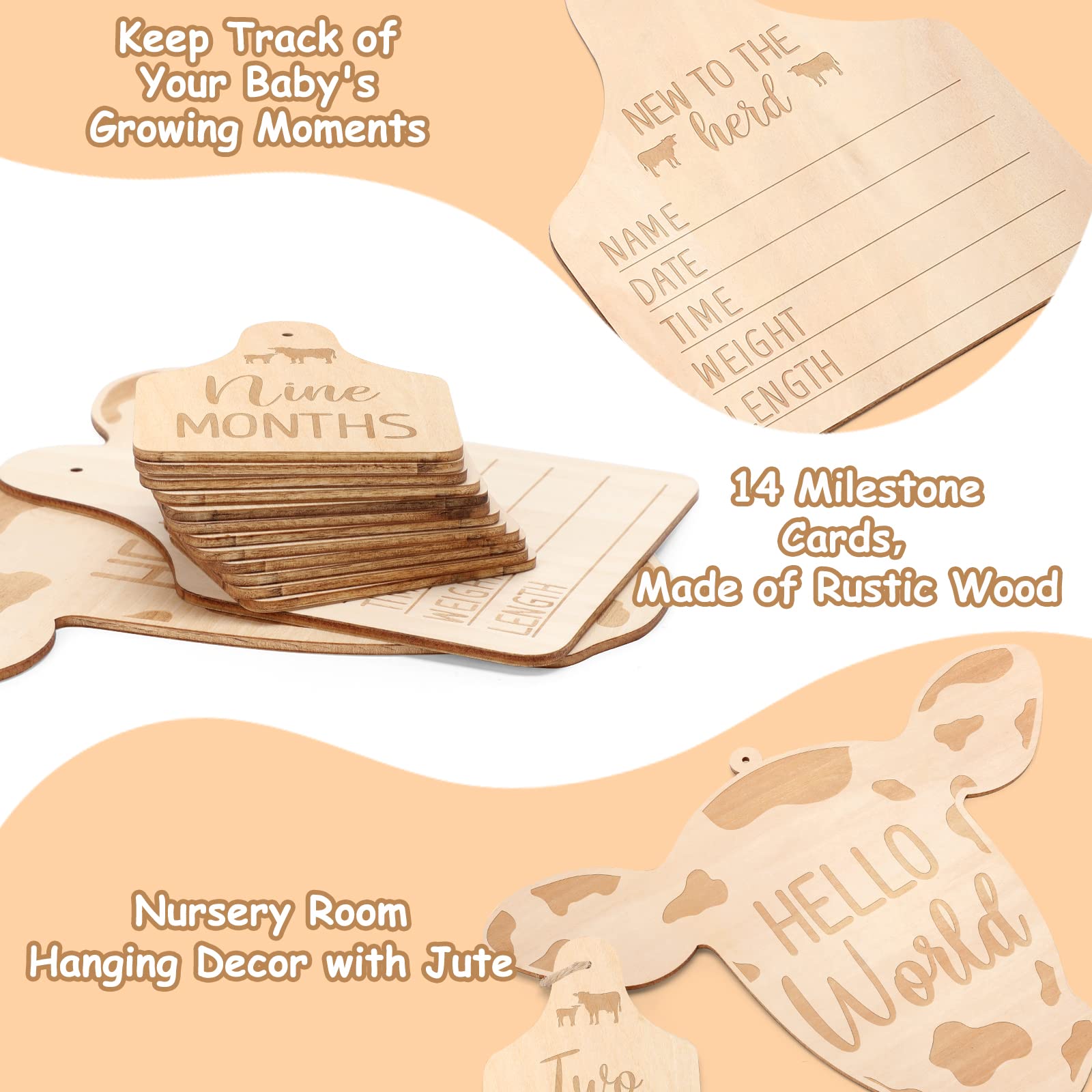 Baby Milestone Cards with More Detailed :Our baby milestone cards come in 14 pcs. In addition to 12 cards that represent the months, there is a Hello World cow head and an ear tag that records information about your baby when he or she is first born. Helps you celebrate, record and share your baby's growth.