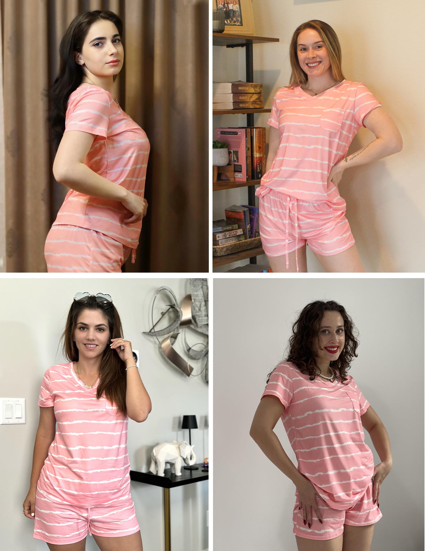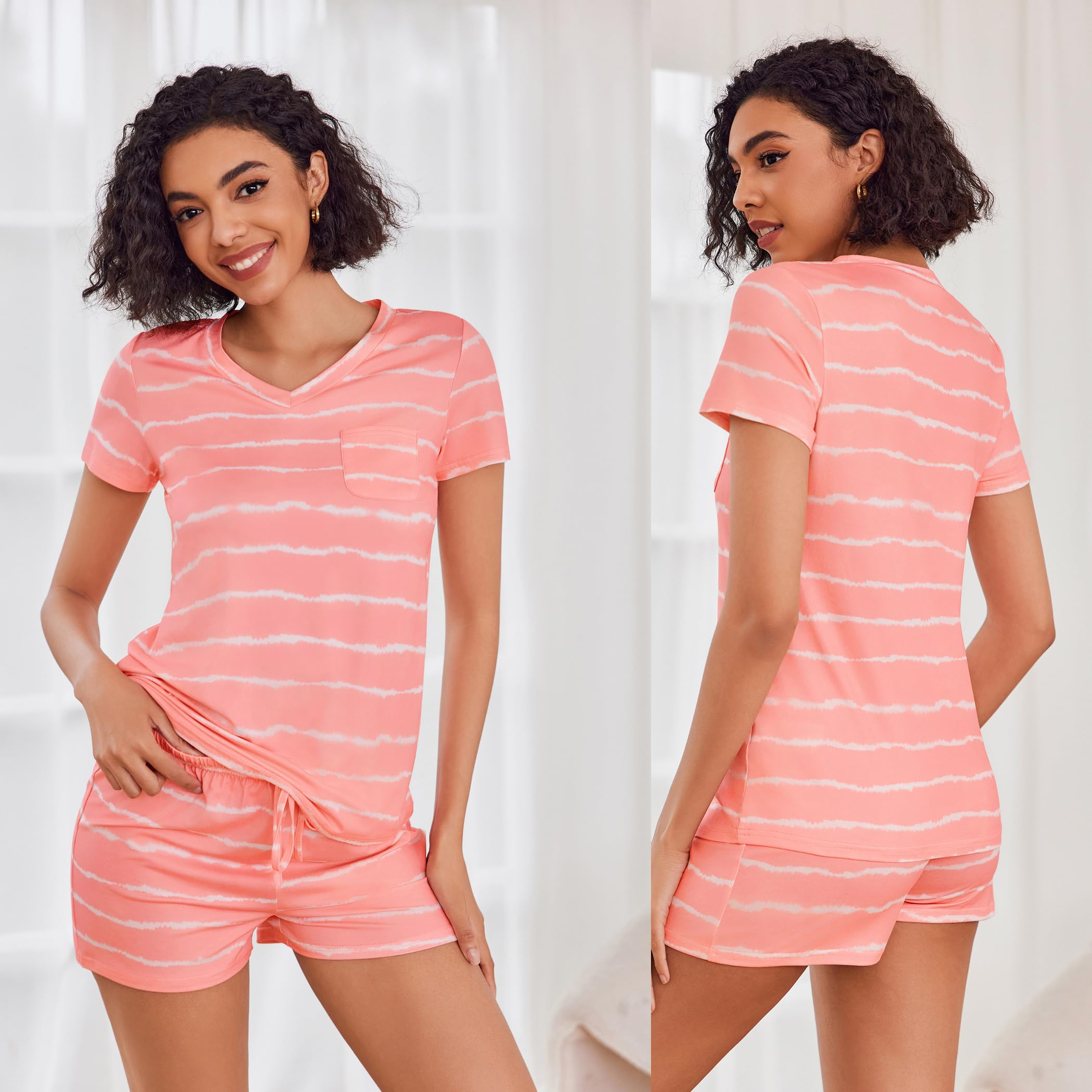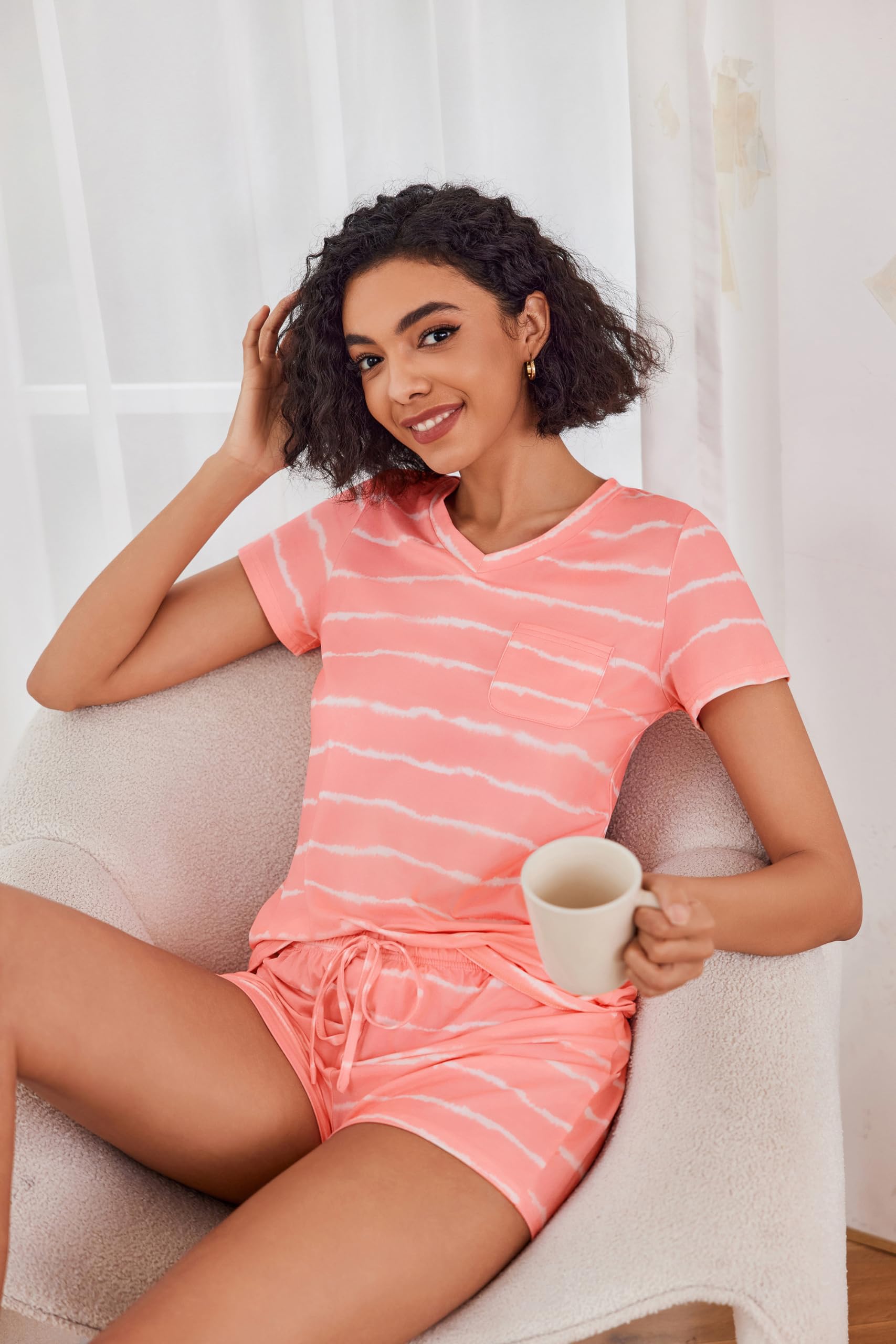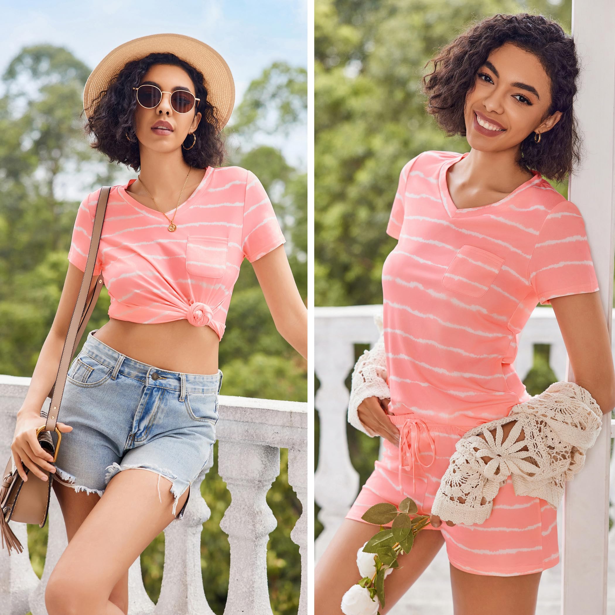 FEATURES: pajama sets for women 2 piece, pj sets for woman, V neck women's pajama sets, short sleeve T-shirt, drawstring elastic waist shorts.
