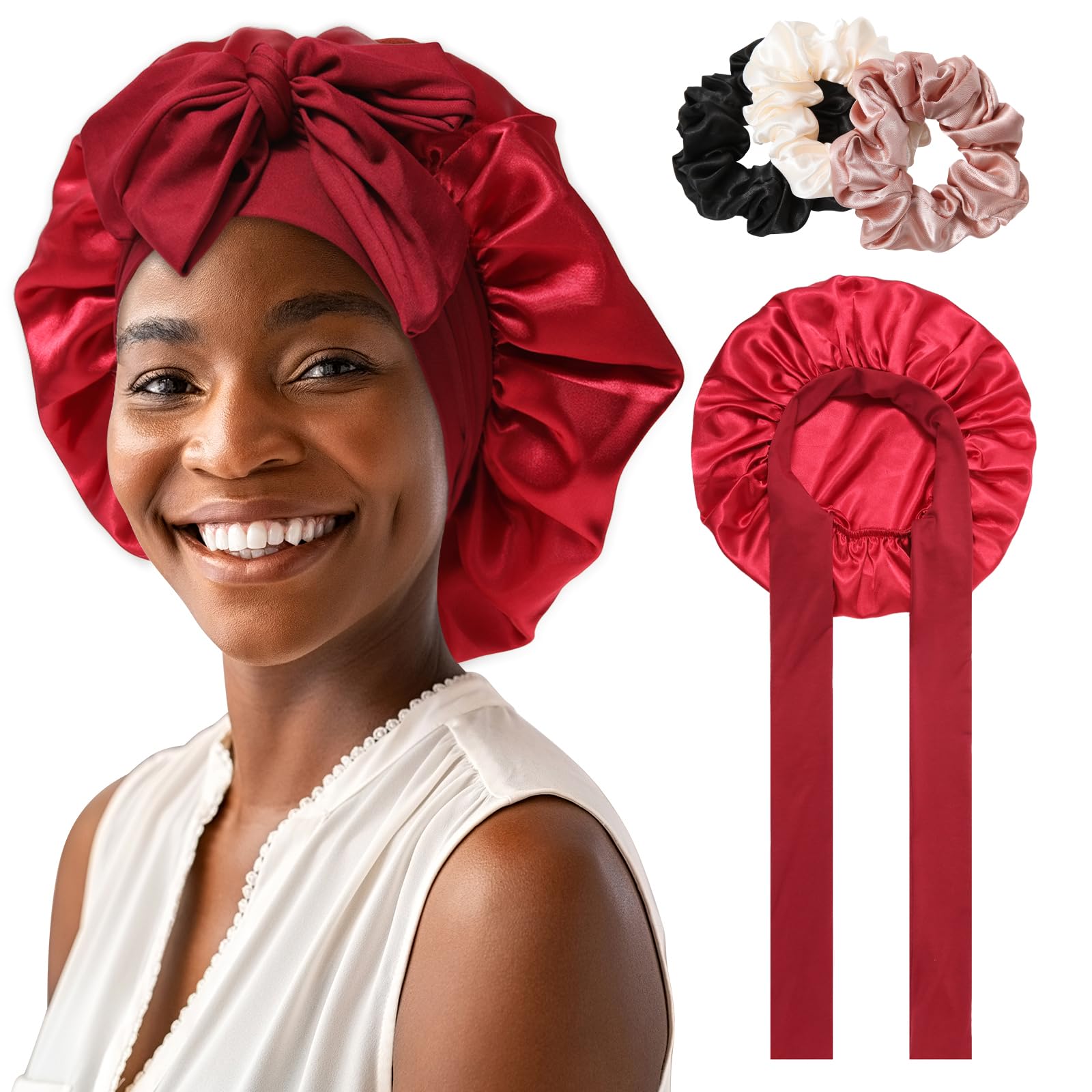WHAT WILL YOU GET - The package Contains 1 satin sleep cap bonus and 3 pcs satin hair scrunchies. The edge of the large nightcap is a wide, soft, and comfortable elastic hair band that won't leave marks on your head. Satin hair scrunchies keep hair being a hair ponytail to match this satin bonnet