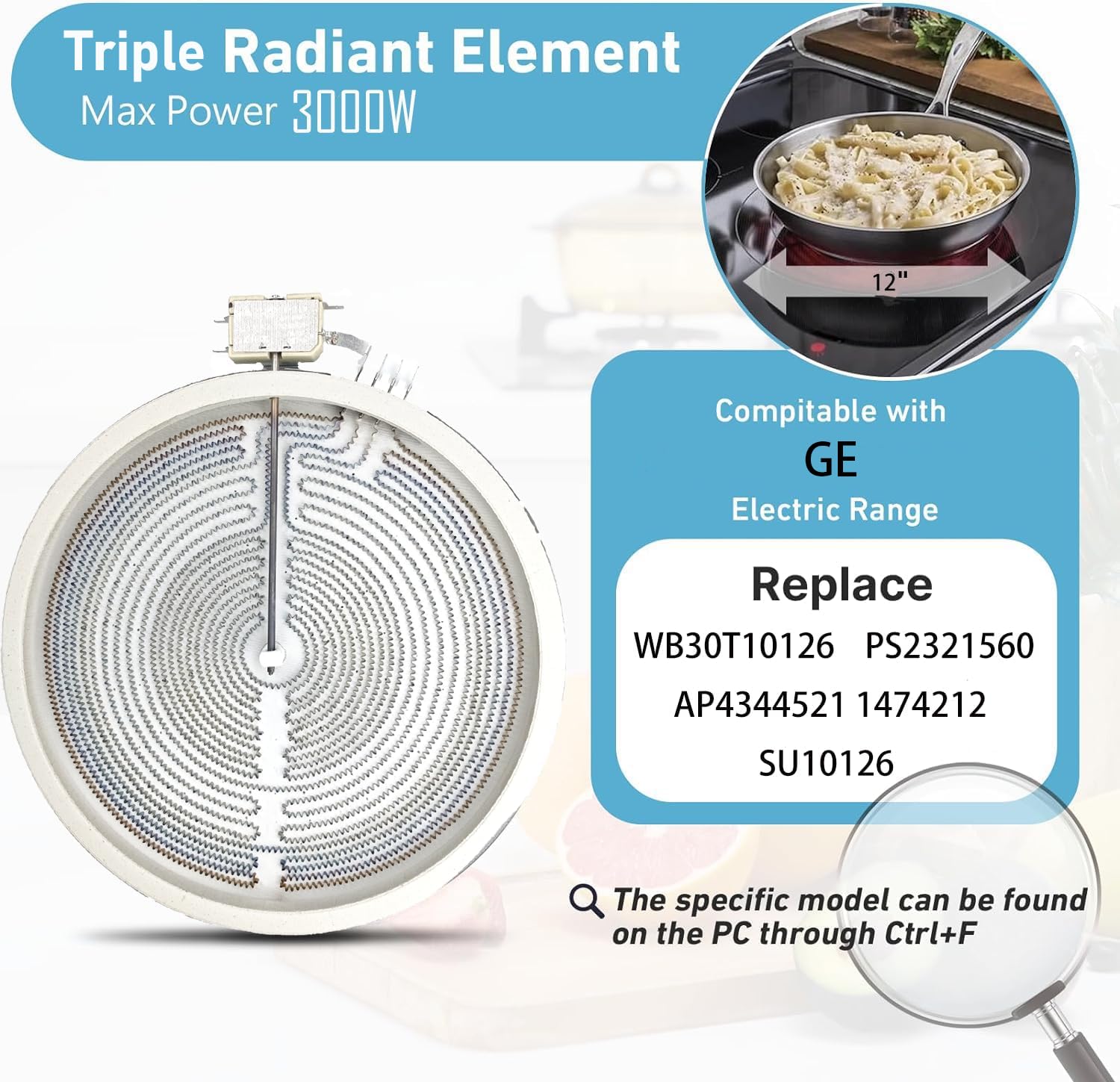 【Compatibility】WB30T10107 12" triple surface element available in 12"/9"/6" triple radiant surface, compatible with GE electric range stove. Replacement part numbers # WB30T10126, PS2321560, AP4344521, WB30T10107, AP3883671 and PS1018895.