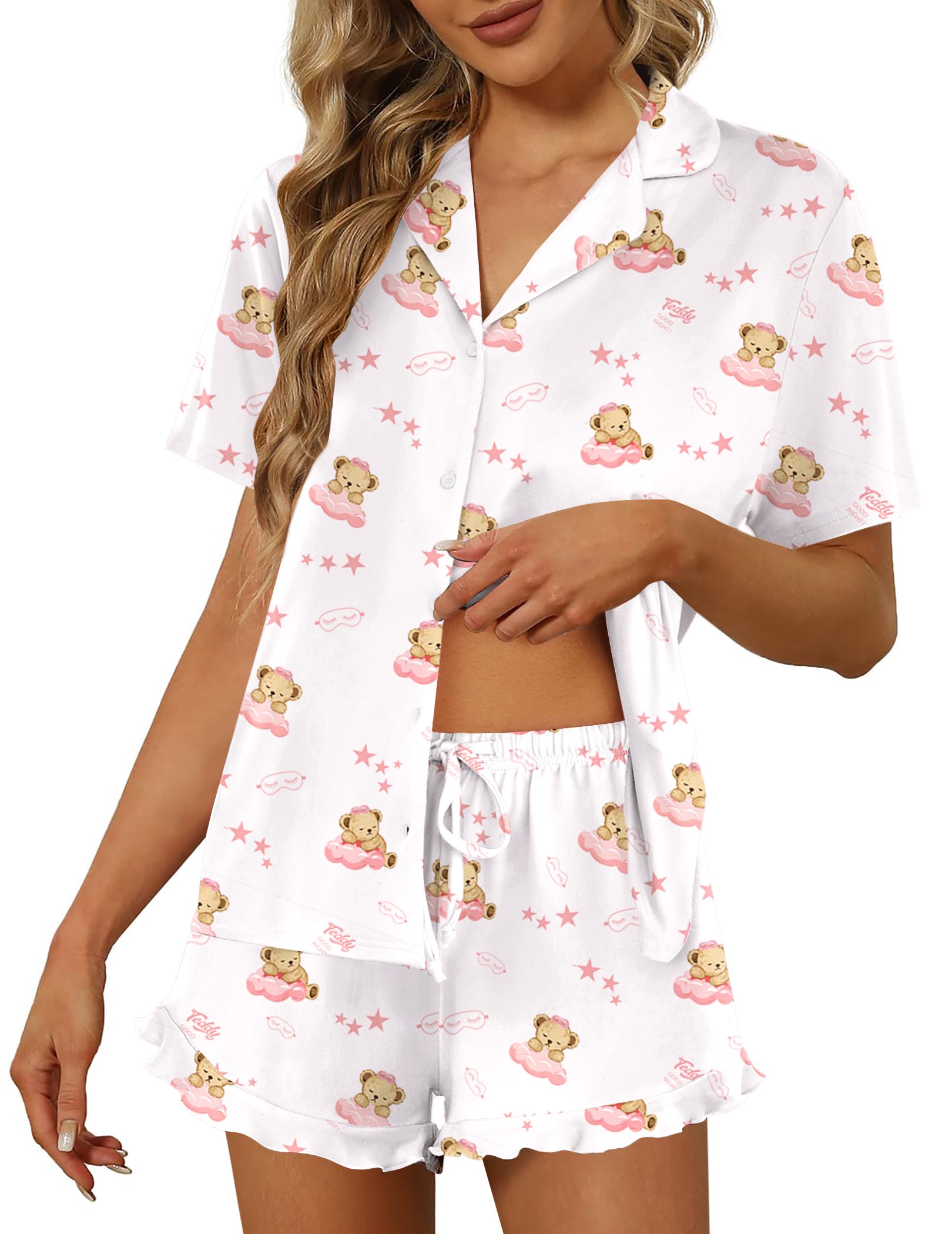 【Pajama Top】:Women's short sleeve pajamas set with solid color, sleepshirt hits at hip , turn-down collar, Full Button Design is easy to put on and take off