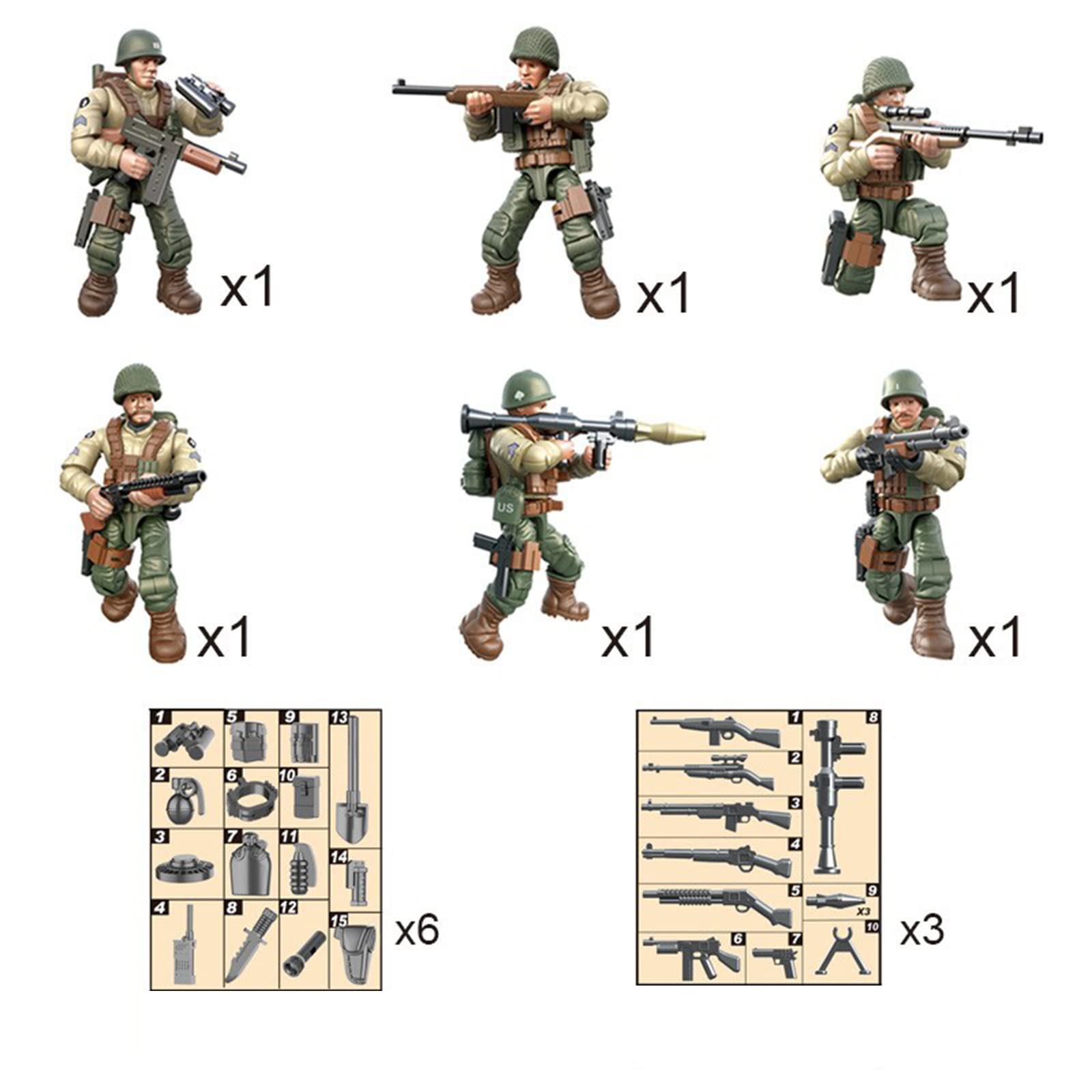 SUPER VALUABLE PACK : Each set contains 6 Soldier construction action figures in different shapes, with a variety of Swat team prop accessories : weapons,guns,Outfits, firearms, holsters, cuffs, grenade, heavy body armor, ballistic shields, entry tools, advanced night vision optics, and surveillance equipment and many more.Imagine creating battles with minifigure decorations.