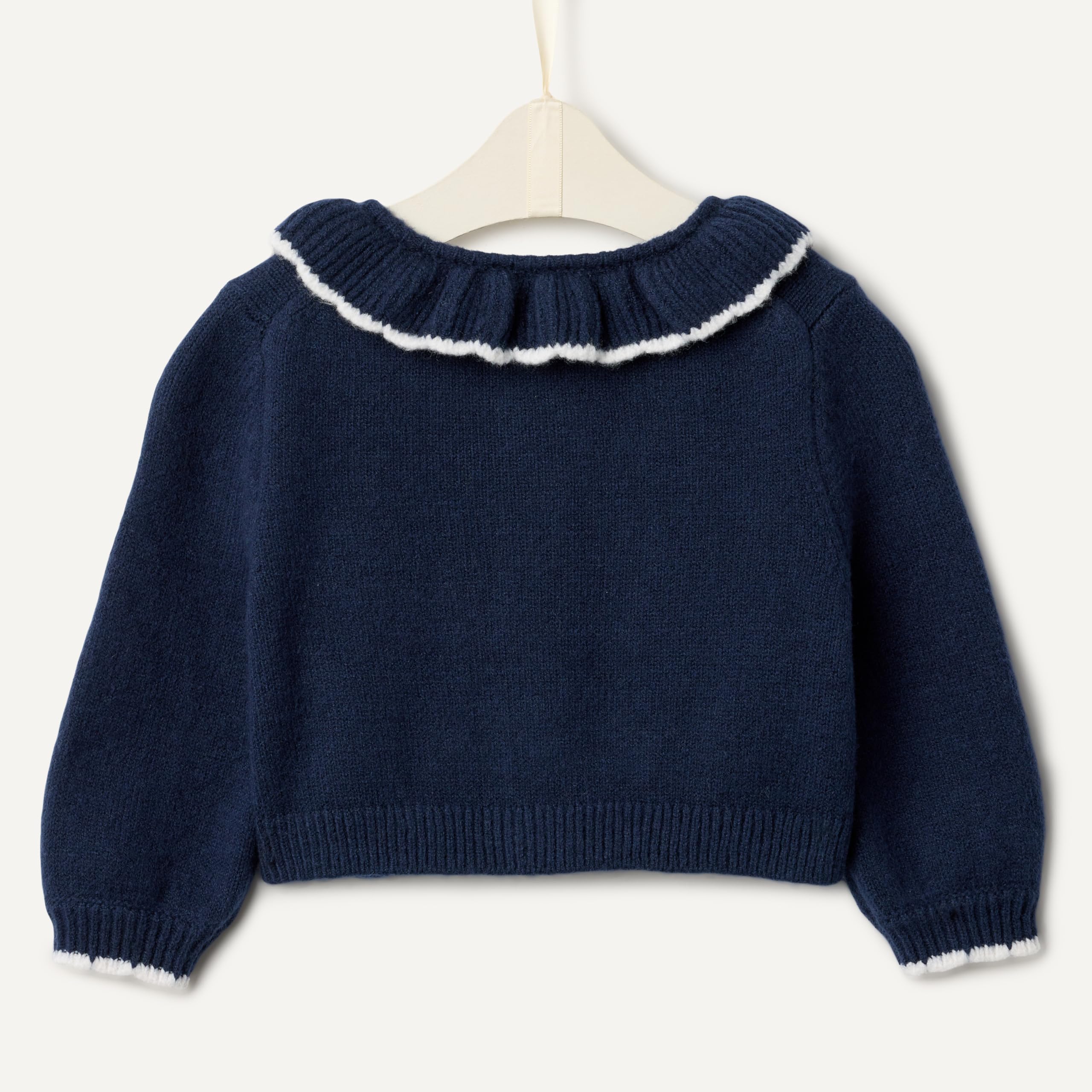 DETAILS: Ruffle neck with contrast tipping, button-front placket, rib detailing at cuffs and hem
