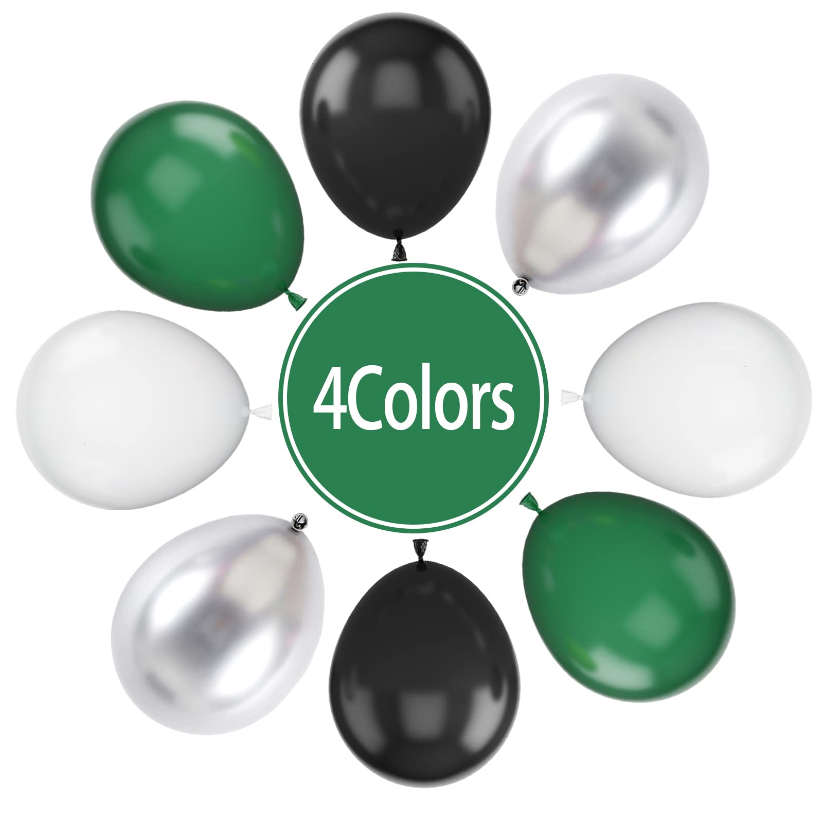 Mixed Balloons Set: The 12 inch green black silver balloons set includes 15pcs dark green balloons, 15pcs black balloons, 15pcs metallic silver balloons, 15pcs white balloons, 2 roll of ribbon. 62pcs in total. A variety of green black latex balloons set is suitable for your beautiful art theme decoration.