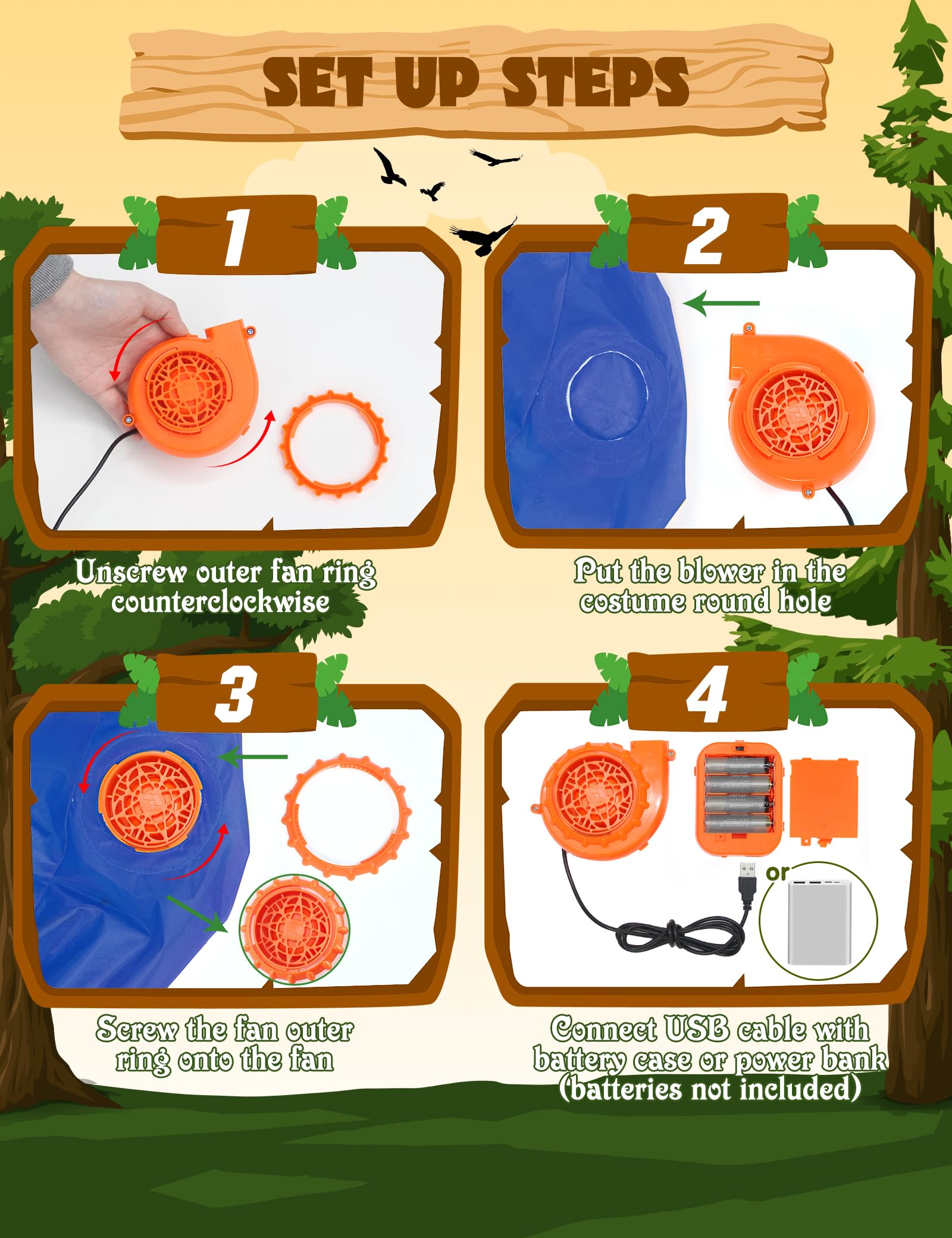 Installation & Precautions: Screw the fan onto costume. The fan requires 4 AA batteries (not included). The fan also has a USB interface, that means you can also connect the USB port of the fan into your power bank to make the charging more stable and continuous, and the blasting effect is stronger. Please do not put battery pack in your own pocket or the device can overheat and burn your leg