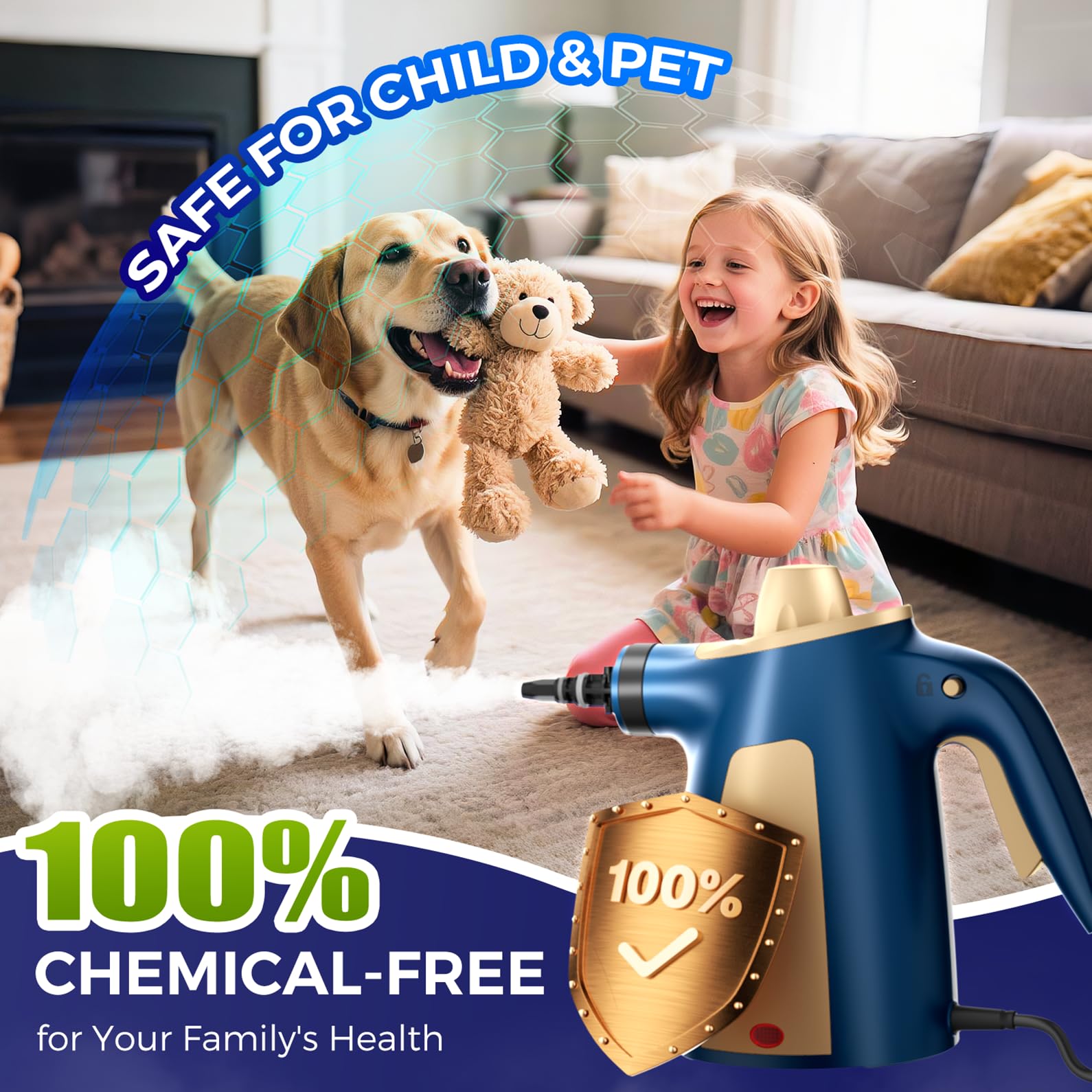 【Chemical-Free & Eco-Friendly】Say goodbye to harsh chemicals! Our steam cleaner for home relies solely onpure, high-pressure steam—no chemical additives needed. It physically lifts away stains and dirt, for a deeper clean, offering a completely eco-friendly cleaning experience. This ensures a safe and healthy living environment for you and your family. Ideal for households with children and pets, to chemical products, it leaves no harmful residues behind on surfaces