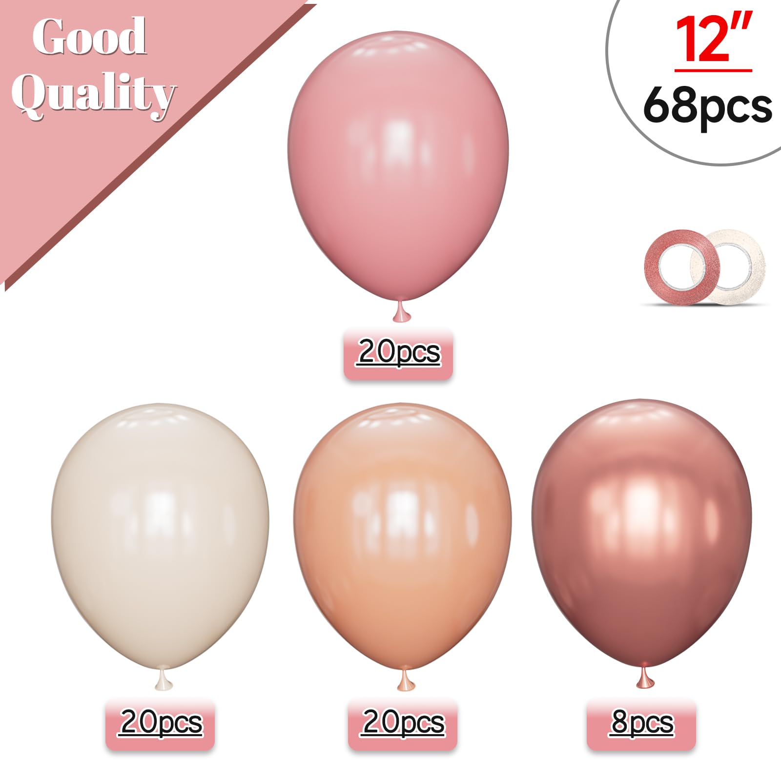 Simple balloon pack: Contains 68 pieces of 12-inch latex balloons, including 20 blush pink balloons, 8 metallic rose gold balloons, 20 white sand (nude )balloons, 20Beige balloons.