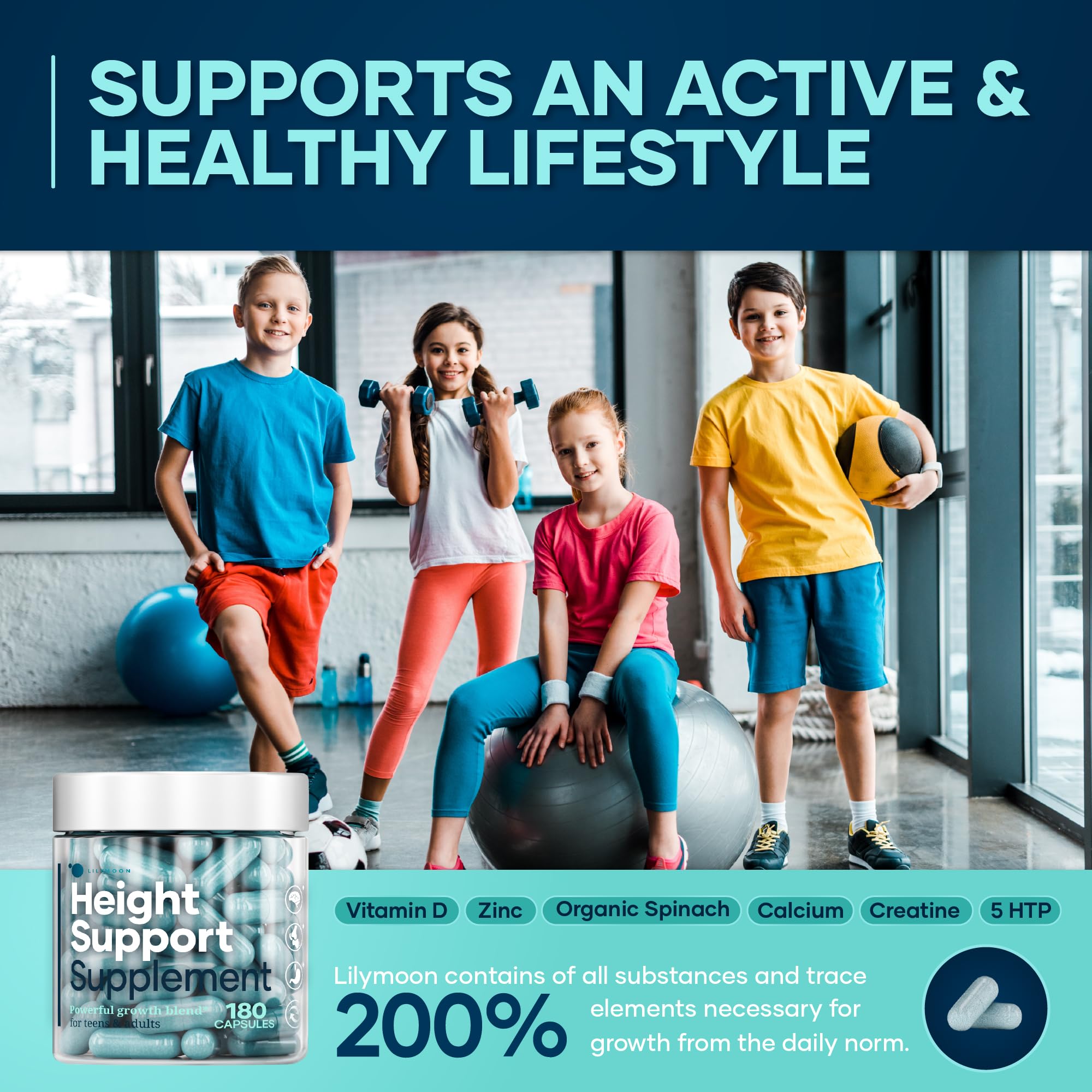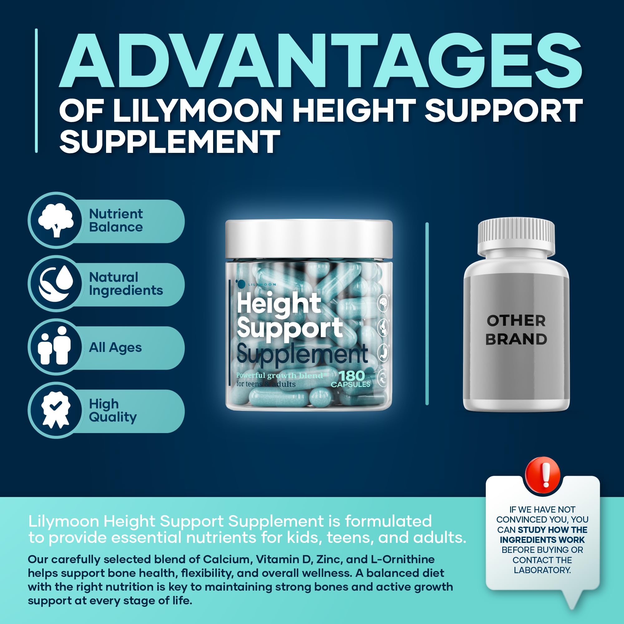 Nutritional Support for Growing Kids & Teens - Lilymoon Height & Bone Support Supplement is formulated to provide essential nutrients for kids boys & girls, teens, and adults. Our carefully selected blend of Calcium, Vitamin D 1000 IU, Zinc 10mg, and L-Ornithine helps support bone health, flexibility, and overall wellness. A balanced diet with the right nutrition is key to maintaining strong bones and active growth support (suplementos para crecer de altura) at every stage of life.