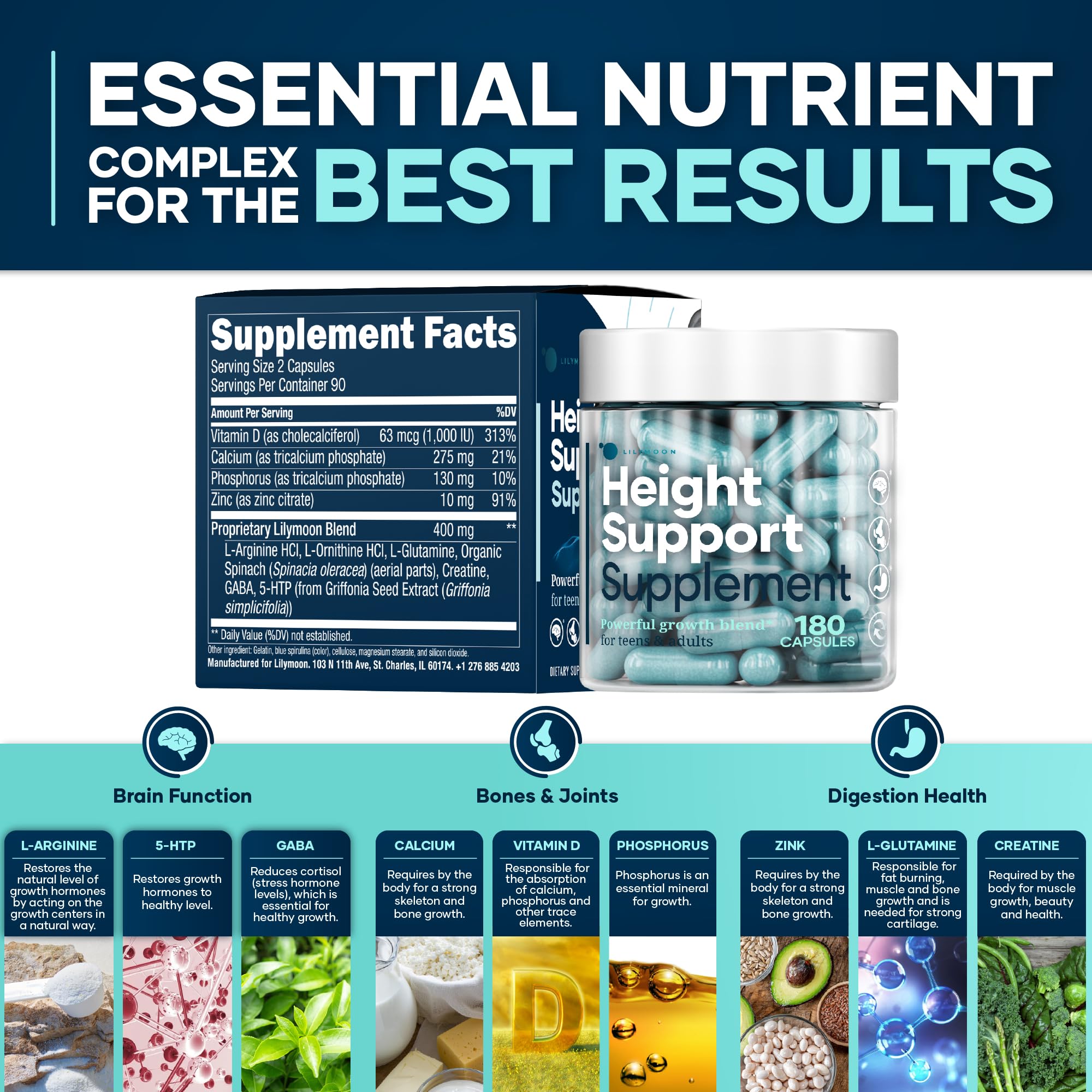 Made in the USA - Premium Height & Bone Support Formula - Proudly made in the USA, our bone health supplement is manufactured in a GMP-certified facility to ensure purity and safety. Lilymoon height support vitamins contain only high-quality ingredients like L-Glutamine, phosphorus and organic spinach, free from GMOs, gluten, and unnecessary additives. We are committed to providing the best supplement for bone strength, joint flexibility, and overall nutritional support.