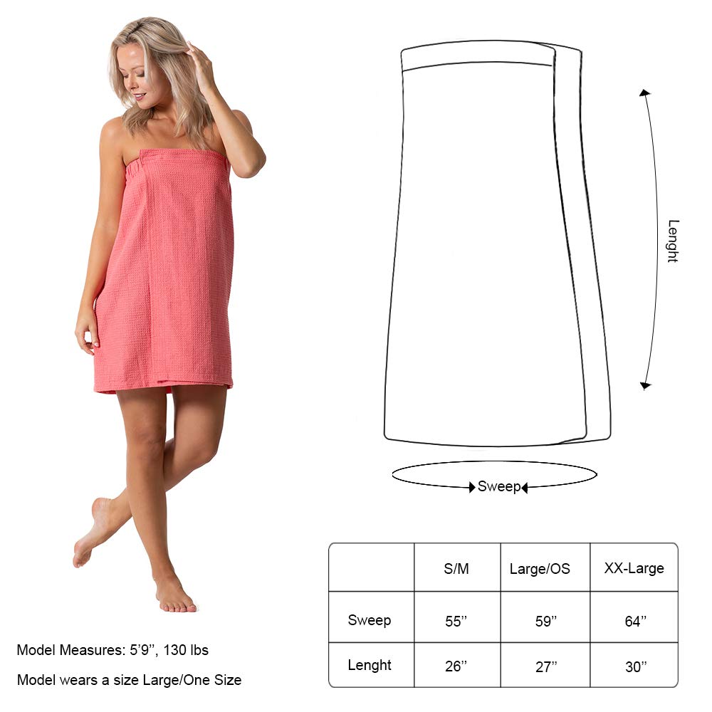Description QUICK DRY WAFFLE LINEN SPA AND BATH WRAP WITH ADJUSTABLE CLOSURE & ELASTIC TOP These waffle linen spa and bath wraps are made of 52% cotton and 48% polyester which makes them lightweight. These body wraps are smooth, breathable, highly absorbent and double-stitched for durability. Elastic band around the bath wrap that is secured with adjustable closure is going to keep you covered and comfortable. This closure adjusts the bath wrap for a perfect fit. Size Measurements Small/Medium: Length is 26’’ & Sweep is 55’’ Large/One Size: Length is 27’’ & Sweep is 59’’ XX-Large: Length is 30’’ & Sweep is 64’’ Features: Adjustable closure for different waist sizes A large selection of 15 trendy colors Machine wash cold water, tumble dry low-medium and no bleach Perfect gift for loved ones SATISFACTION GUARANTEE We deeply value our customers and our confident with our product. If you are not satisfied for any reason at all, we offer you a 30-day money back guarantee with NO QUESTIONS ASKED.