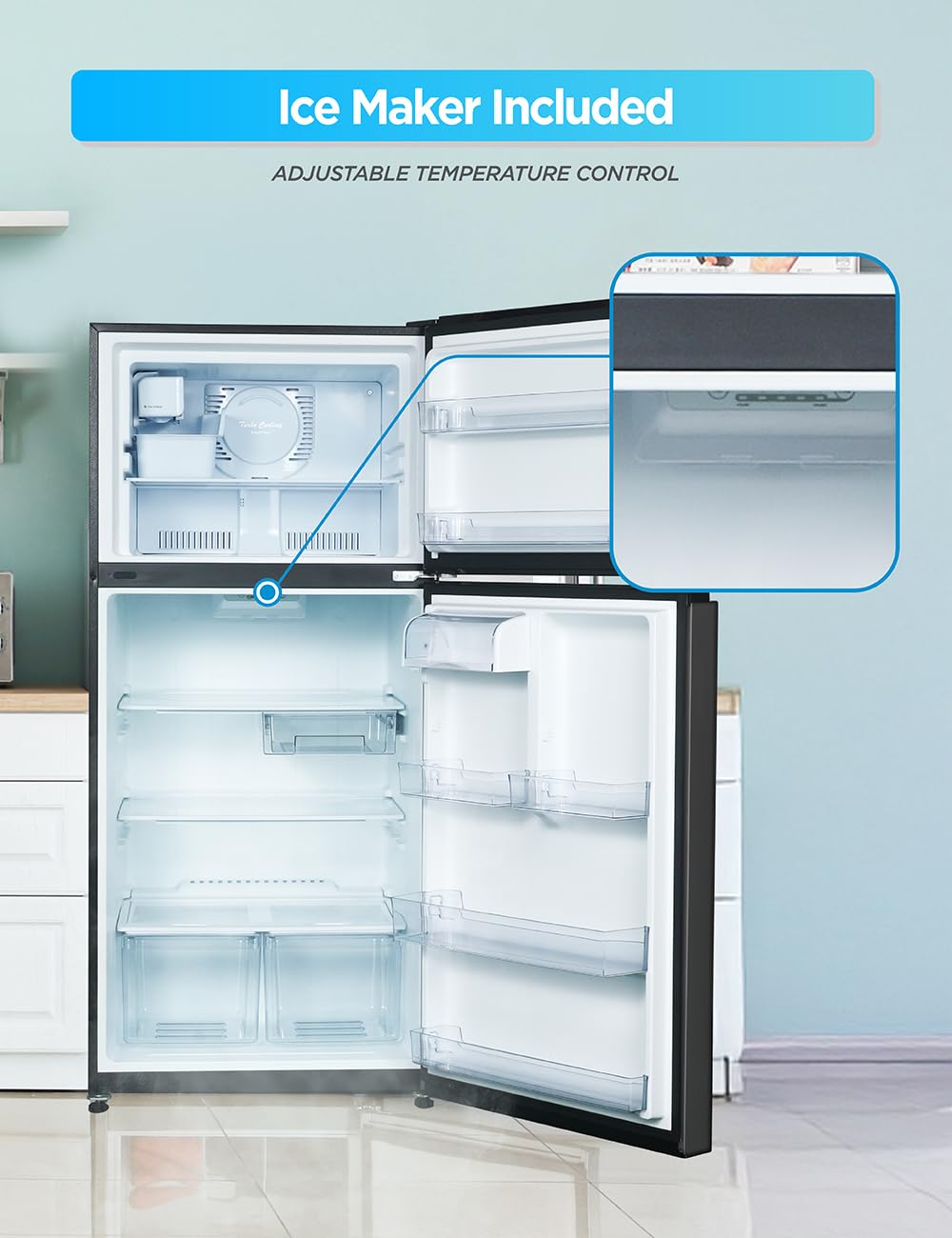 Independent Temperature Control: Maintain optimal freshness with the adjustable temperature control feature. Set the perfect climate levels for both the refrigerator and top freezer sections