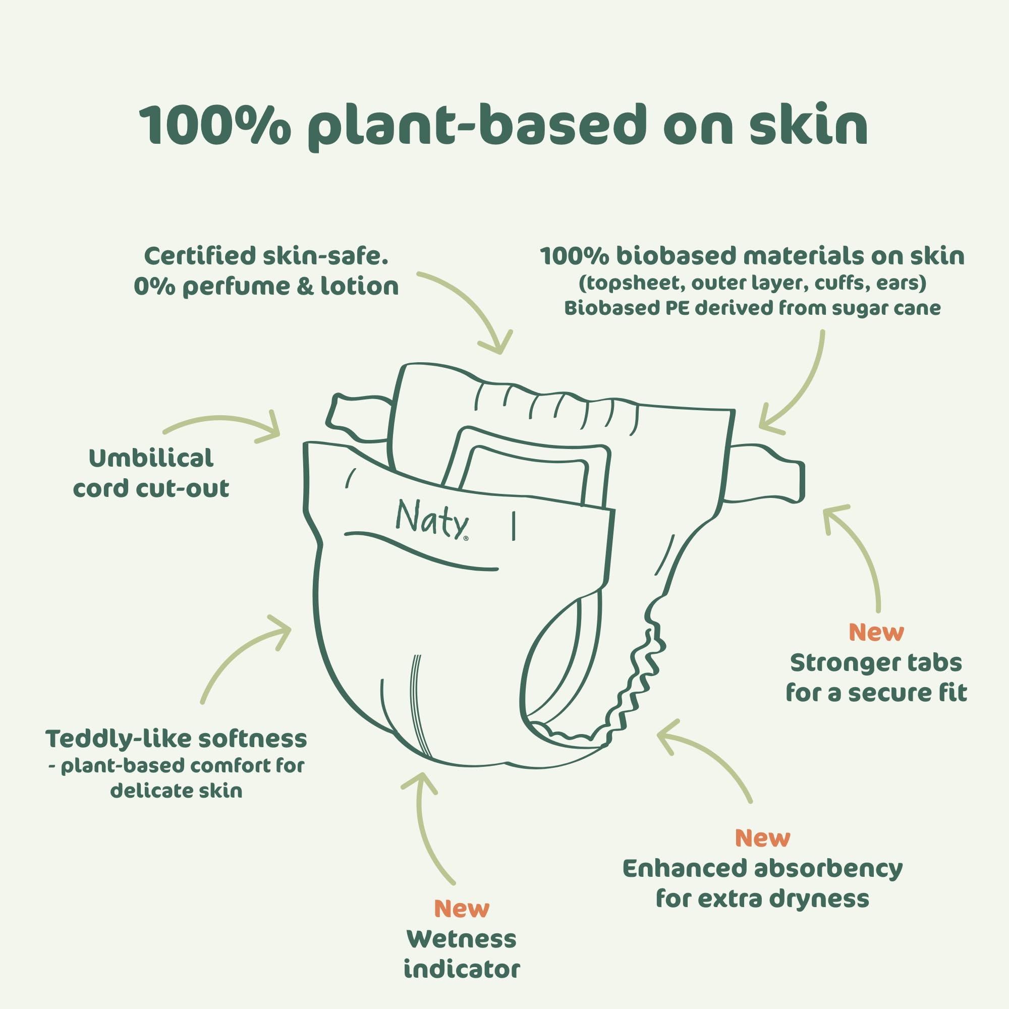 Naty BioEmbrace is our next-generation diaper—evolved from Naty’s award-winning original range to offer even better comfort, care, and absorbency. It’s the only diaper certified 100% biobased on skin (liner, outer layer, cuffs, ears), with no fossil-based plastic in contact with your baby. Super soft from day one, its plant-based surface delivers a teddy-like touch while remaining breathable and gentle. Verified to strict safety standards against 1,000+ substances incl. chlorine, PFAS, parabens, phthalates (Oeko-Tex Standard 100). Dermatologically rated “Excellent” by Dermatest. Vegan, FSC-certified, and developed in Sweden since 1994. Size 1 includes umbilical cord cut-out. Available in sizes 1–6 for comfort from newborn to toddler. Previously Eco by Naty—now simply Naty.