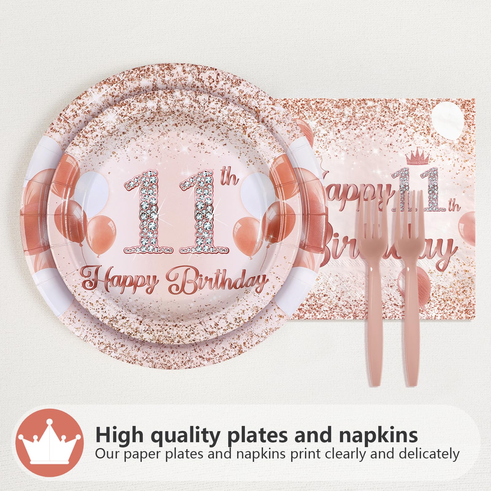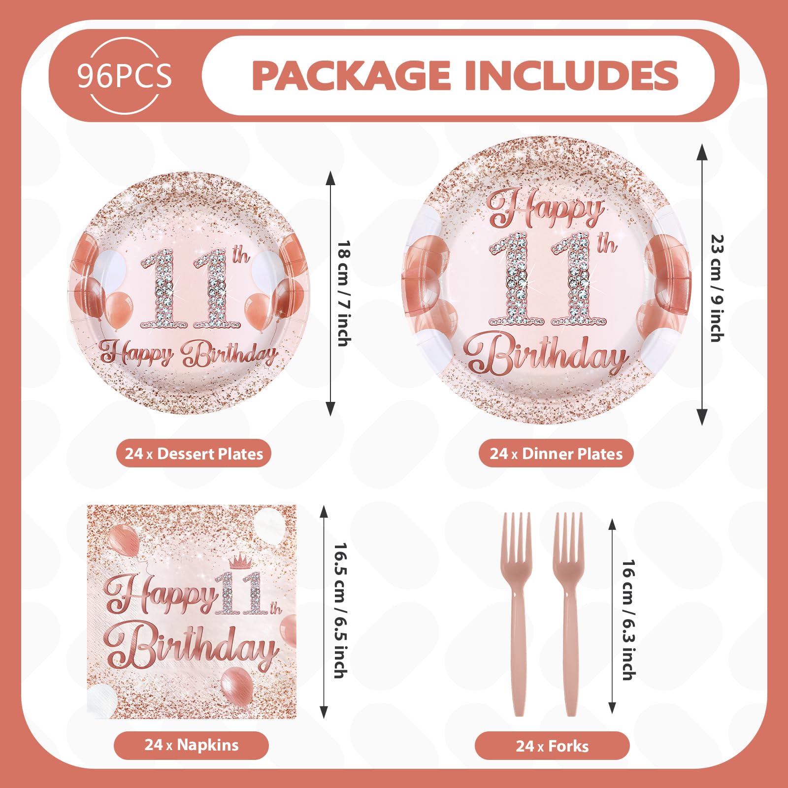 Rose Gold 11th Birthday Party Decorations: Our rose gold 11th birthday party tableware set include 24pcs official preteen 11th birthday party plates of 9'', 24pcs rose gold 11th birthday plates of 7'', 24pcs napkins of 6.5'' and 24 plastic forks. Good for celebrate girls and teen 11th birthday