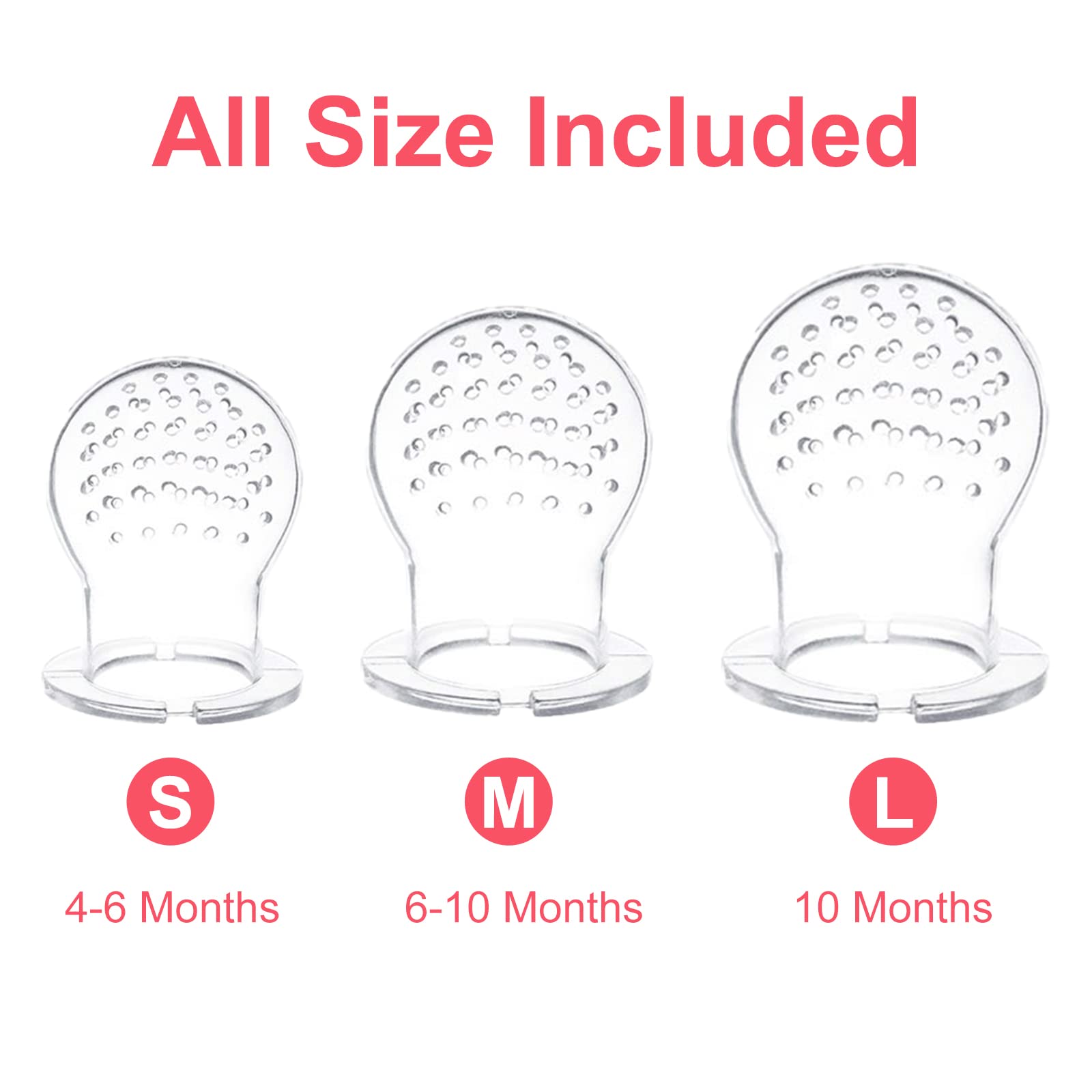 Baby Fruit Feeder Set (3 pcs feeder+6pcs extra pacifier):The baby food fresh fruit feeder pacifier set with 3 different sizes of silicone teats (S/M/L),S:can be put in fruit & vegetable ;M: pieces of fruit & vegetable ;L:minced meat or fish. the feeders are the gifts during baby weaningand ,baby can chew, suck and taste the whole food goodness, with only small pieces of fruit ,reducing the risk of choking.
