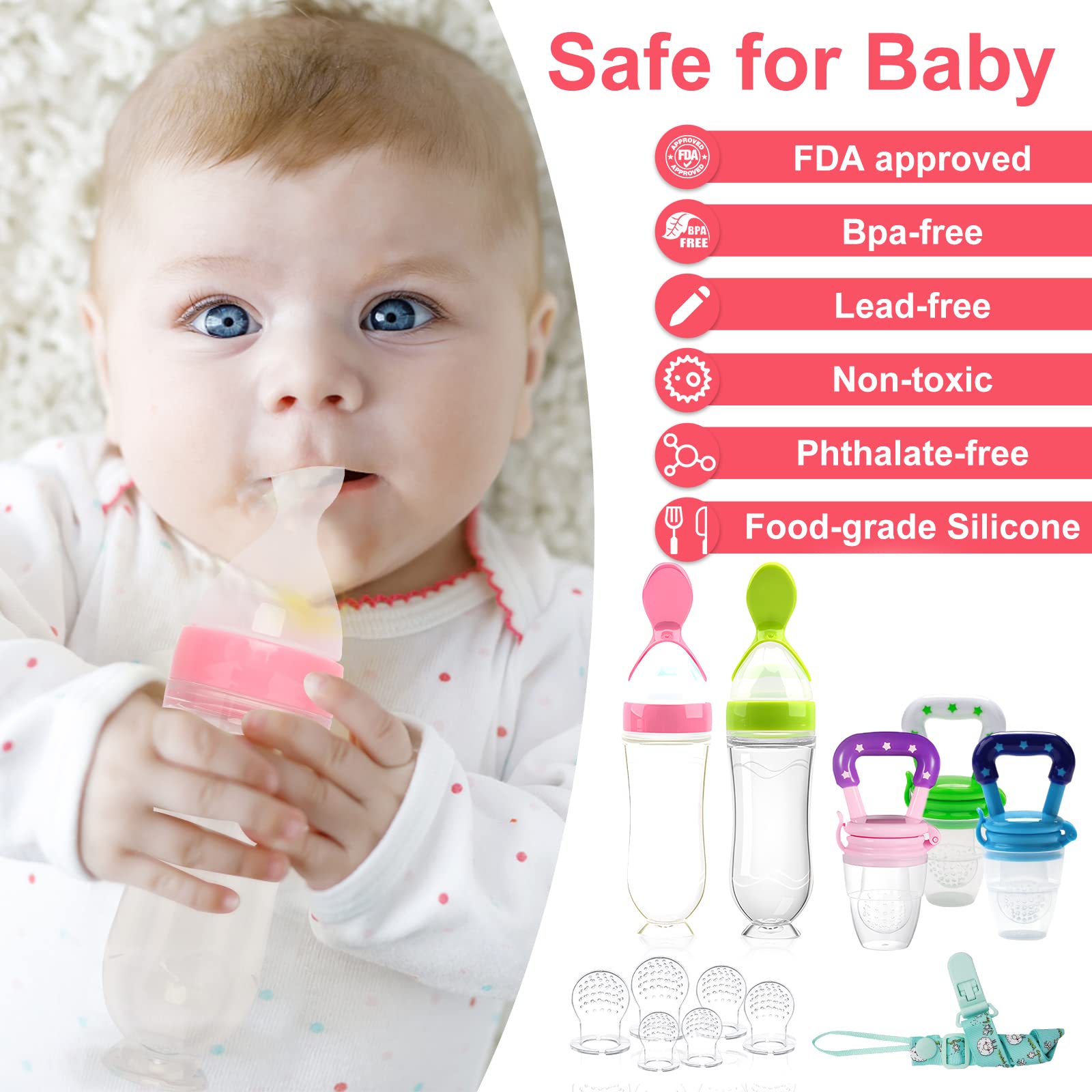 FEED SAFE&CONVENIENT--The baby food feeder and squeeze spoon feeder are made of food grade silicone, safe and non-toxic. These Silicone nipples more convenient for parents to feed babies, who can chew their food such as fresh and frozen fruits, yoghurt, ice, and breast milk, and absorb nutrients.