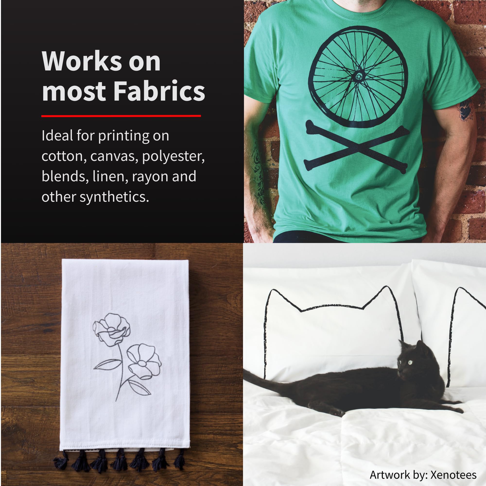 Ideal for printing on a range of fabrics, including cotton, polyester, blends, linen, rayon, and other synthetics. Also works great on paper and cardboard