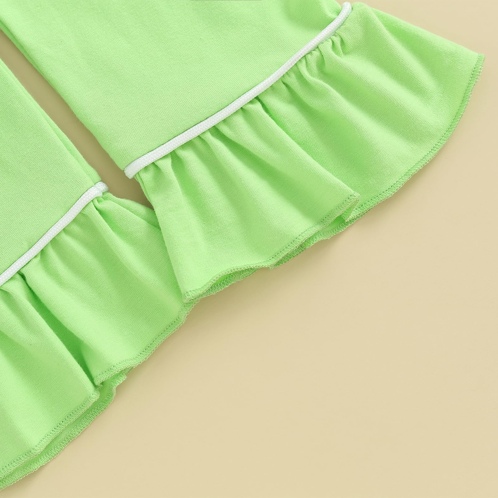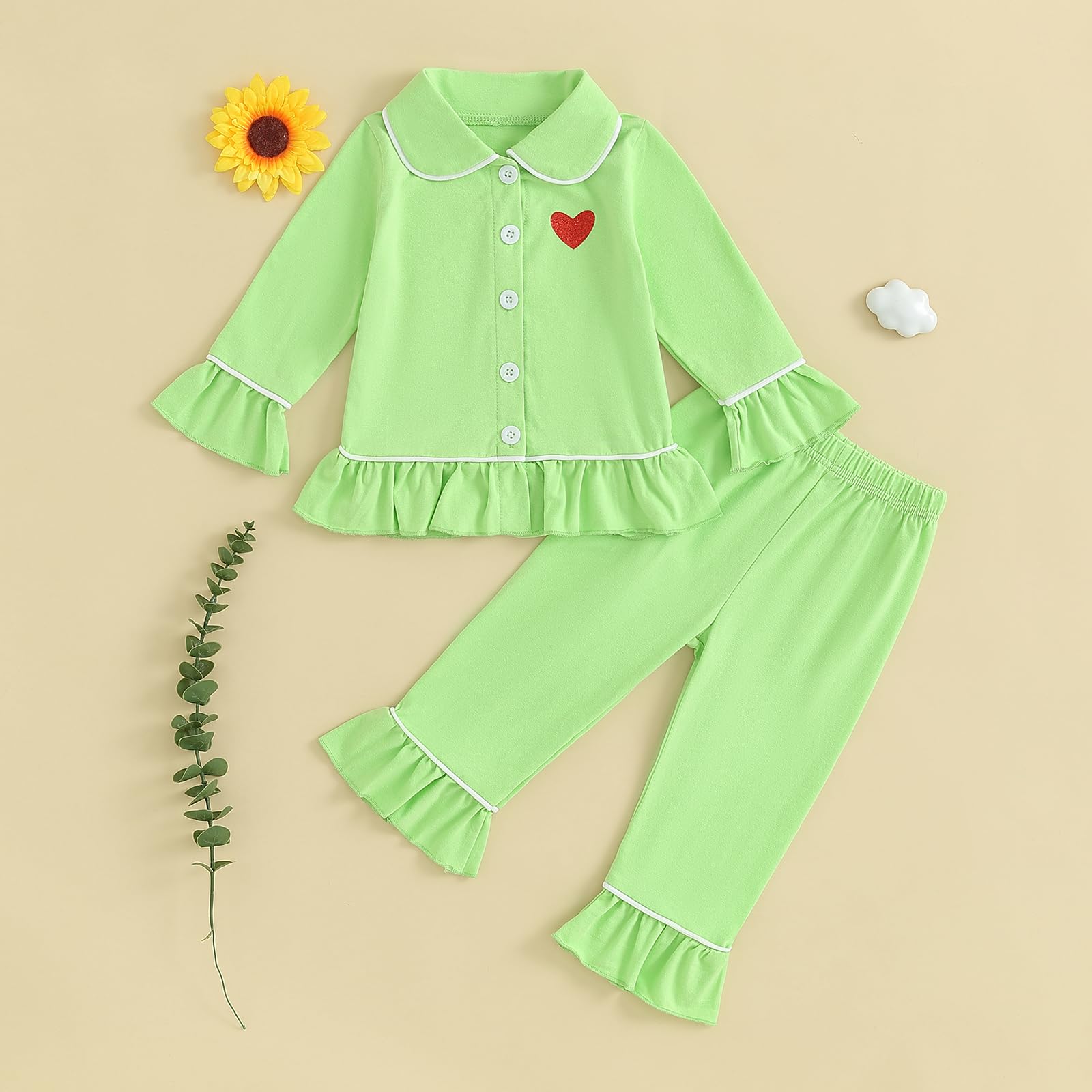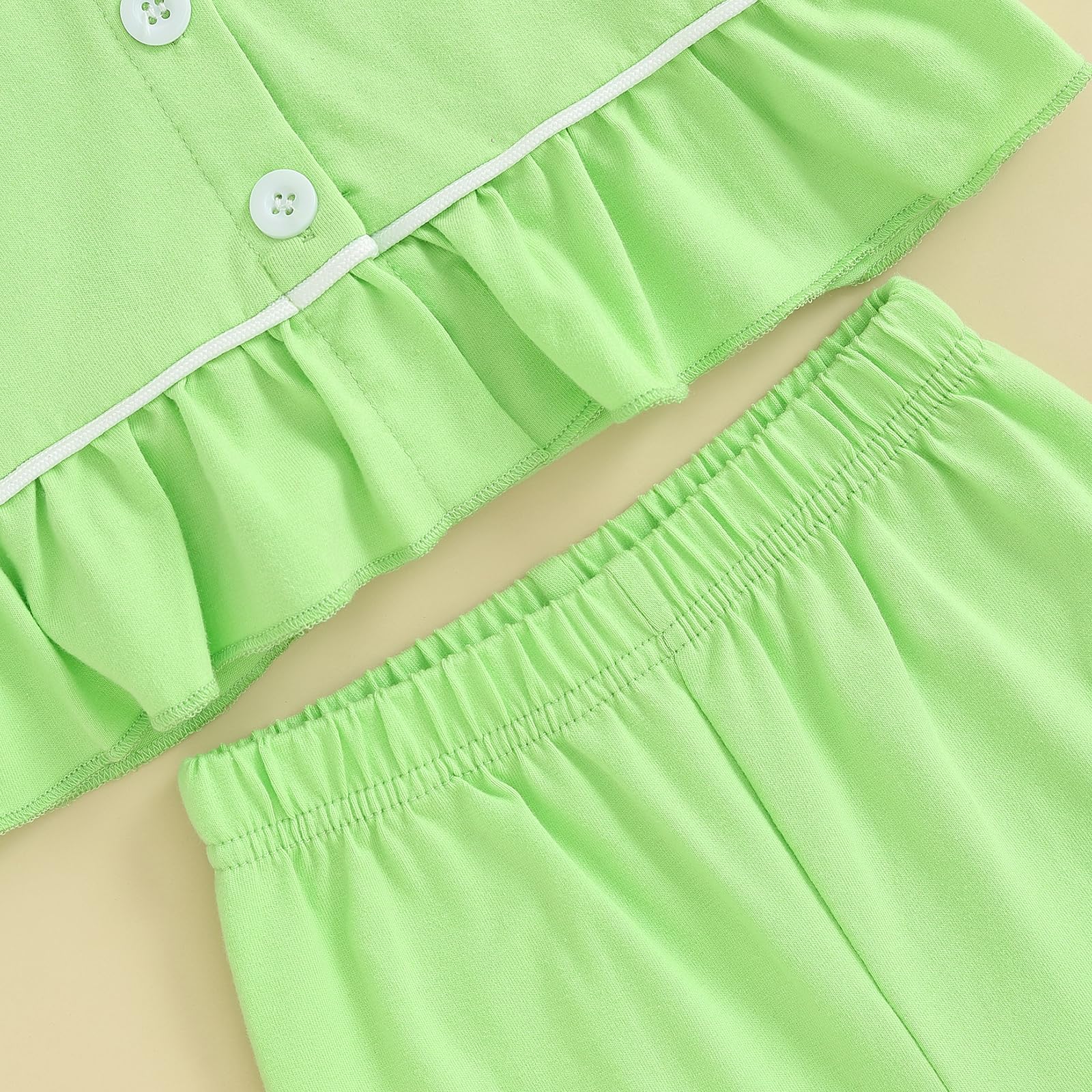 Design: Two pieces toddler girl pajamas set. Solid color, long sleeve, lapel collar, ruffle hem, button down tshirt tops, matching with elastic waistband pants, showing active and energetic style, your sweet heart will love to wear it everyday