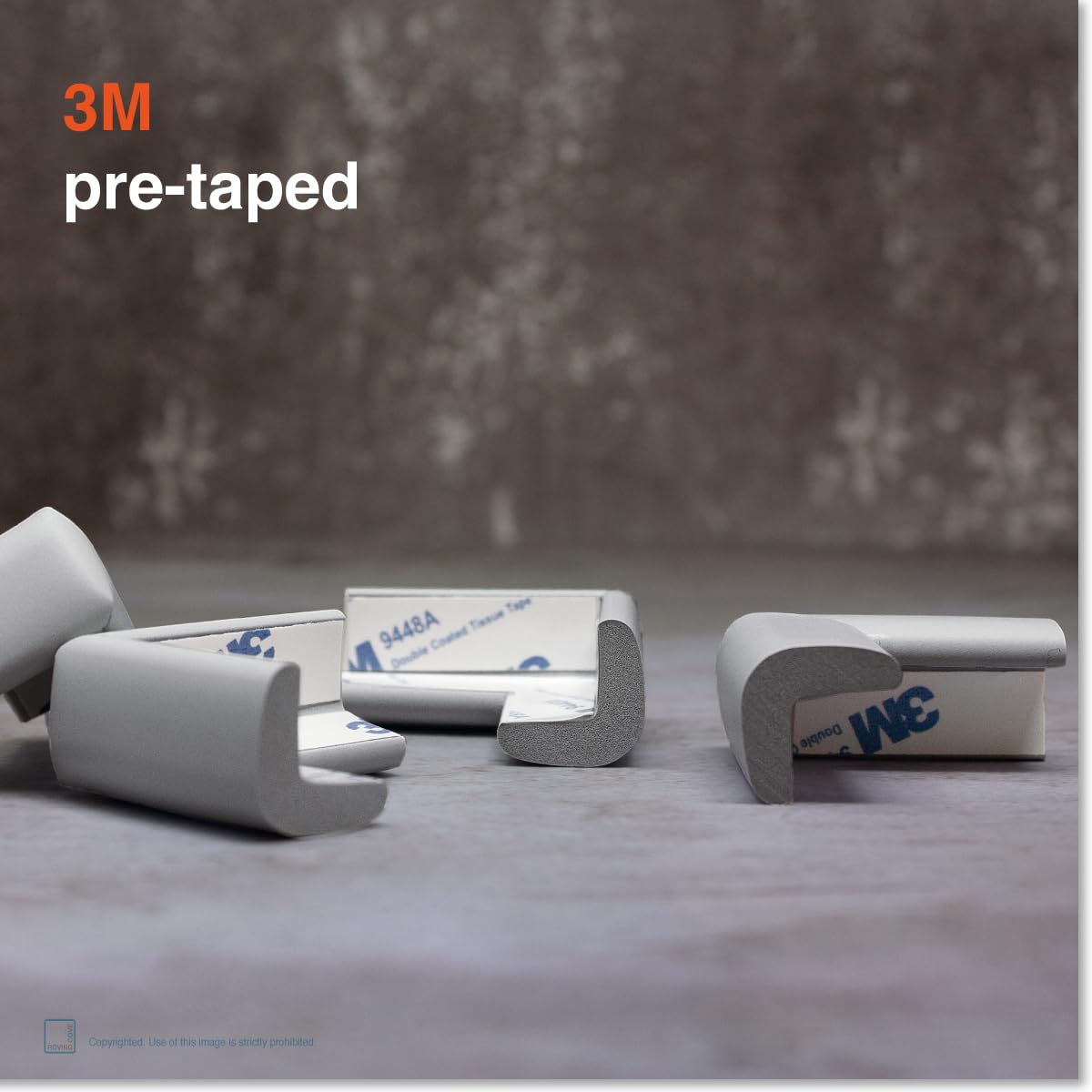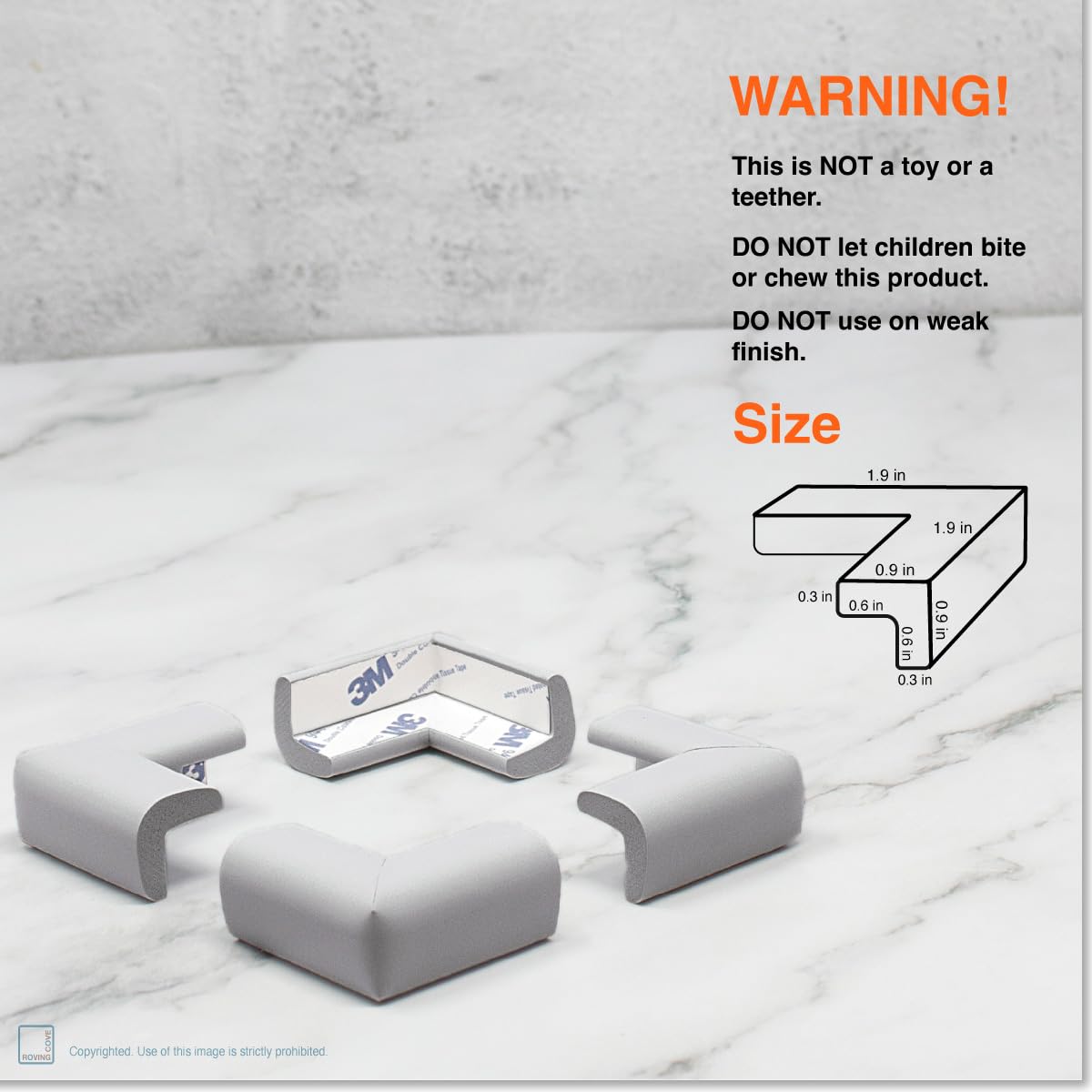 Roving Cove corner protector baby. Baby proofing corner guards for baby safety and child safety. Table corner protectors for baby, furniture, fireplace, desk, stair, shelves, bed frame and any other sharp corner in your home, office and senior facility. Soft corner guards that are pre-taped with strong 3M adhesive. Safe corner for kitchen counter, coffee table, dinning table. Made of premium rubber foam. Baby proof corner guards and corner protectors for furniture. Corner bumper guard and corner padding help prevent injury from sharp corners. Corner cushion for child proofing and safety. Works with Roving Cove table edge protectors for baby. Baby corner guards to childproof home for baby, toddler, infant and kid. Corner cover child safety used by parents, seniors, elderly, school, assisted living facility, office and day care. Grey corner guards and corner protector for baby protection.