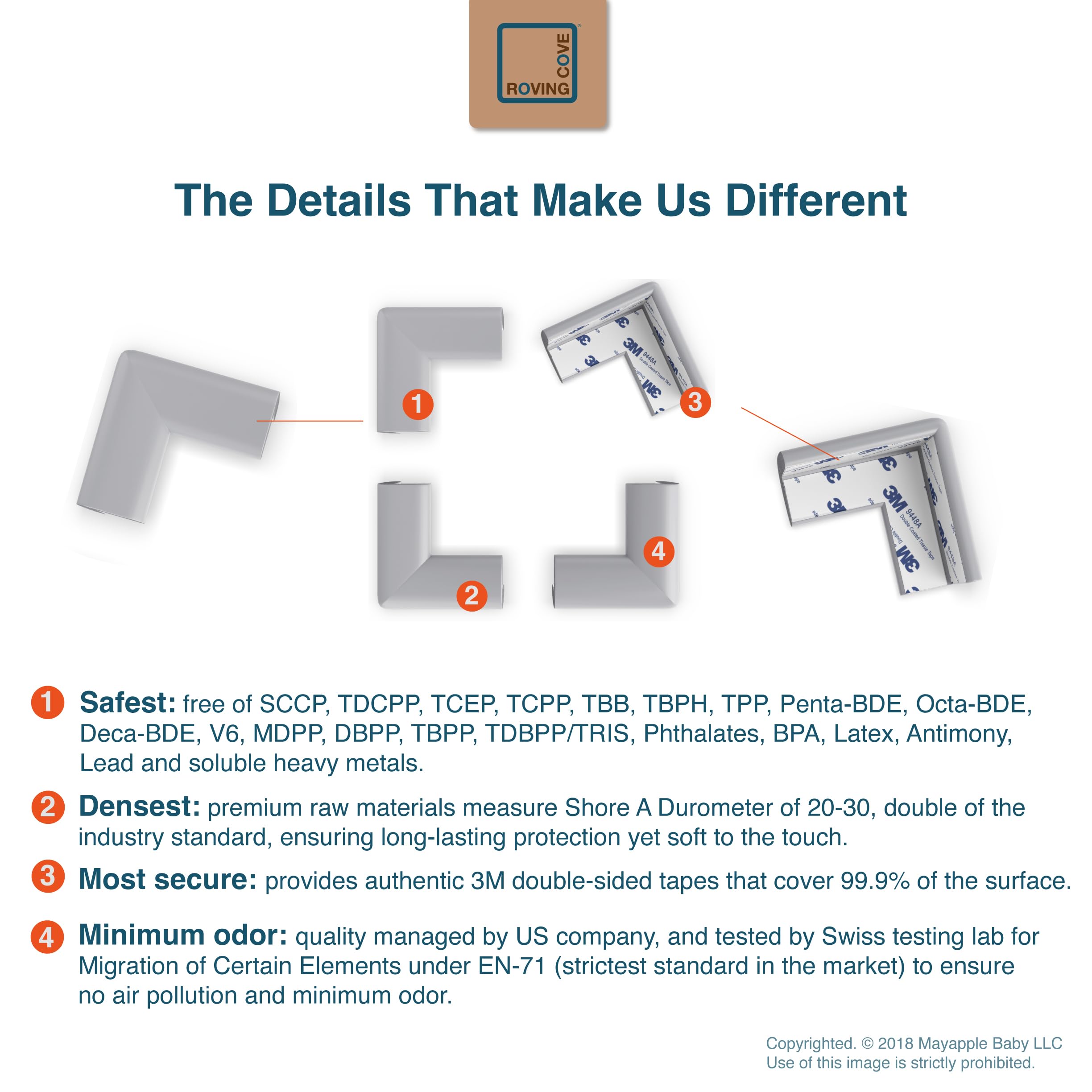 CLEAN SAFETY: Roving Cove uses safe and pure raw material and was the first brand to make foam safety bumpers without the use of toxic flame-retardant chemicals (SCCPs). Our corner protector contains no BPA, no phthalates, no heavy metals, no latex, no SCCPs. Inherently flame-resistant; passed flammability tests under US regulations.