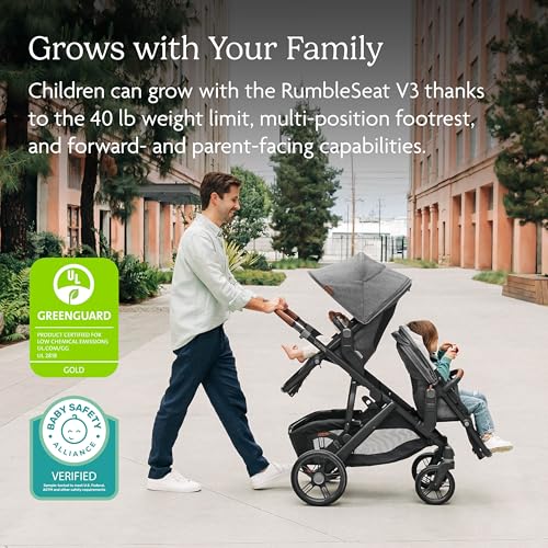 Comfort meets convenience with the RumbleSeat V3. Easily attach this second seat to your Vista with the large hubs and adapters, offering a simple and intuitive experience for parents. Children can grow with the RumbleSeat V3 thanks to the 40 lb/18.1 kg weight limit (NA only), multi-position footrest, and forward- and parent-facing capabilities. With an All-Weather Comfort Seat, large frame, and height-adjustable canopy, the RumbleSeat V3 is the perfect, multitasking stroller seat solution for growing families in any season and stage.