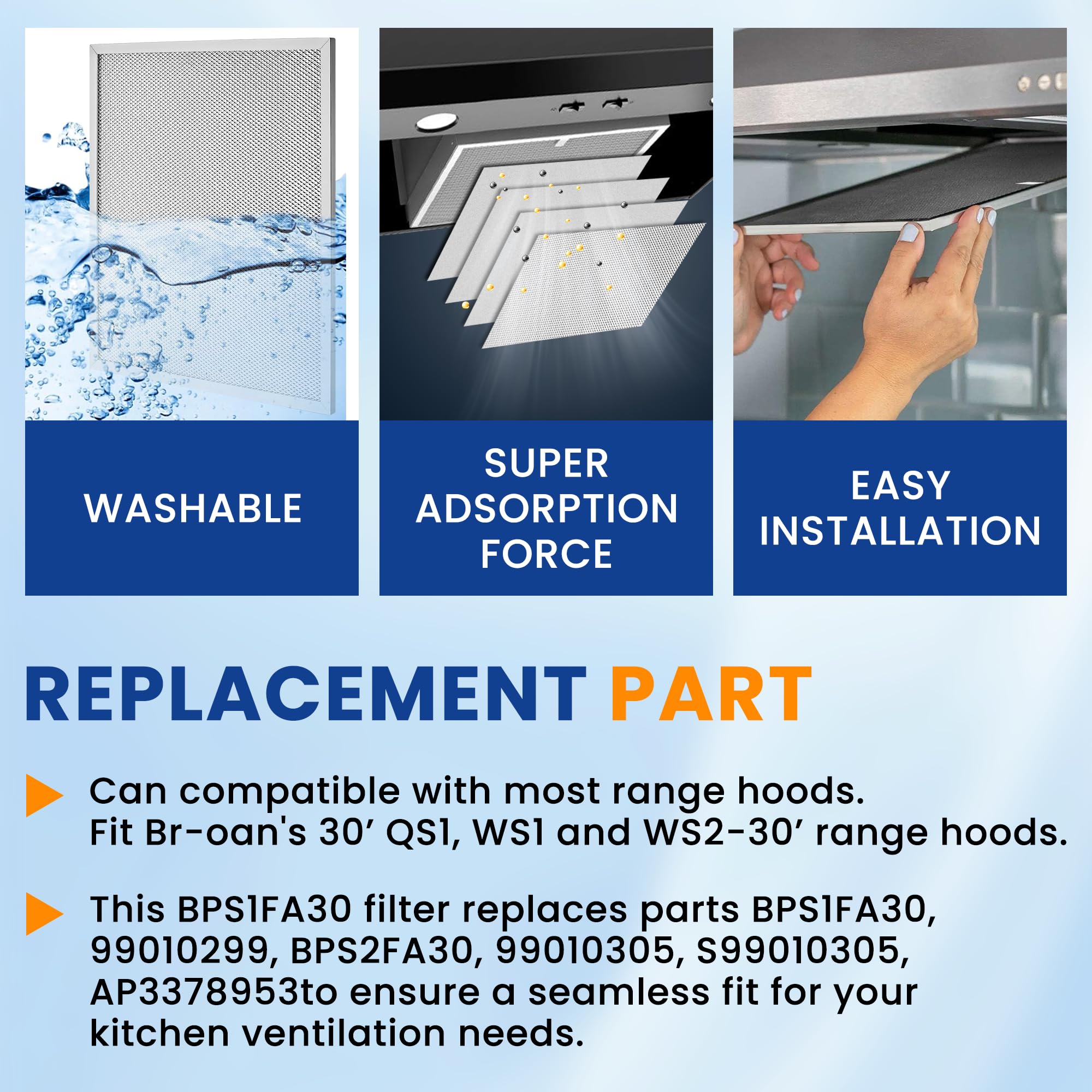 【Replace and Compatibility】: The BPS1FA30 range hood filter measures 11-3/4" x 14-1/4" x 3/8", prefect fit Br-oan's 30’ QS1, WS1 and WS2-30’ range hoods. This allure range hood filter replacement replaces parts BPS1FA30, 99010299, BPS2FA30, 99010305, S99010305, AP3378953 to ensure a seamless fit for your kitchen ventilation needs