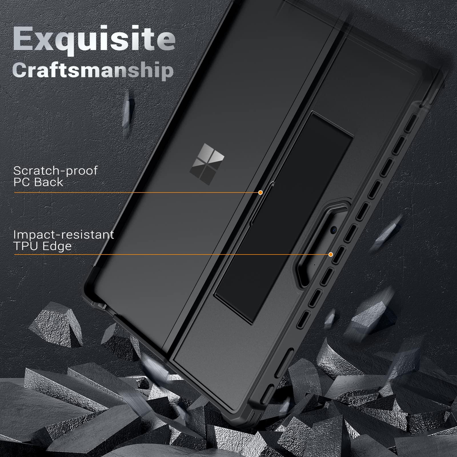 COMFORTABLE WORKING EXPERIENCE: With channel for directly connecting to Microsoft Surface Pro 11, Pro 10, Pro 9 type cover keyboard for an instant so that the user can use it without removing the case. The reserved back cutout allows the user to adjust Microsoft Surface Pro 11, Pro 10, Pro 9 tablet kickstand freely to find the best viewing angle, writing angle or typing angle.