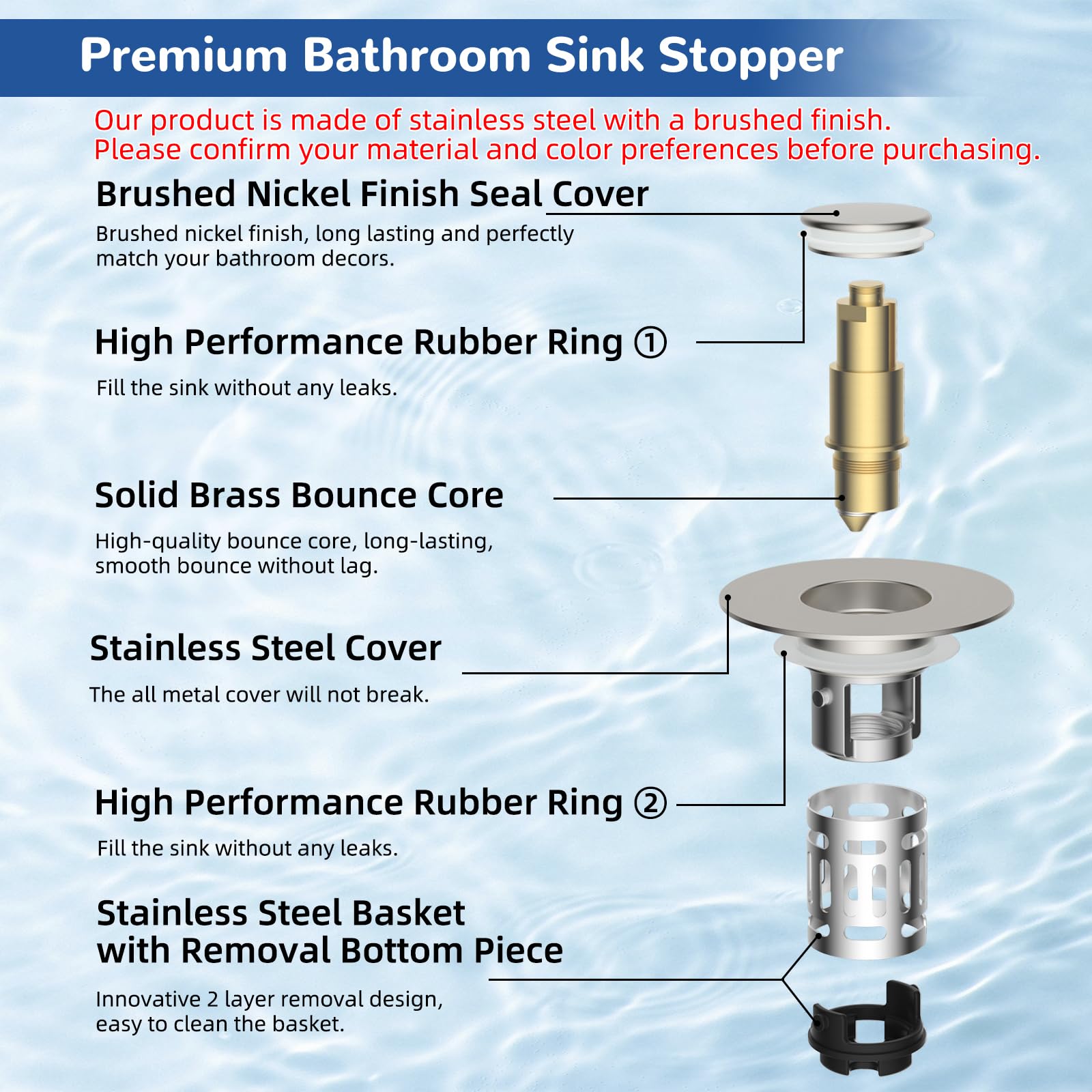 [Pop-up Design] Our pop-up sink drain strainer is made of high-quality stainless steel, plastic, and solid brass, providing exceptional rebound strength, corrosion resistance, and long-lasting durability. It features a long-lasting and sensitive pop-up brass bullet core mechanism, allowing you to easily switch between the water storage and fast drainage modes with just a gentle press