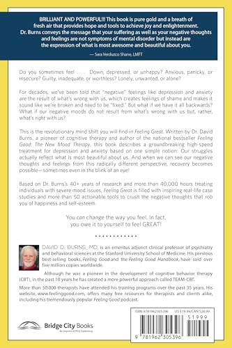 Do you sometimes feel . . . Down, depressed, or unhappy? Anxious, panicky, or insecure? Guilty, inadequate, or worthless? Lonely, unwanted, or alone? For decades, we've been told that "negative" feelings like depression and anxiety are the result of what's wrong with us, which creates feelings of shame and makes it sound like we're broken and need to be "fixed." But what if we have it all backwards? What if our negative moods do not result from what's wrong with us but, rather, what's right with us? This is the revolutionary mind shift you will find in Feeling Great. Written by Dr. David Burns, a pioneer of cognitive therapy and author of the national bestseller Feeling Good: The New Mood Therapy, this book describes a groundbreaking high-speed treatment for depression and anxiety based on one simple notion: Our struggles actually reflect what is most beautiful about us. And when we can see our negative thoughts and feelings from this radically different perspective, recovery becomes possible-sometimes even in the blink of an eye! Based on Dr. Burns's 40+ years of research and more than 40,000 hours treating individuals with severe mood issues, Feeling Great is filled with inspiring real-life case studies and more than 50 actionable tools to crush the negative thoughts that rob you of happiness and self-esteem. You can change the way you feel. In fact, you owe it to yourself to feel GREAT!