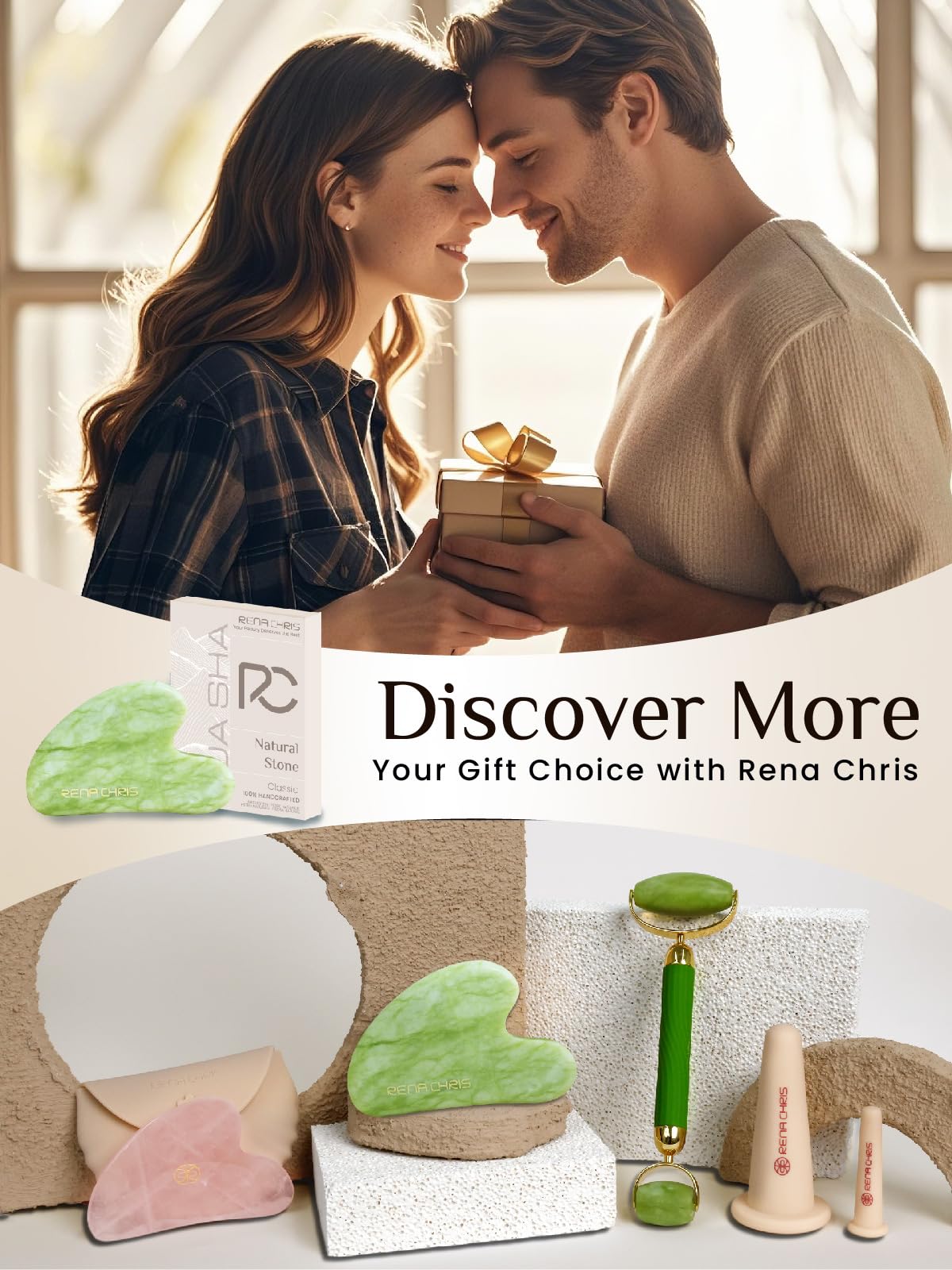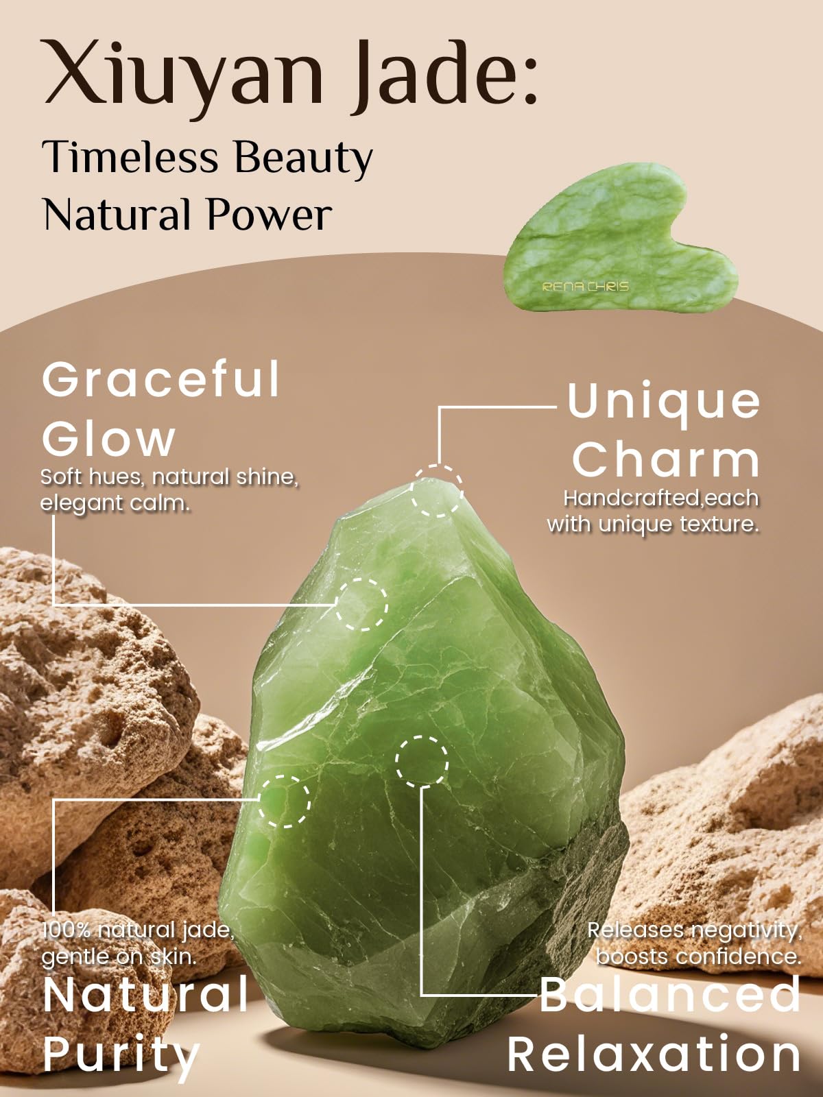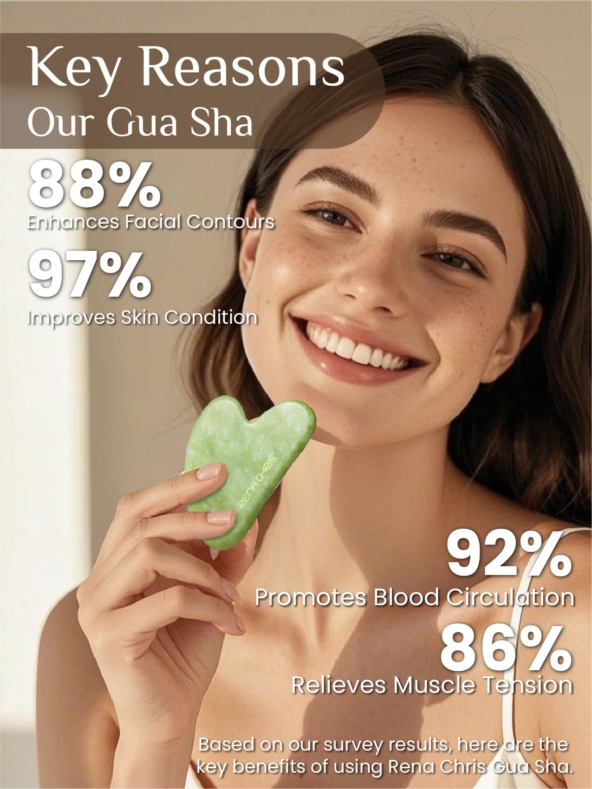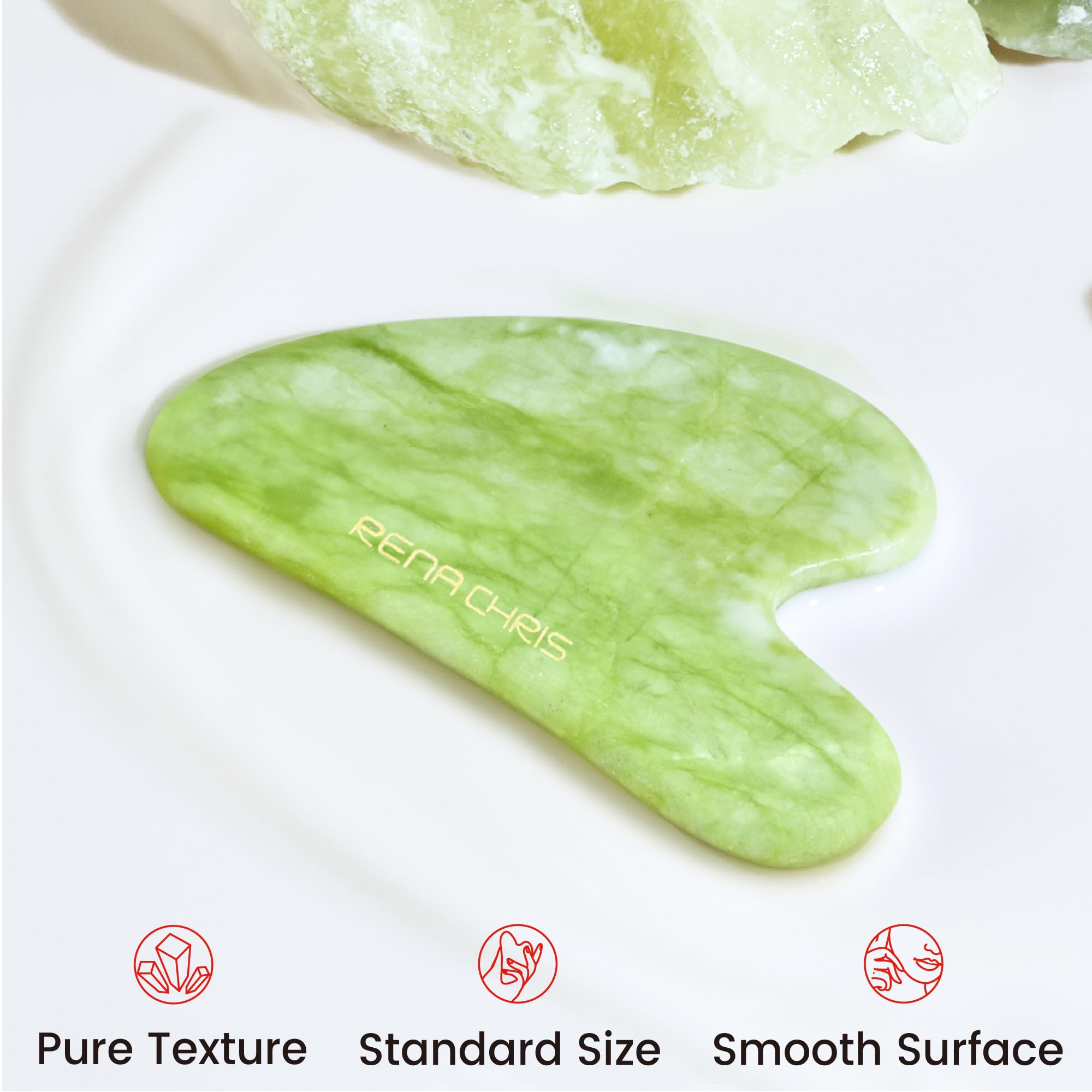 NATURAL MATERIALS: The Rena Chris gua sha tools are crafted from natural jade stone. The guasha stone is celebrated for promoting tranquility, balancing emotions, and enhancing well-being, making it an ideal choice for your self-care rituals